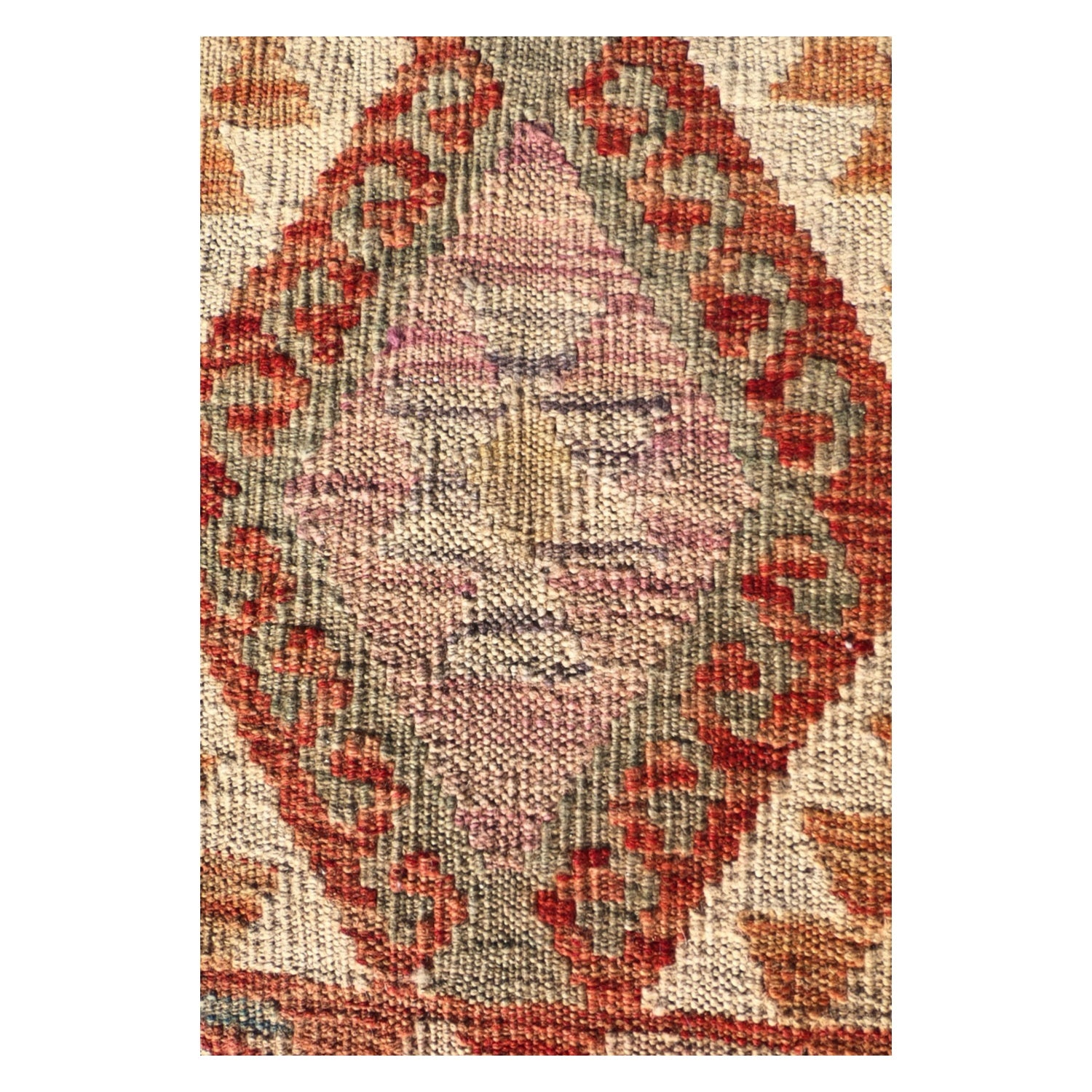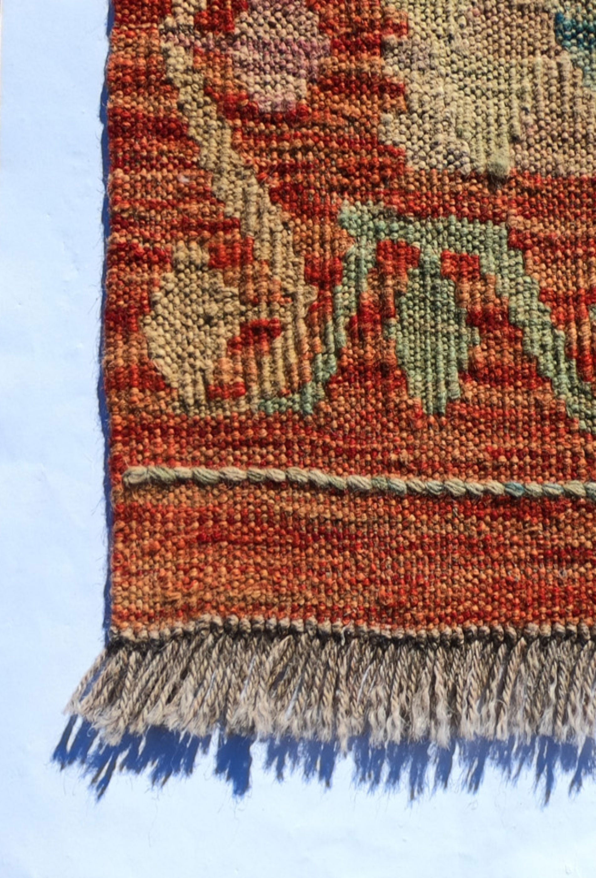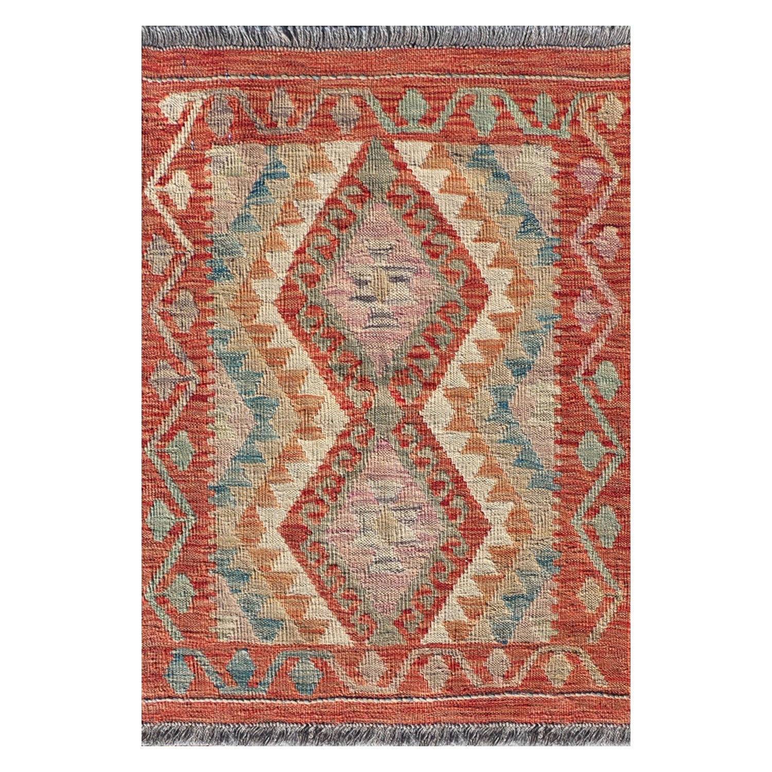 Alfombra de lana tejida en telar de origen Pakistaní, teñida con tintes naturales. Fabricada según la técnica tradicional de tejido de fisura. Esta alfombra se caracteriza por su tejido plano, diseños geométricos y gran colorido.