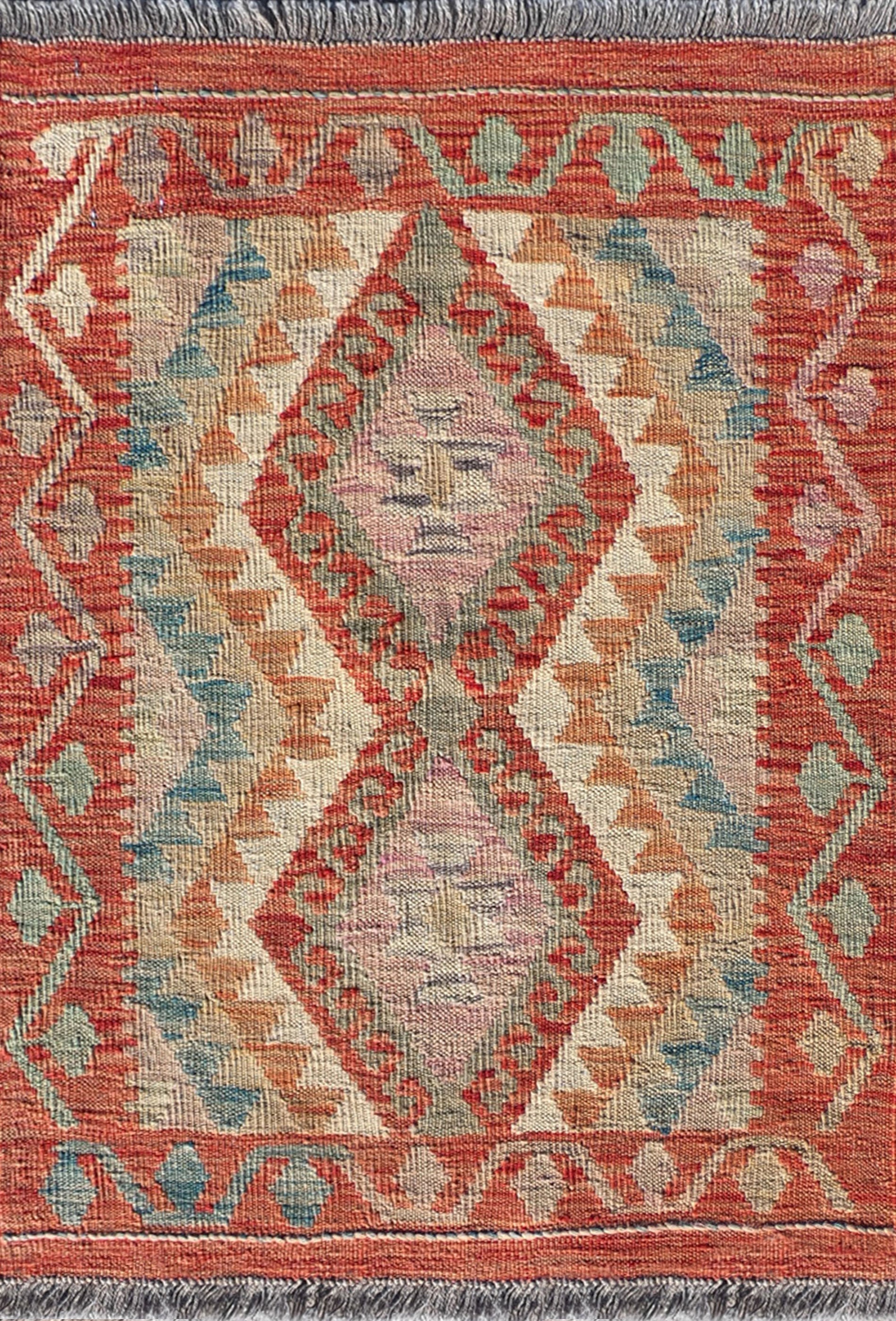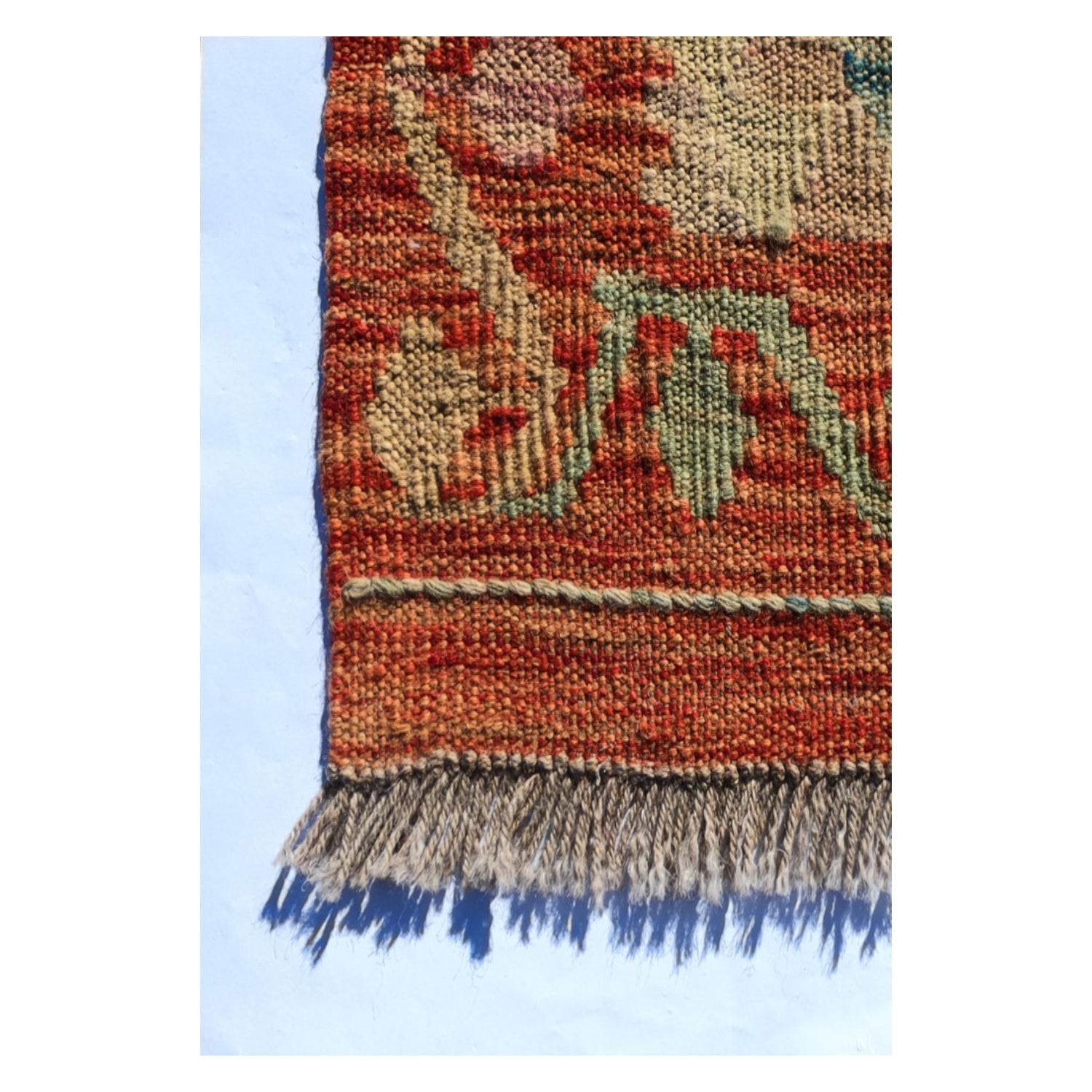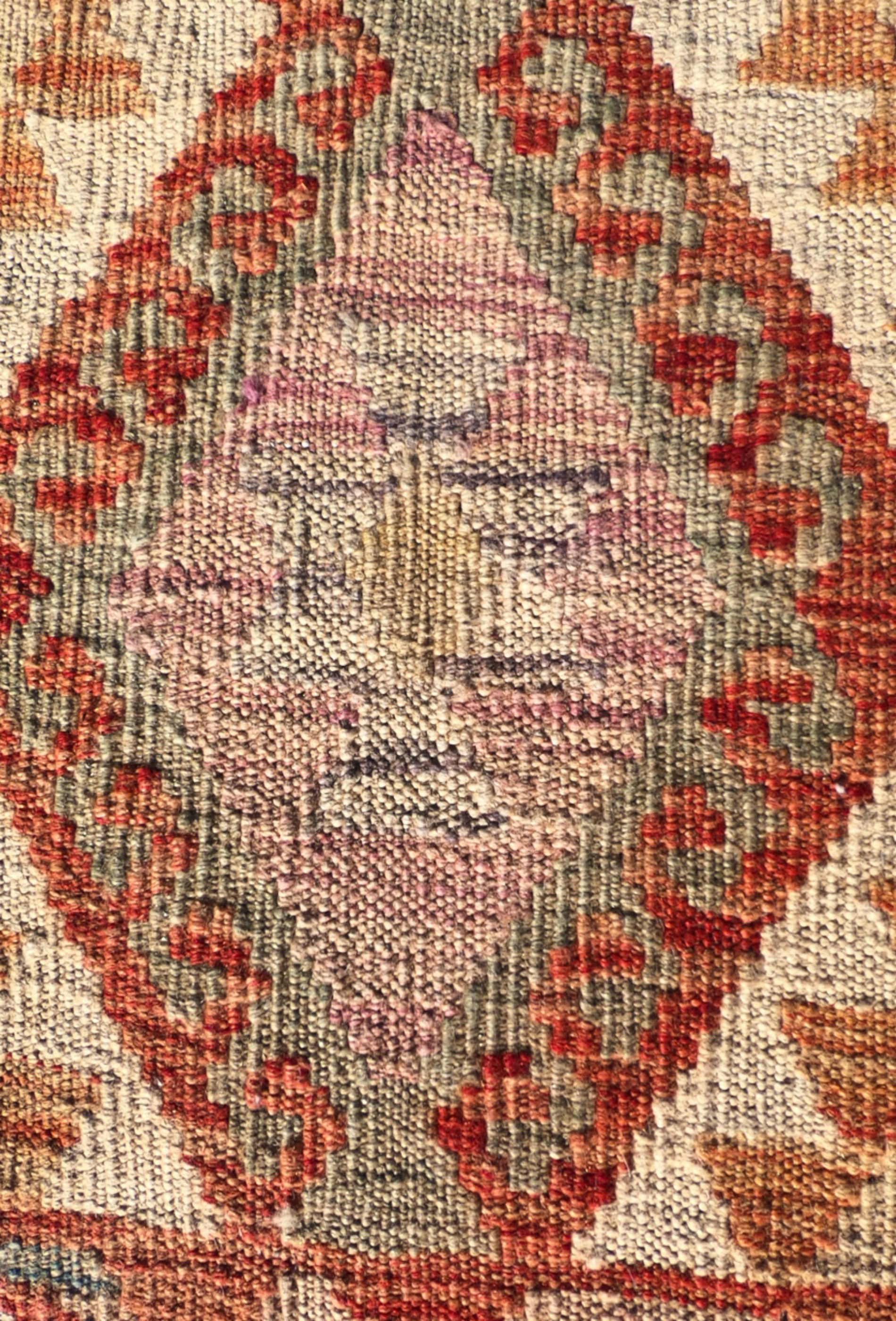 Alfombra de lana tejida en telar de origen Pakistaní, teñida con tintes naturales. Fabricada según la técnica tradicional de tejido de fisura. Esta alfombra se caracteriza por su tejido plano, diseños geométricos y gran colorido.