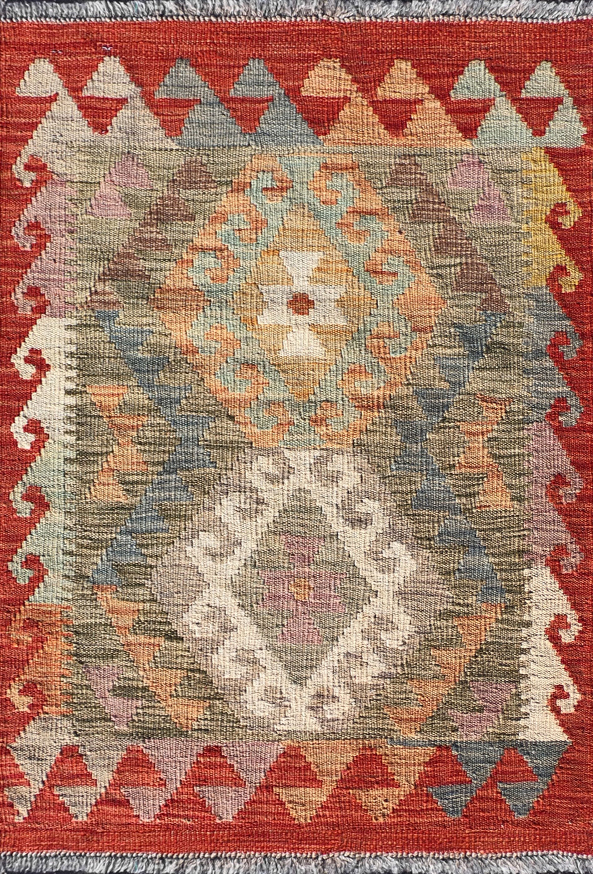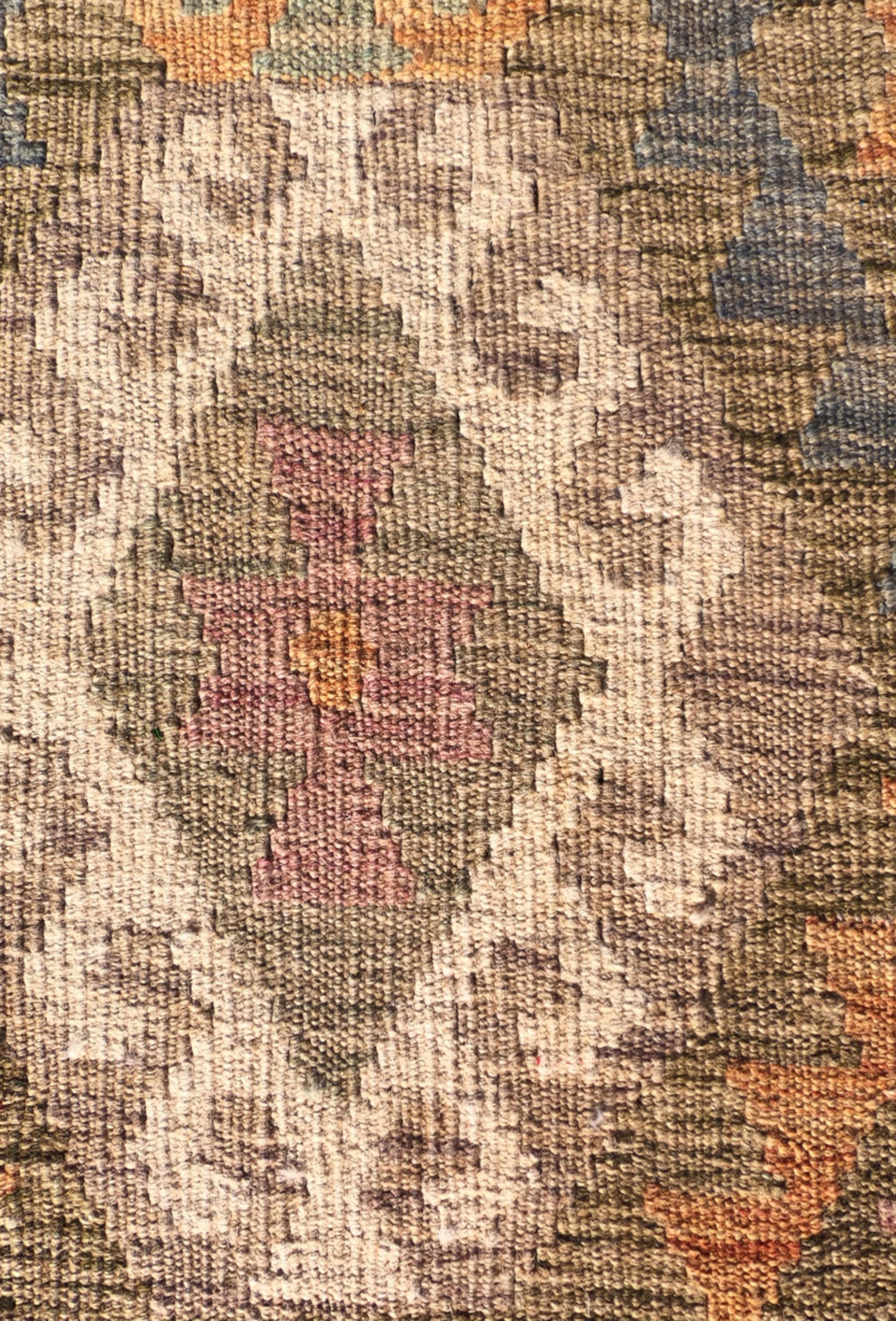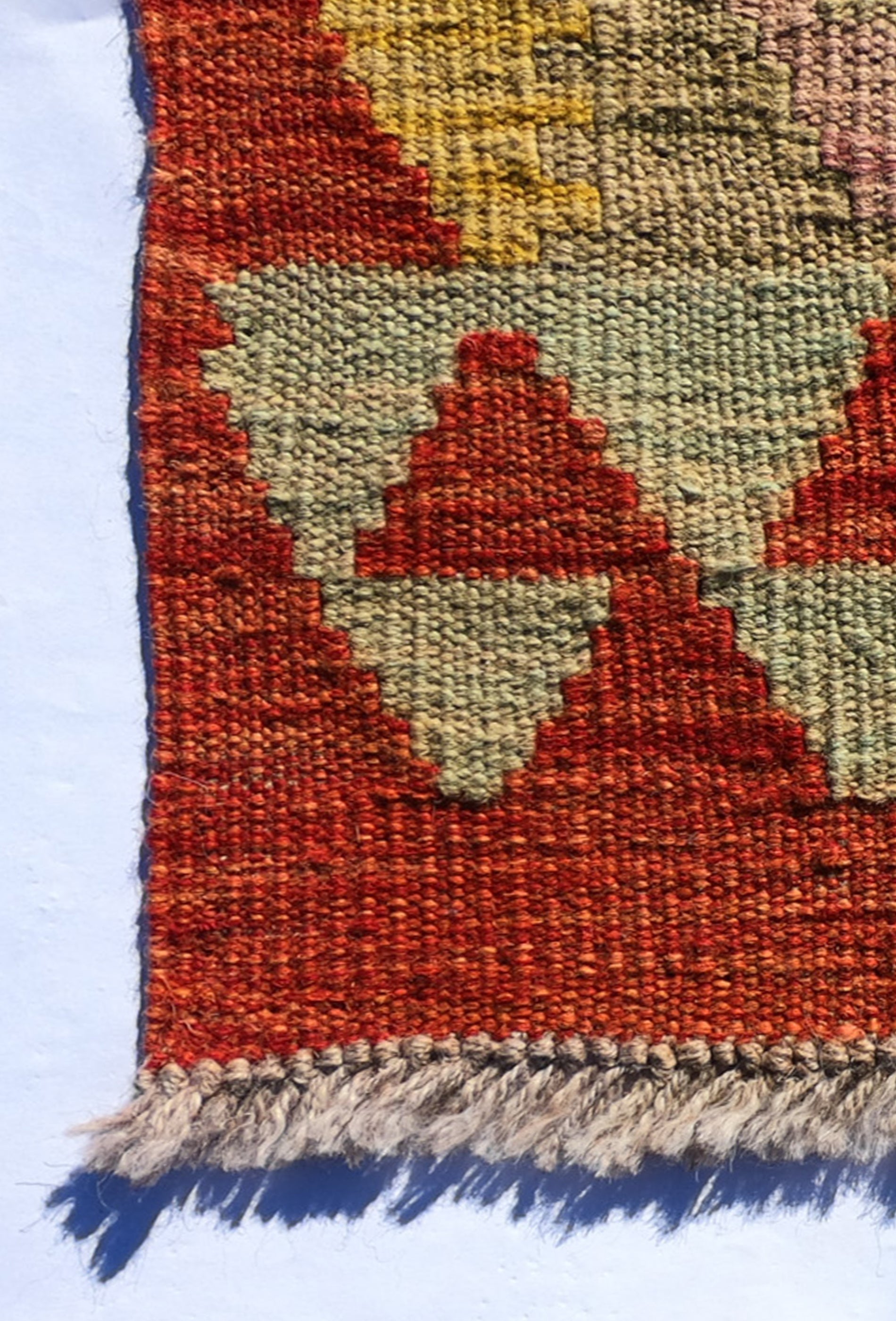 Alfombra de lana tejida en telar de origen Pakistaní, teñida con tintes naturales. Fabricada según la técnica tradicional de tejido de fisura. Esta alfombra se caracteriza por su tejido plano, diseños geométricos y gran colorido.