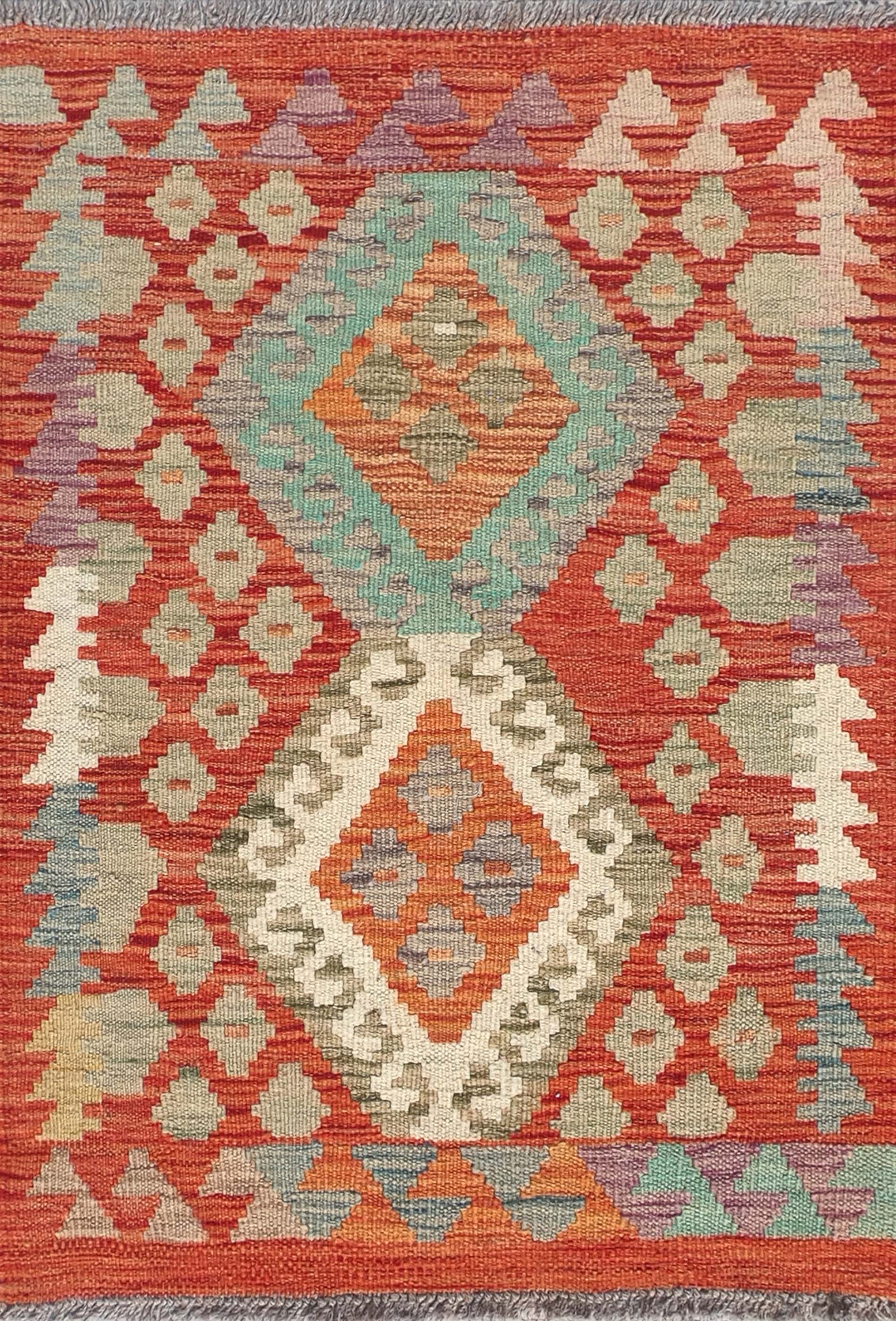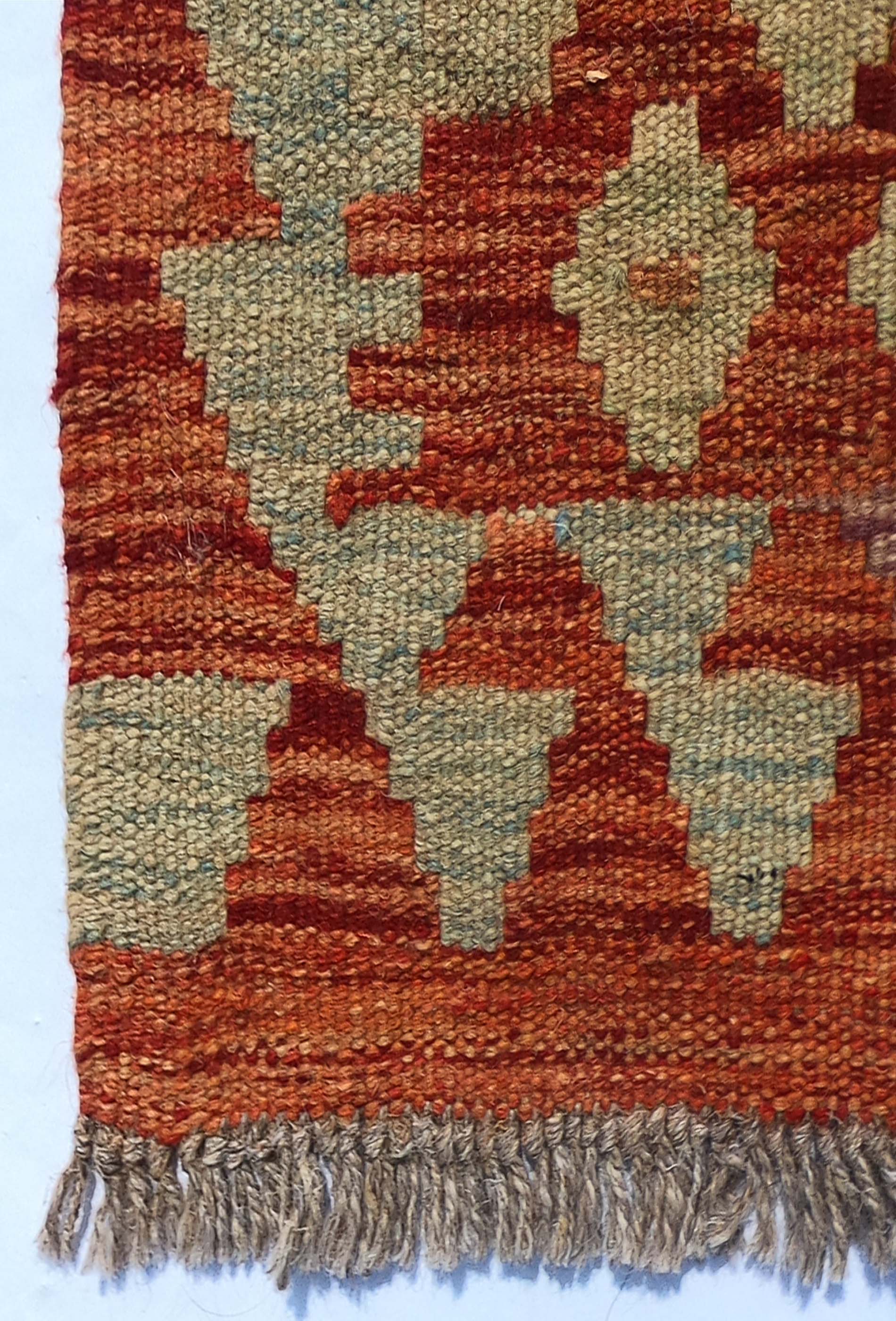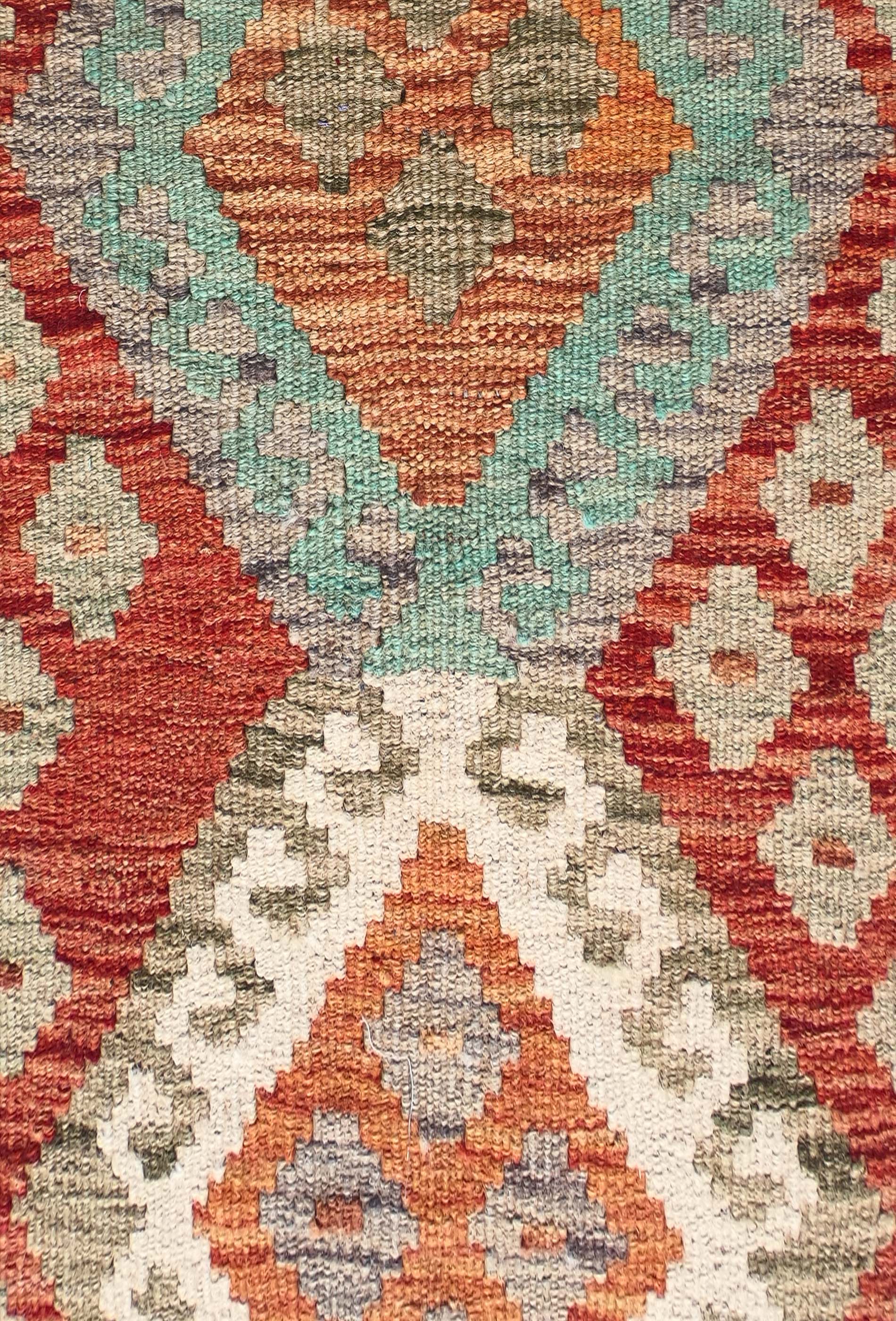 Alfombra de lana tejida en telar de origen Pakistaní, teñida con tintes naturales. Fabricada según la técnica tradicional de tejido de fisura. Esta alfombra se caracteriza por su tejido plano, diseños geométricos y gran colorido.