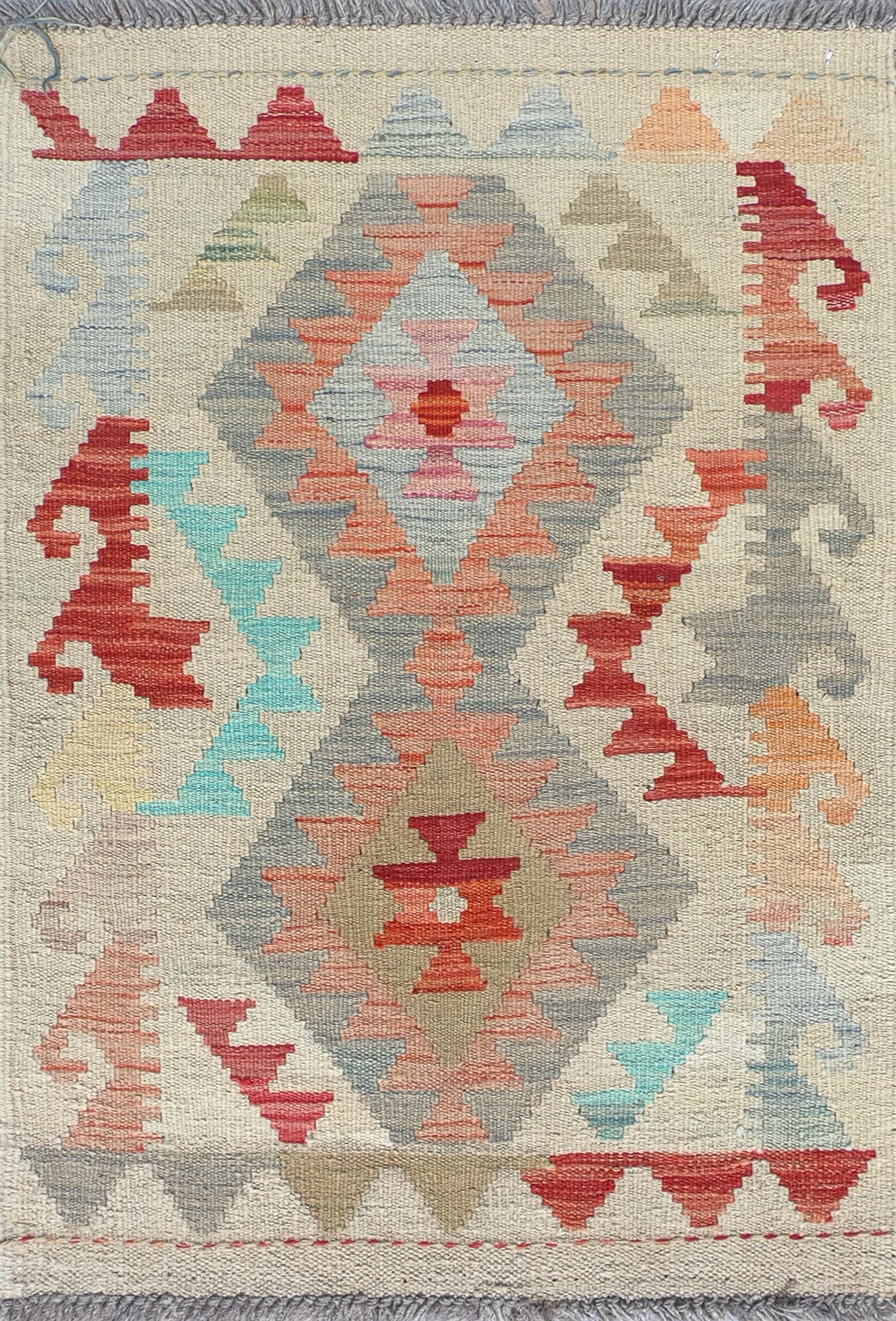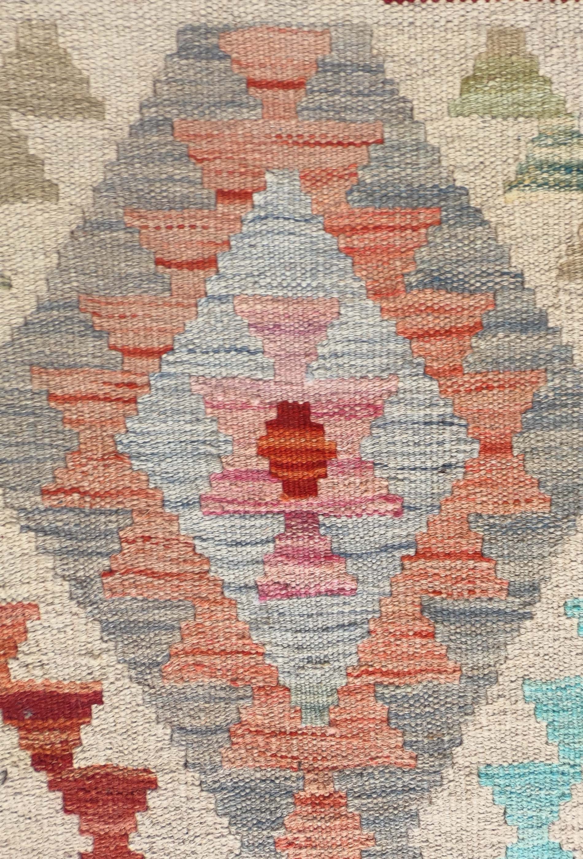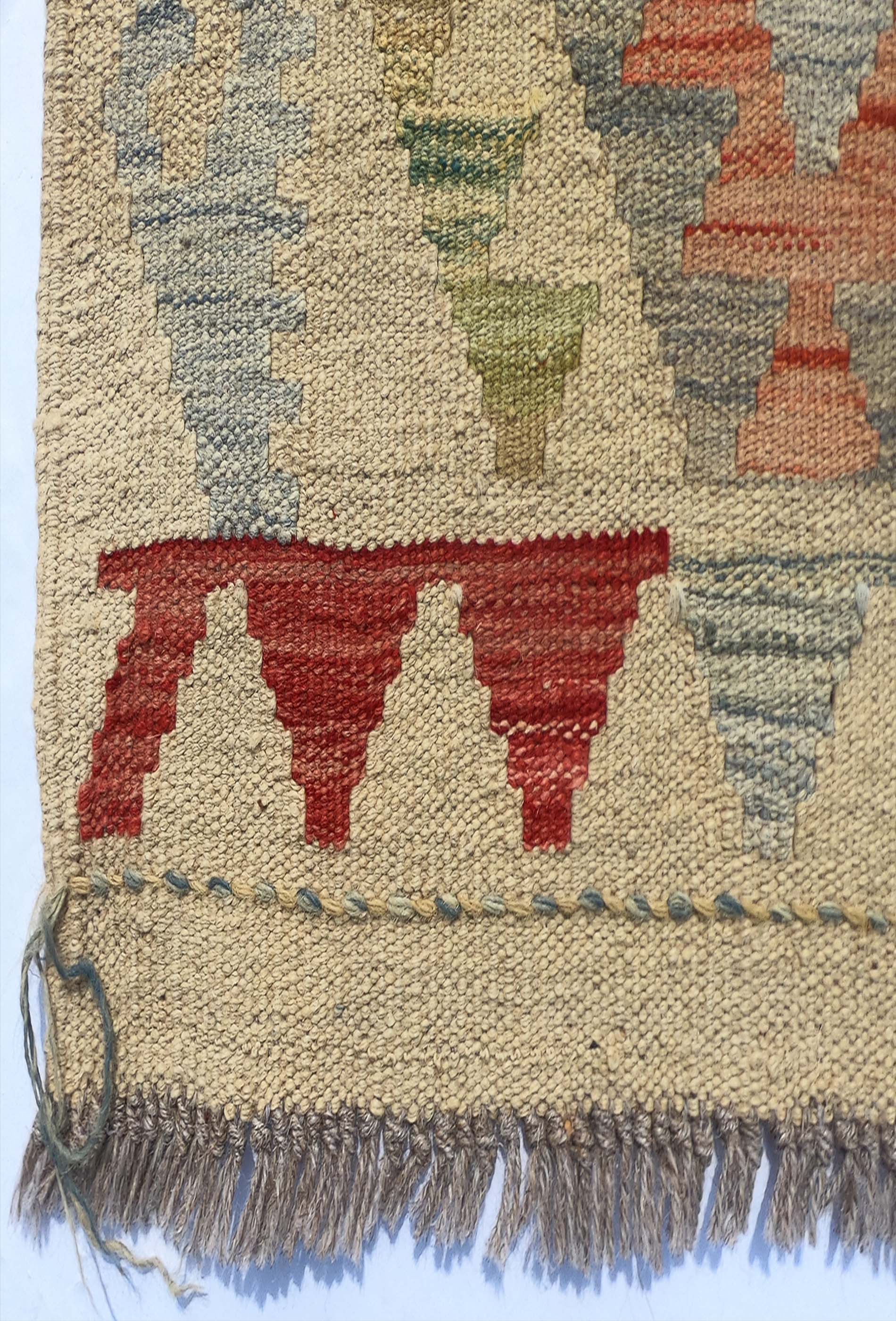 Alfombra de lana tejida en telar de origen Pakistaní, teñida con tintes naturales. Fabricada según la técnica tradicional de tejido de fisura. Esta alfombra se caracteriza por su tejido plano, diseños geométricos y gran colorido.