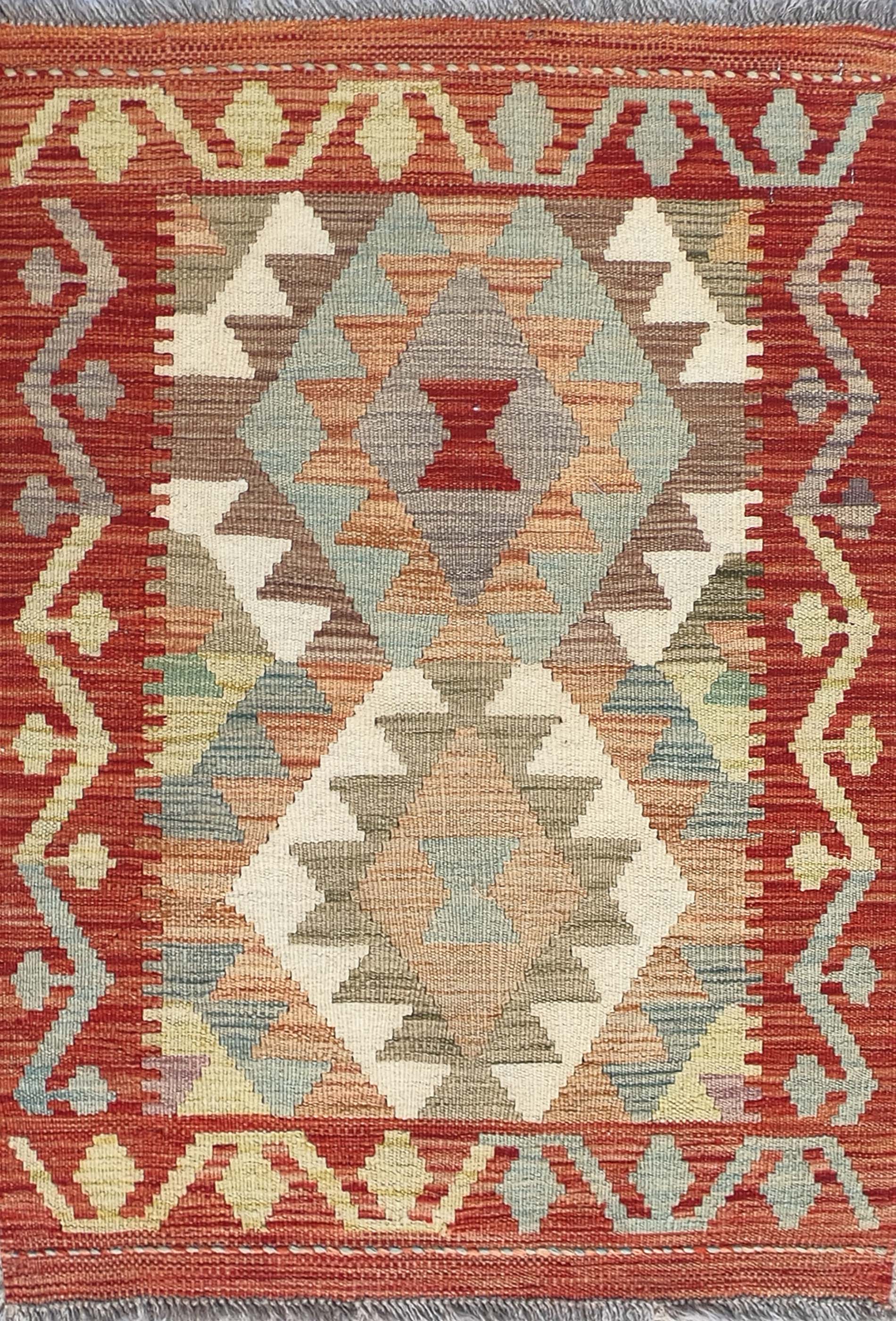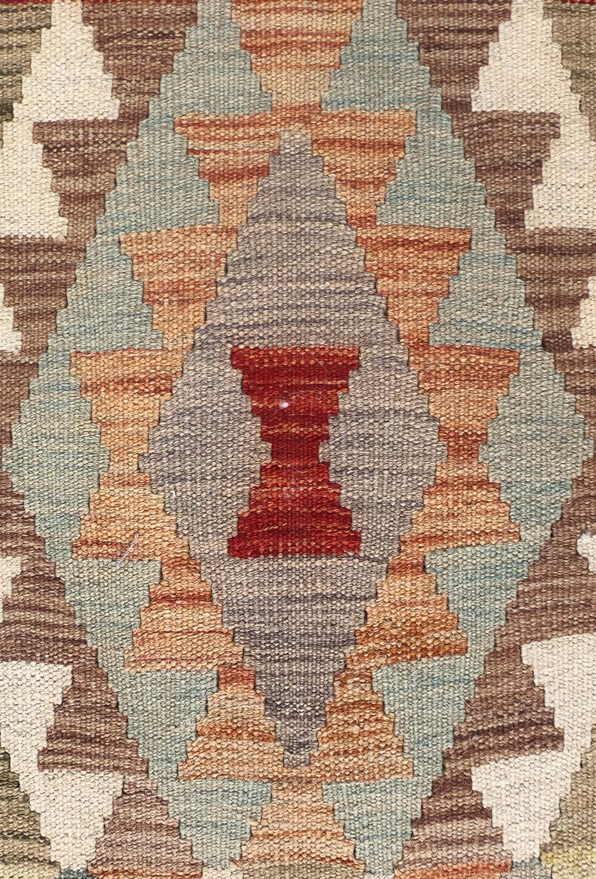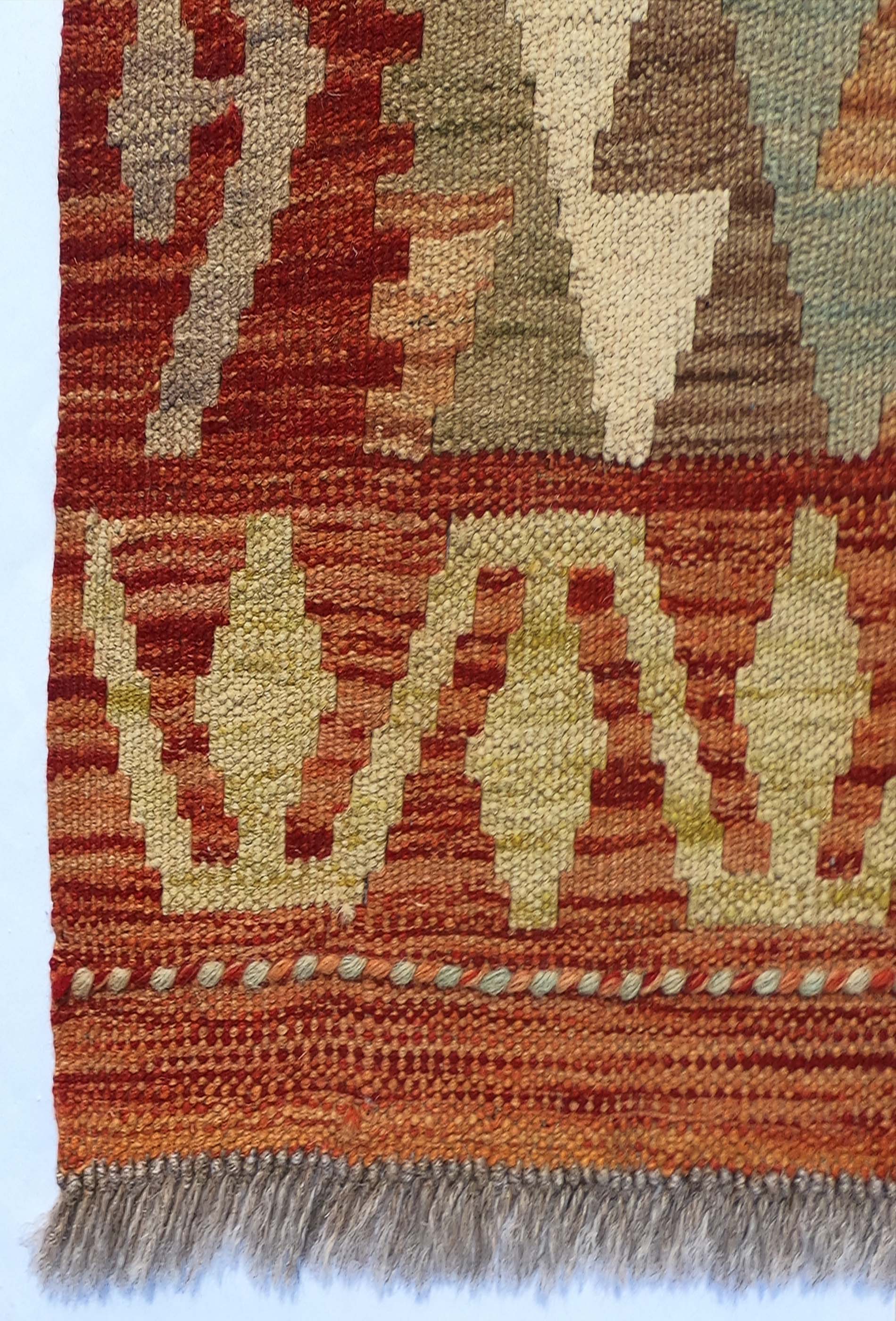 Alfombra de lana tejida en telar de origen Pakistaní, teñida con tintes naturales. Fabricada según la técnica tradicional de tejido de fisura. Esta alfombra se caracteriza por su tejido plano, diseños geométricos y gran colorido.