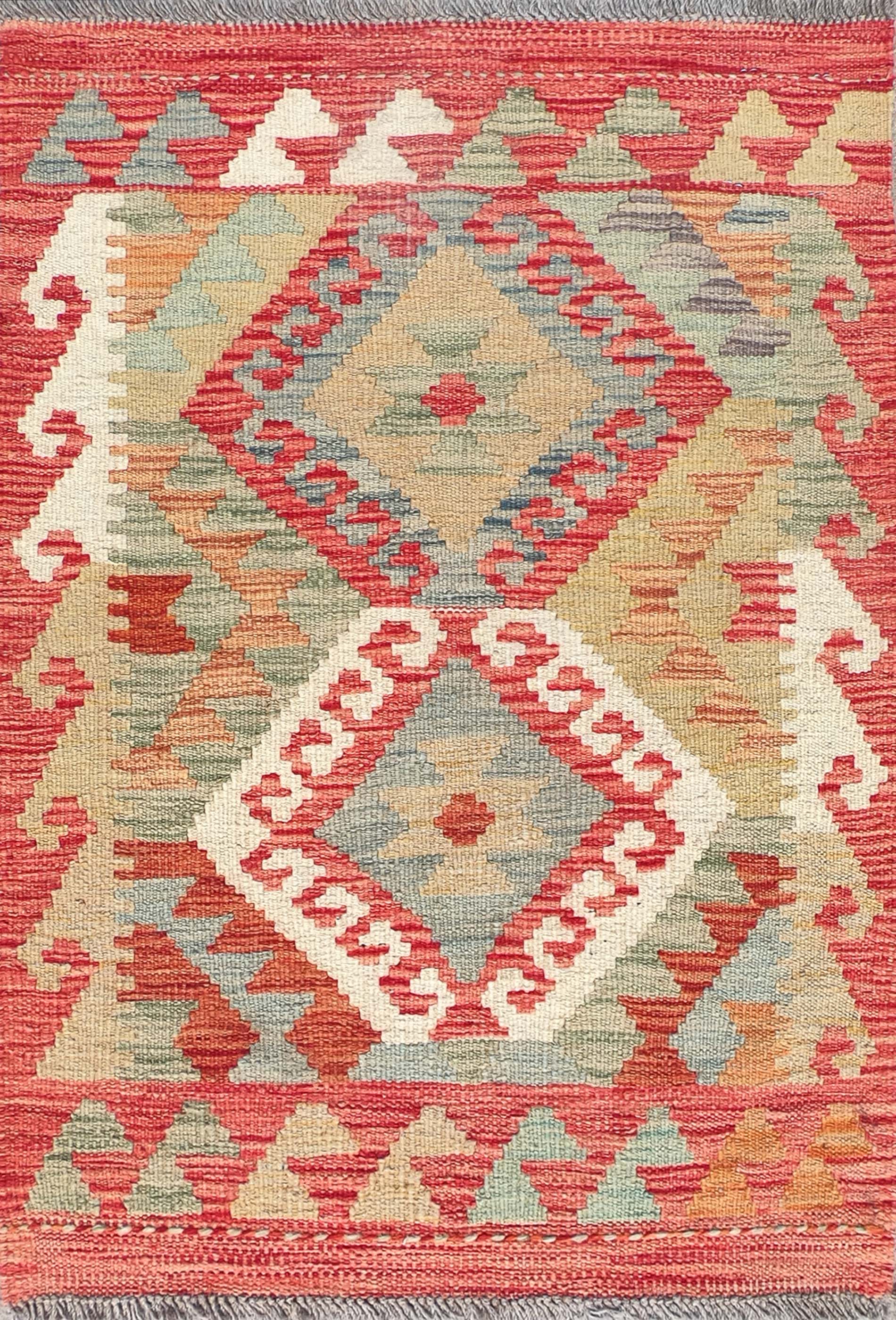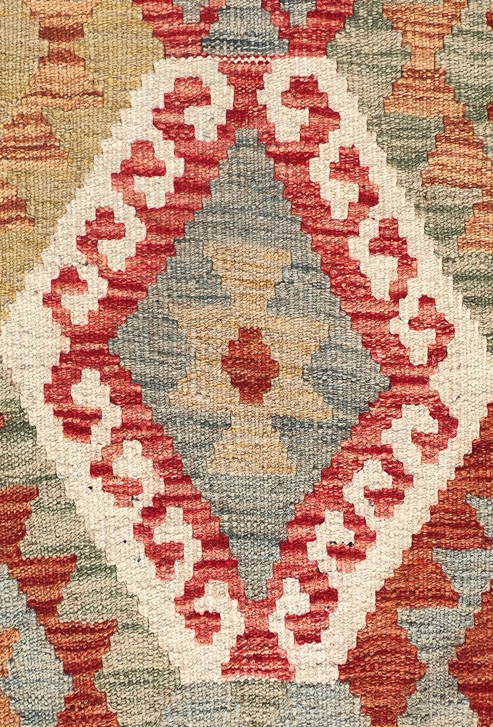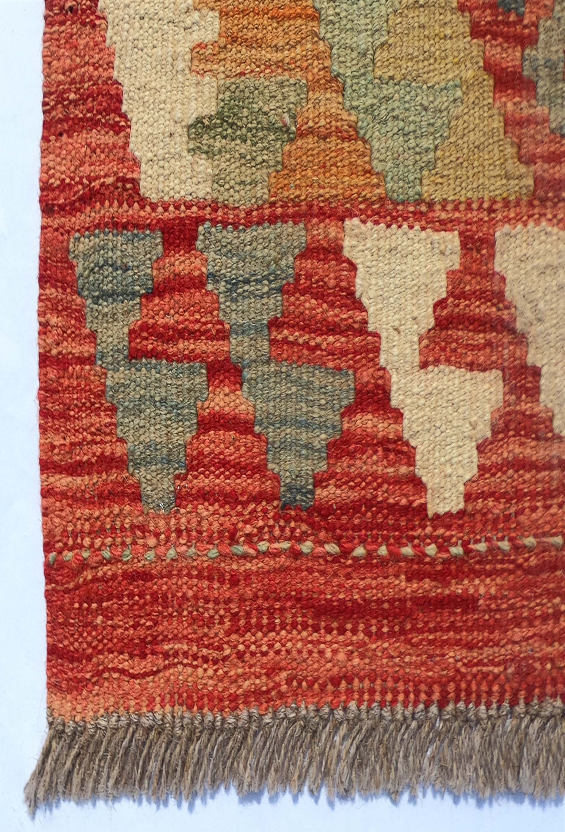 Alfombra de lana tejida en telar de origen Pakistaní, teñida con tintes naturales. Fabricada según la técnica tradicional de tejido de fisura. Esta alfombra se caracteriza por su tejido plano, diseños geométricos y gran colorido.