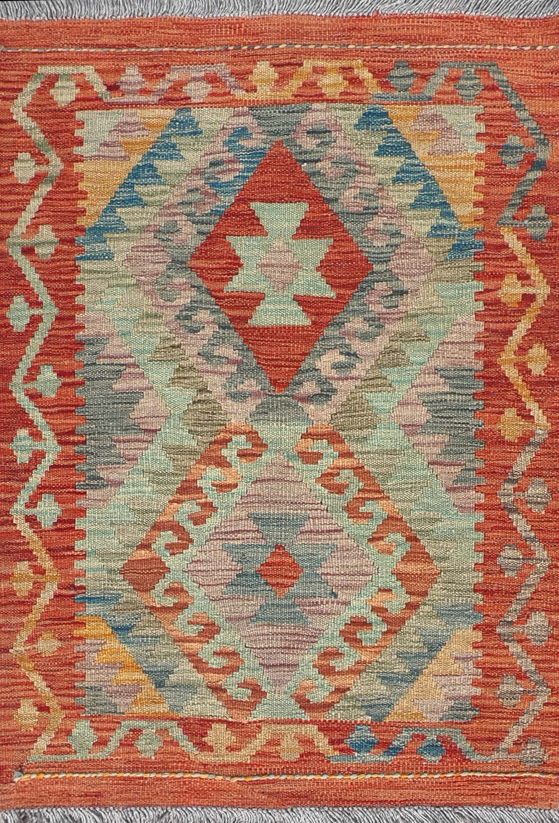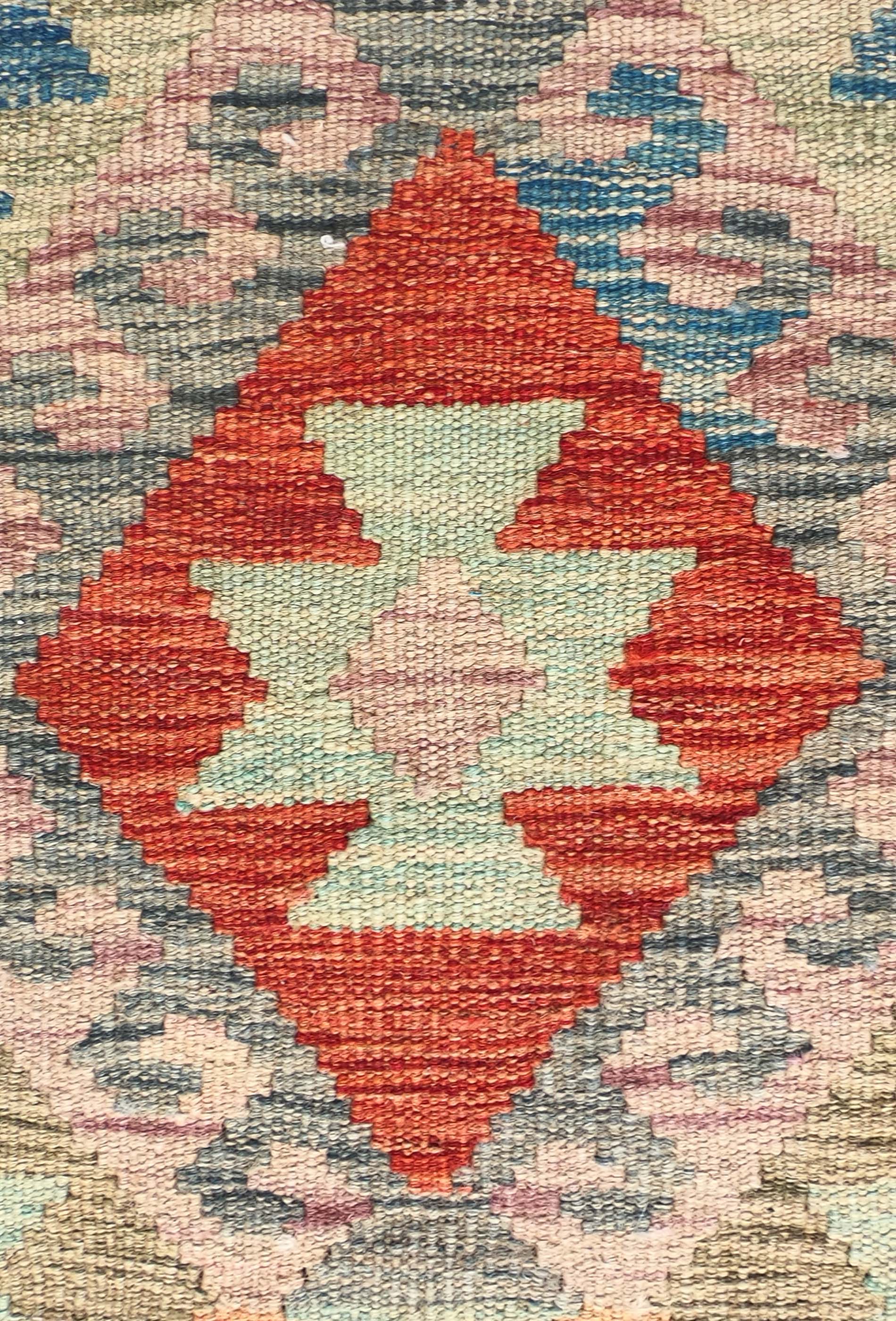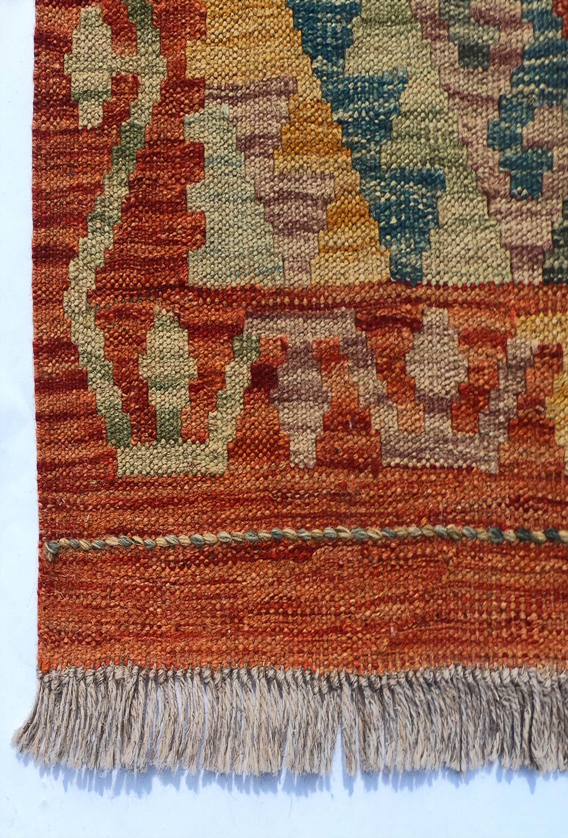 Alfombra de lana tejida en telar de origen Pakistaní, teñida con tintes naturales. Fabricada según la técnica tradicional de tejido de fisura. Esta alfombra se caracteriza por su tejido plano, diseños geométricos y gran colorido.