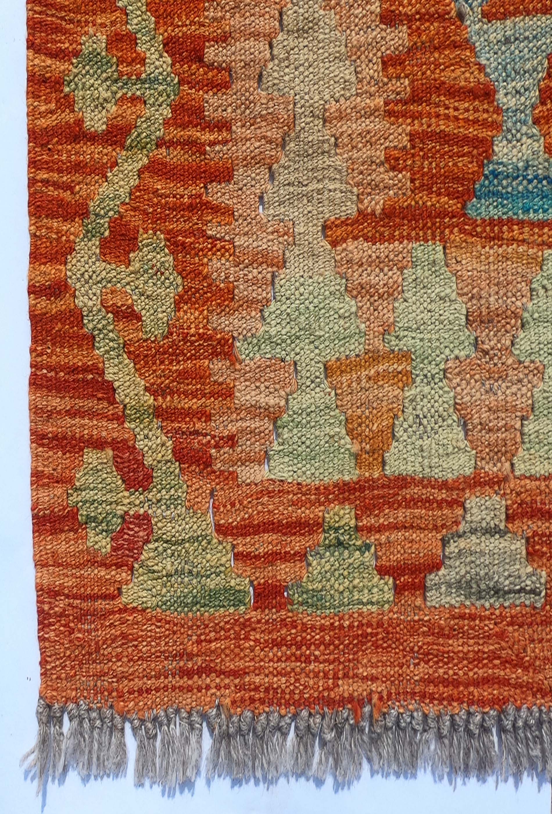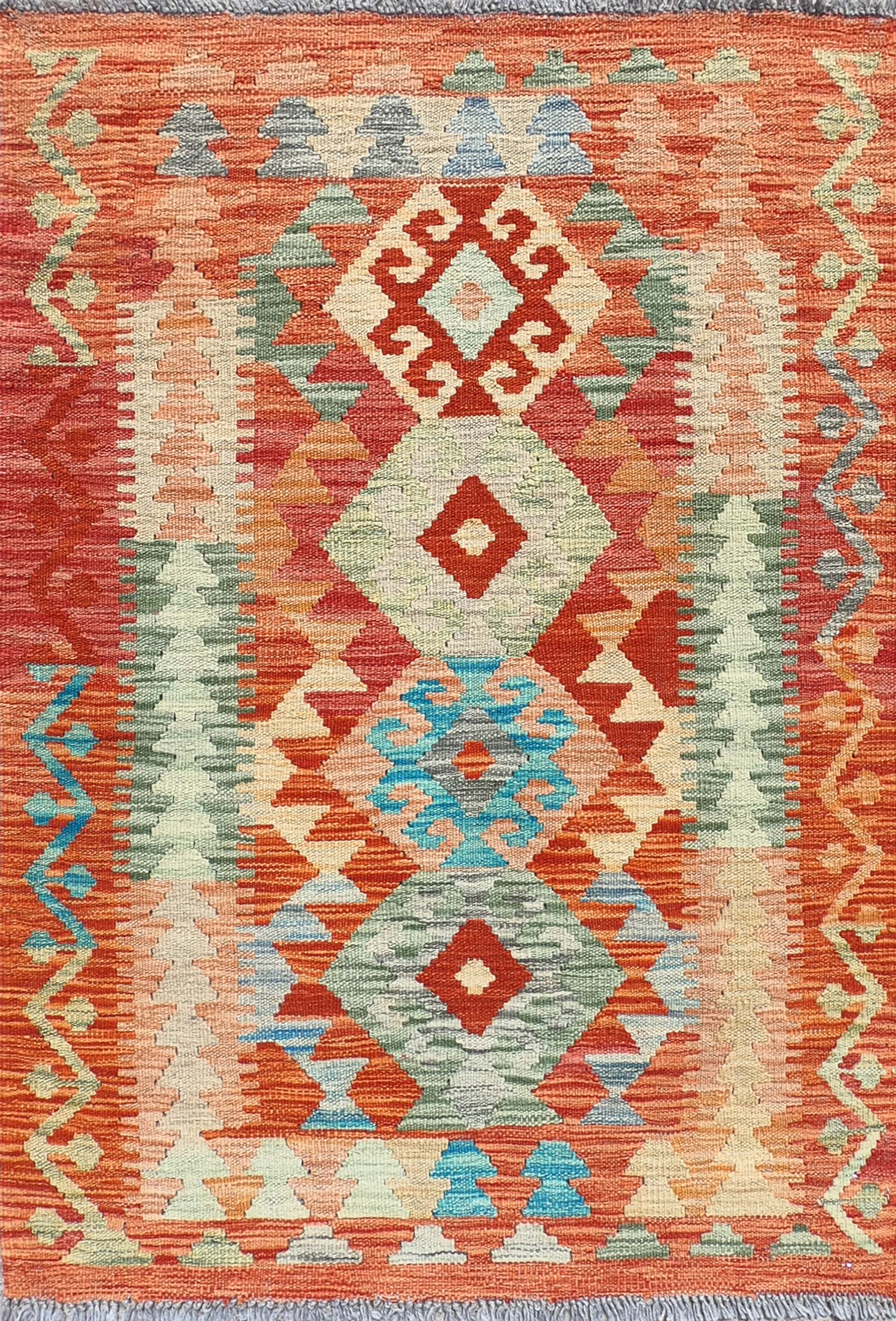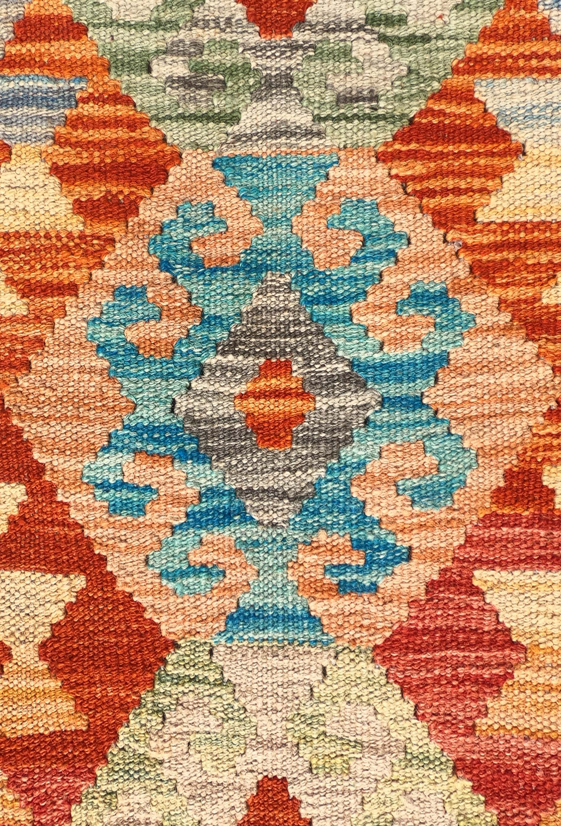 Alfombra de lana tejida en telar de origen Pakistaní, teñida con tintes naturales. Fabricada según la técnica tradicional de tejido de fisura. Esta alfombra se caracteriza por su tejido plano, diseños geométricos y gran colorido.