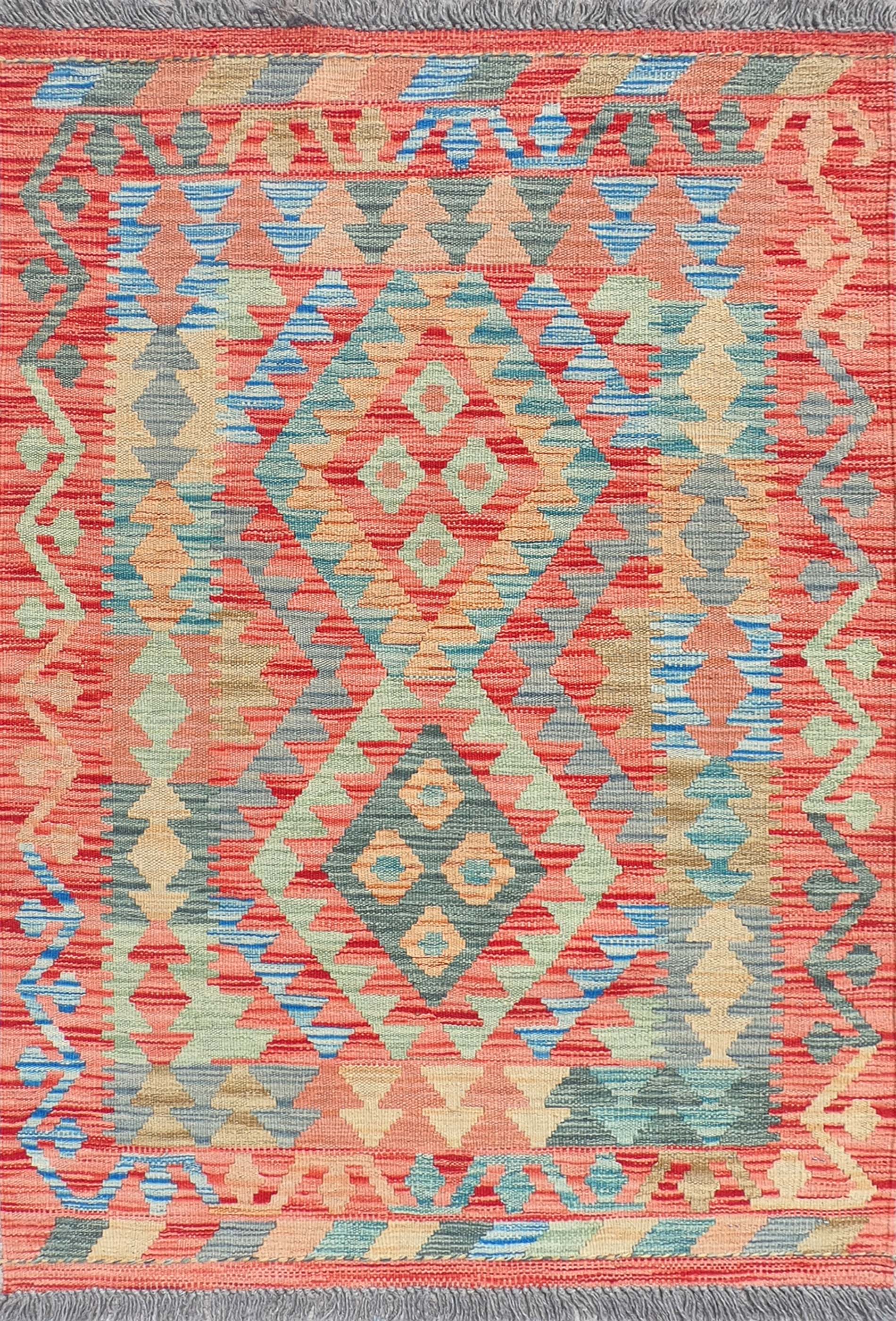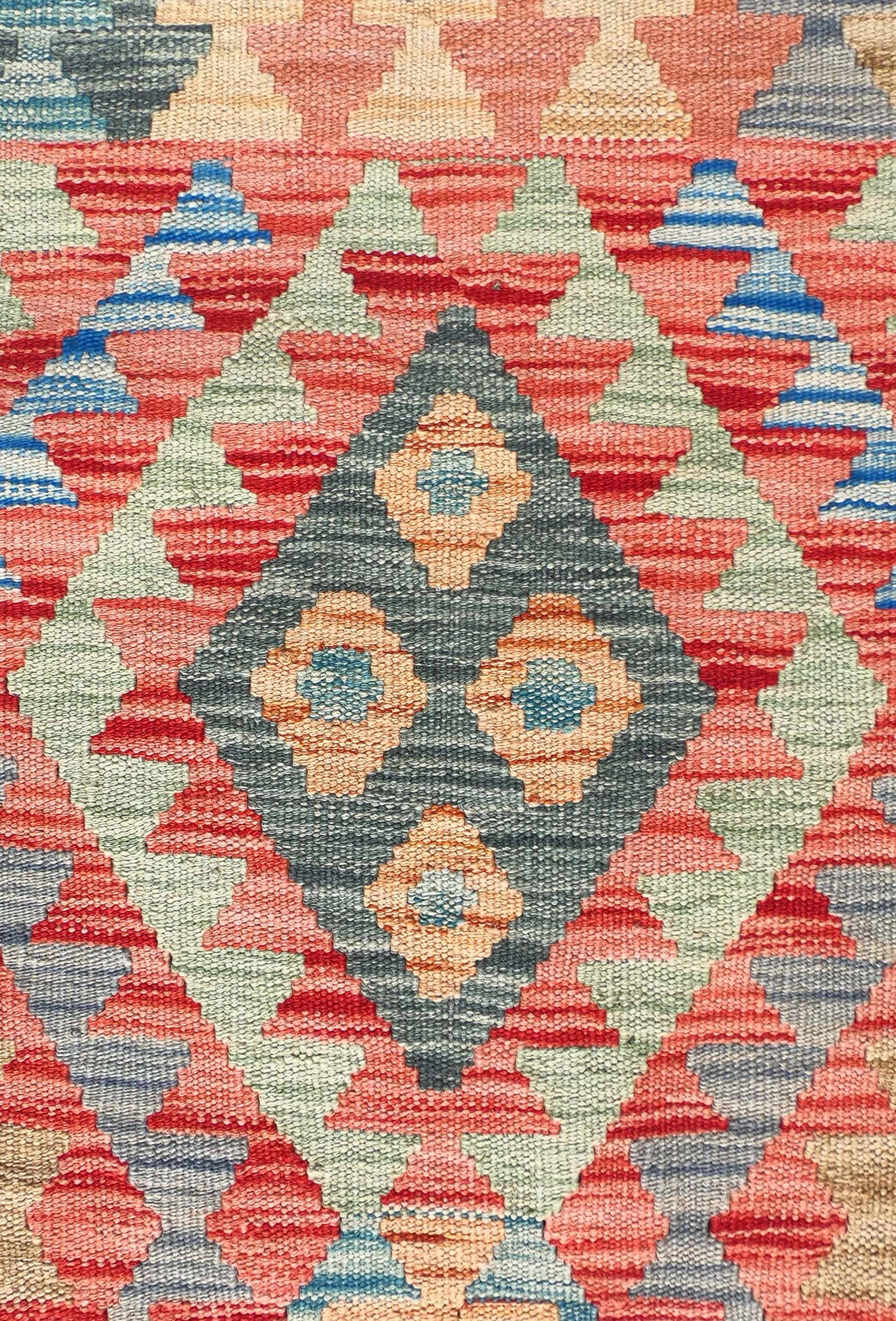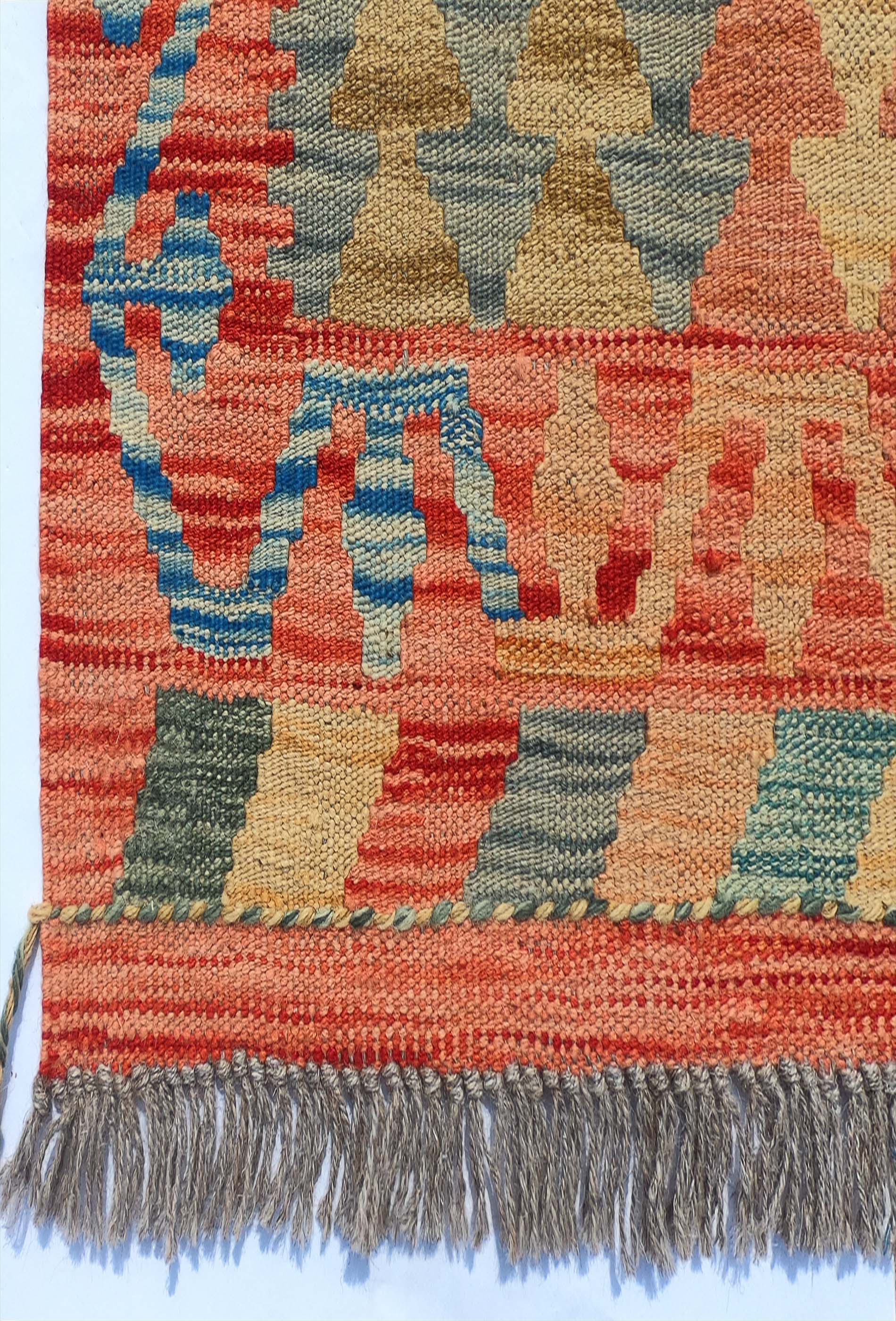 Alfombra de lana tejida en telar de origen Pakistaní, teñida con tintes naturales. Fabricada según la técnica tradicional de tejido de fisura. Esta alfombra se caracteriza por su tejido plano, diseños geométricos y gran colorido.