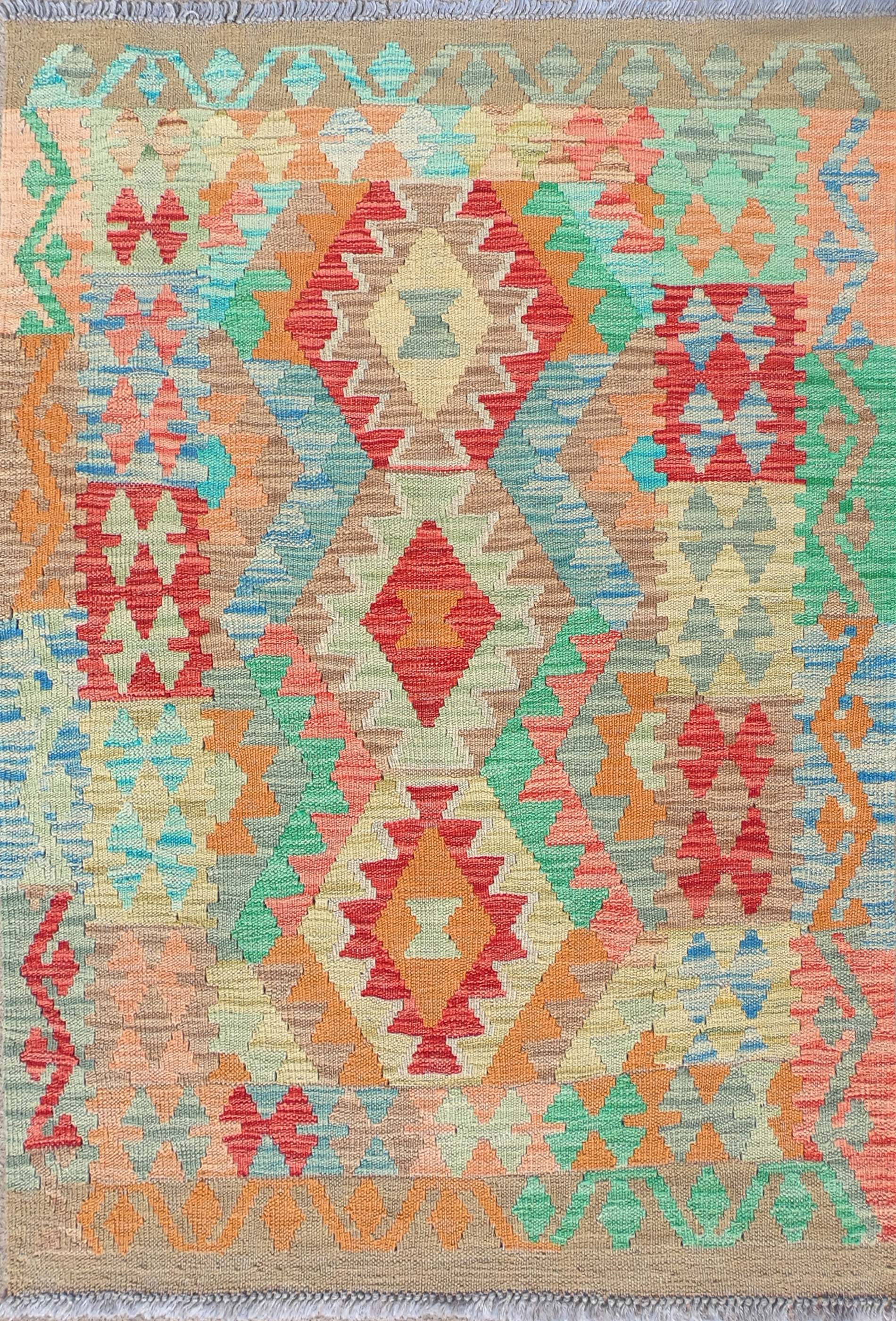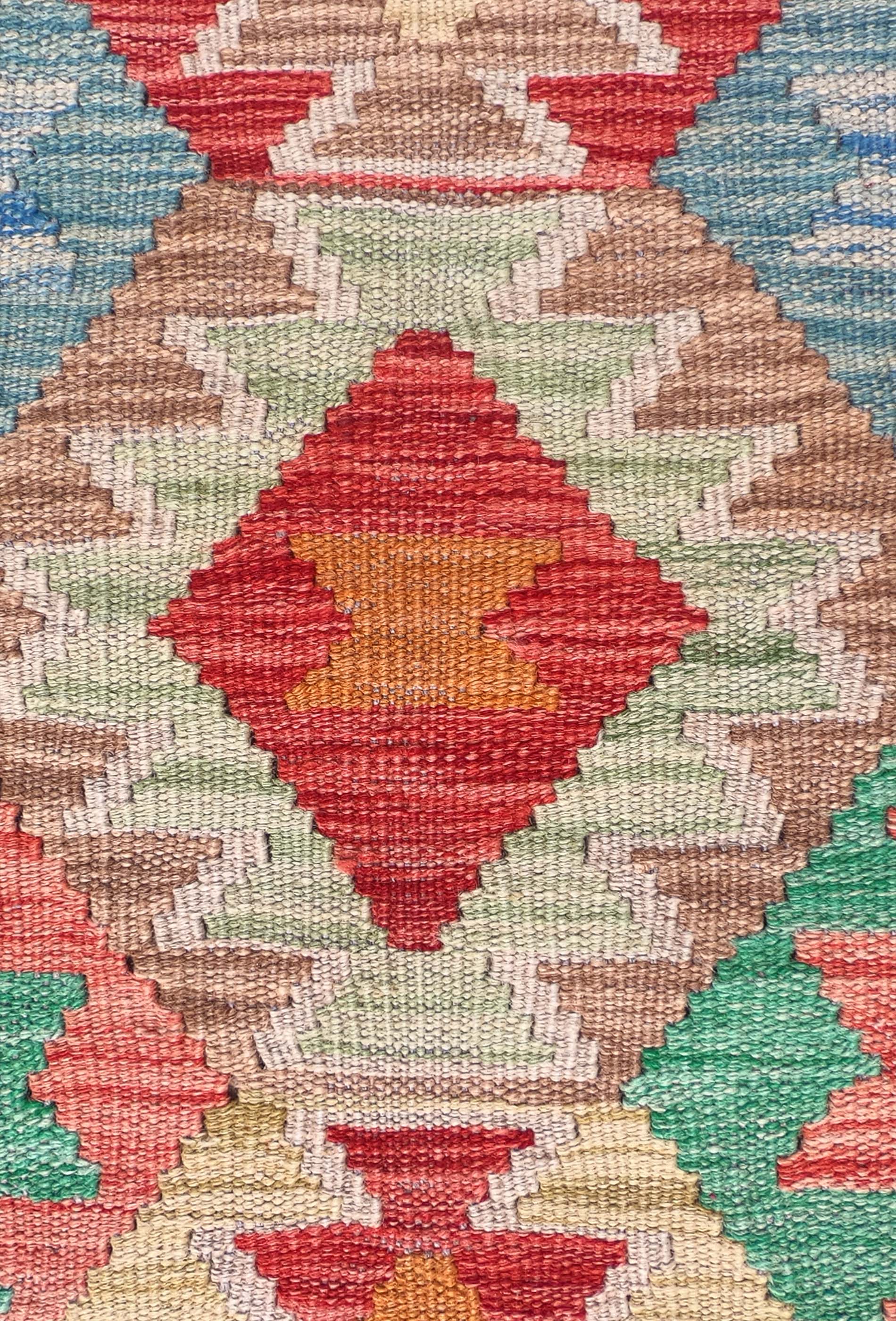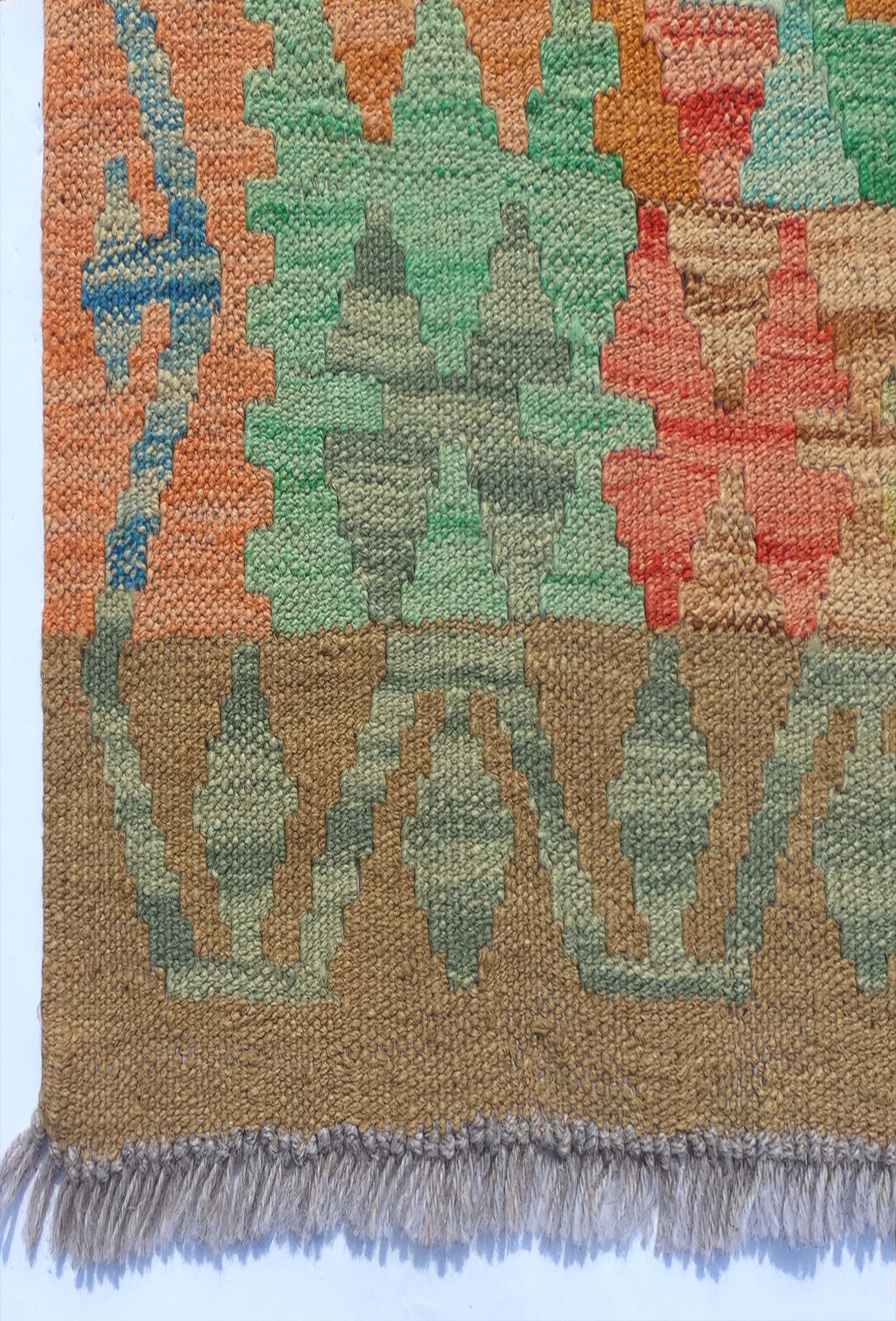 Alfombra de lana tejida en telar de origen Pakistaní, teñida con tintes naturales. Fabricada según la técnica tradicional de tejido de fisura. Esta alfombra se caracteriza por su tejido plano, diseños geométricos y gran colorido.