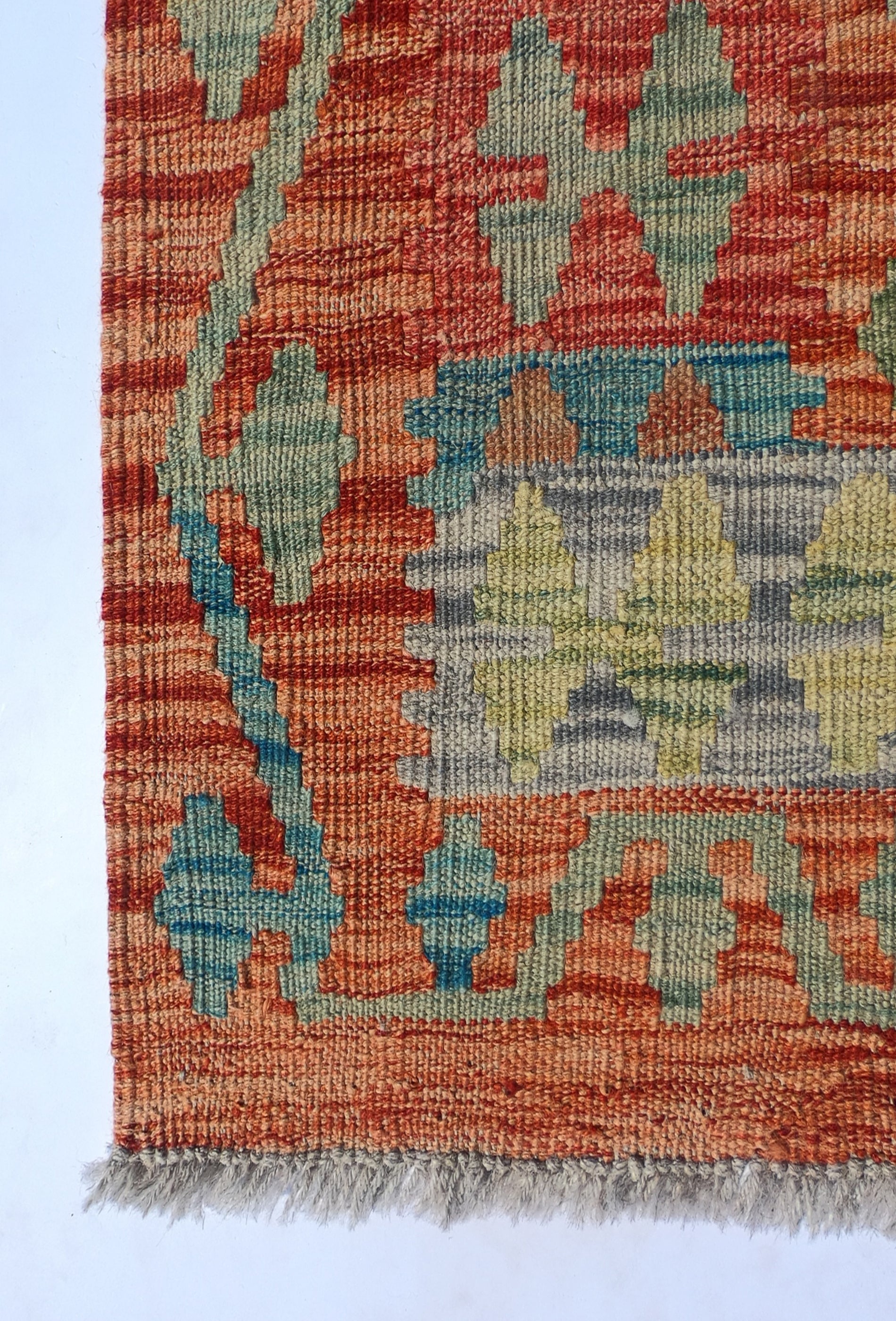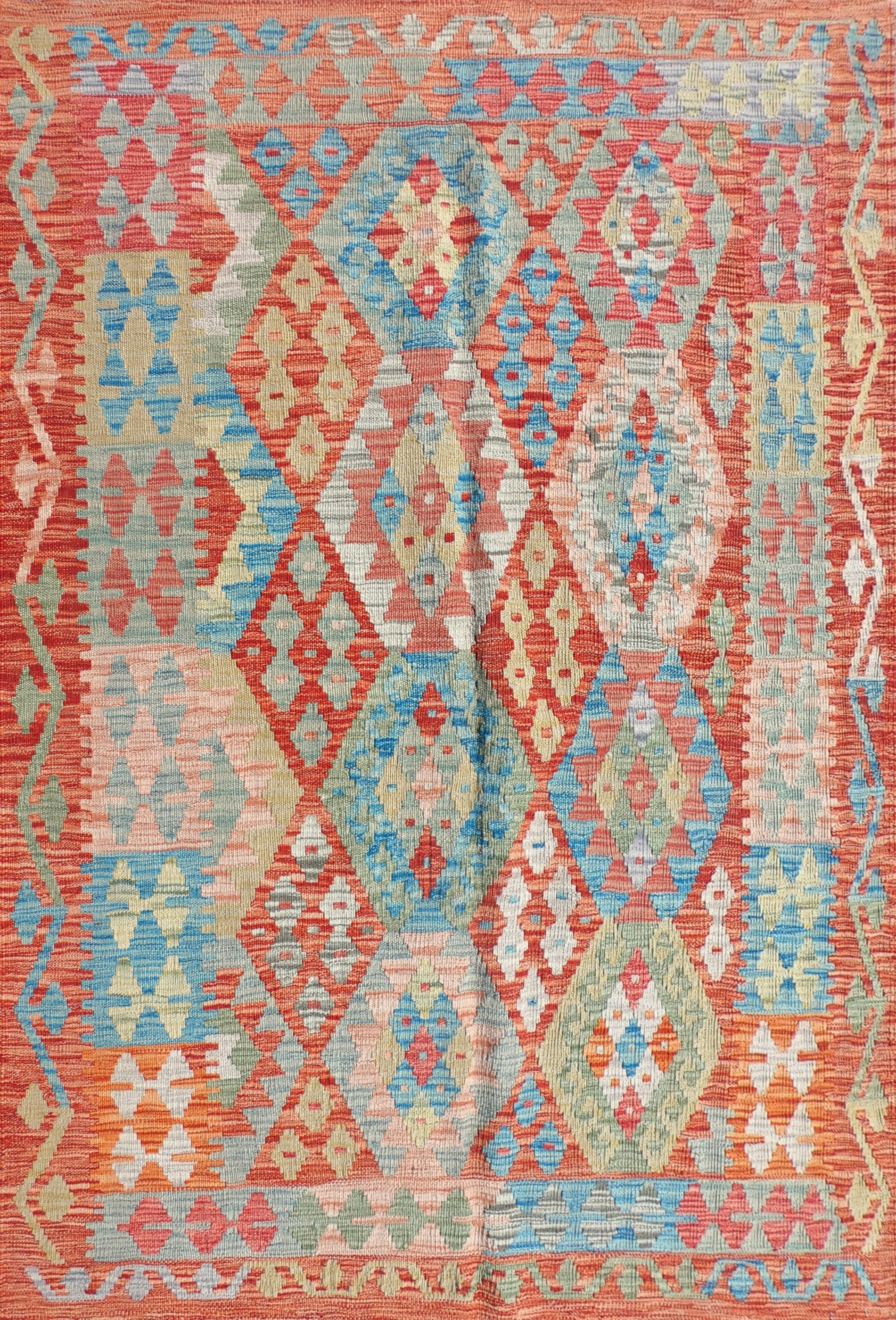 Alfombra de lana tejida en telar de origen Pakistaní, teñida con tintes naturales. Fabricada según la técnica tradicional de tejido de fisura. Esta alfombra se caracteriza por su tejido plano, diseños geométricos y gran colorido.