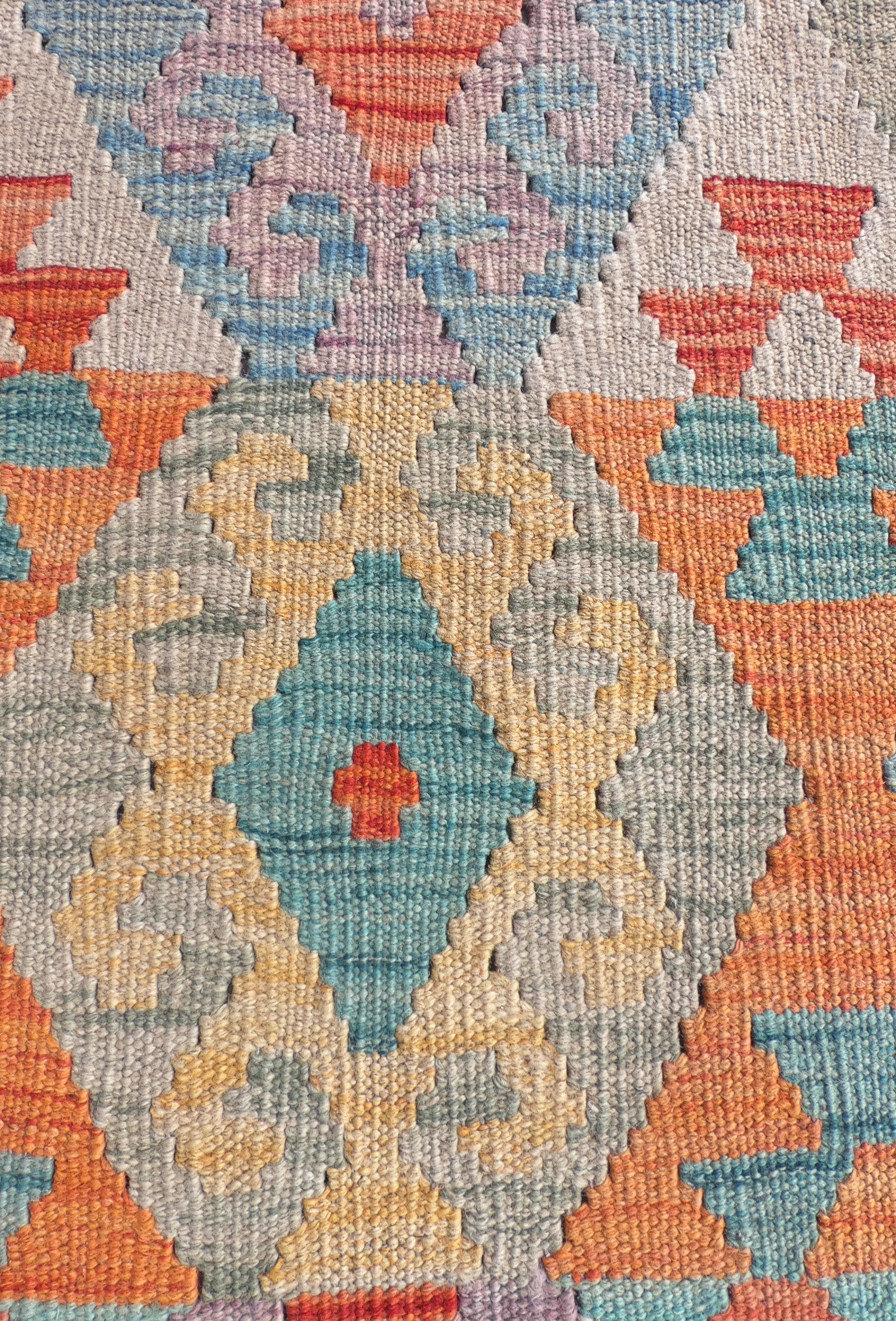 Alfombra de lana tejida en telar de origen Pakistaní, teñida con tintes naturales. Fabricada según la técnica tradicional de tejido de fisura. Esta alfombra se caracteriza por su tejido plano, diseños geométricos y gran colorido.