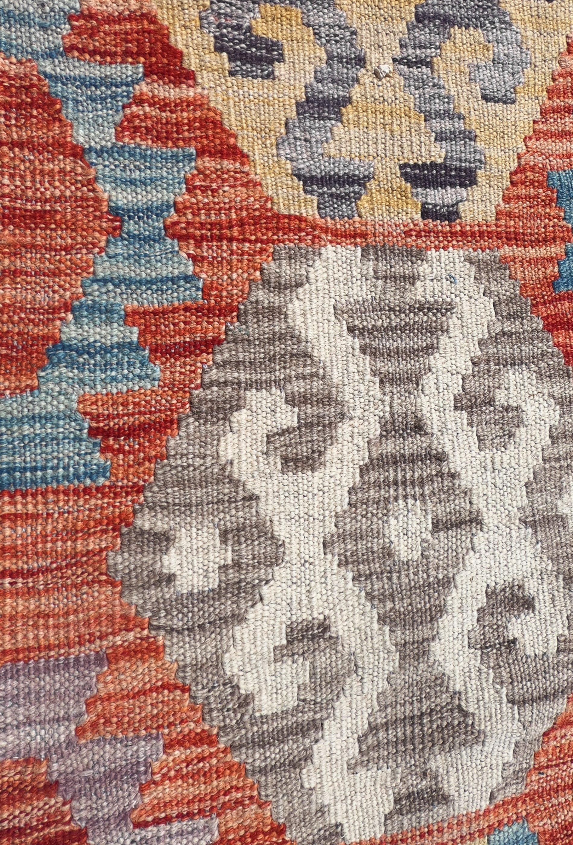Alfombra de lana tejida en telar de origen Pakistaní, teñida con tintes naturales. Fabricada según la técnica tradicional de tejido de fisura. Esta alfombra se caracteriza por su tejido plano, diseños geométricos y gran colorido.