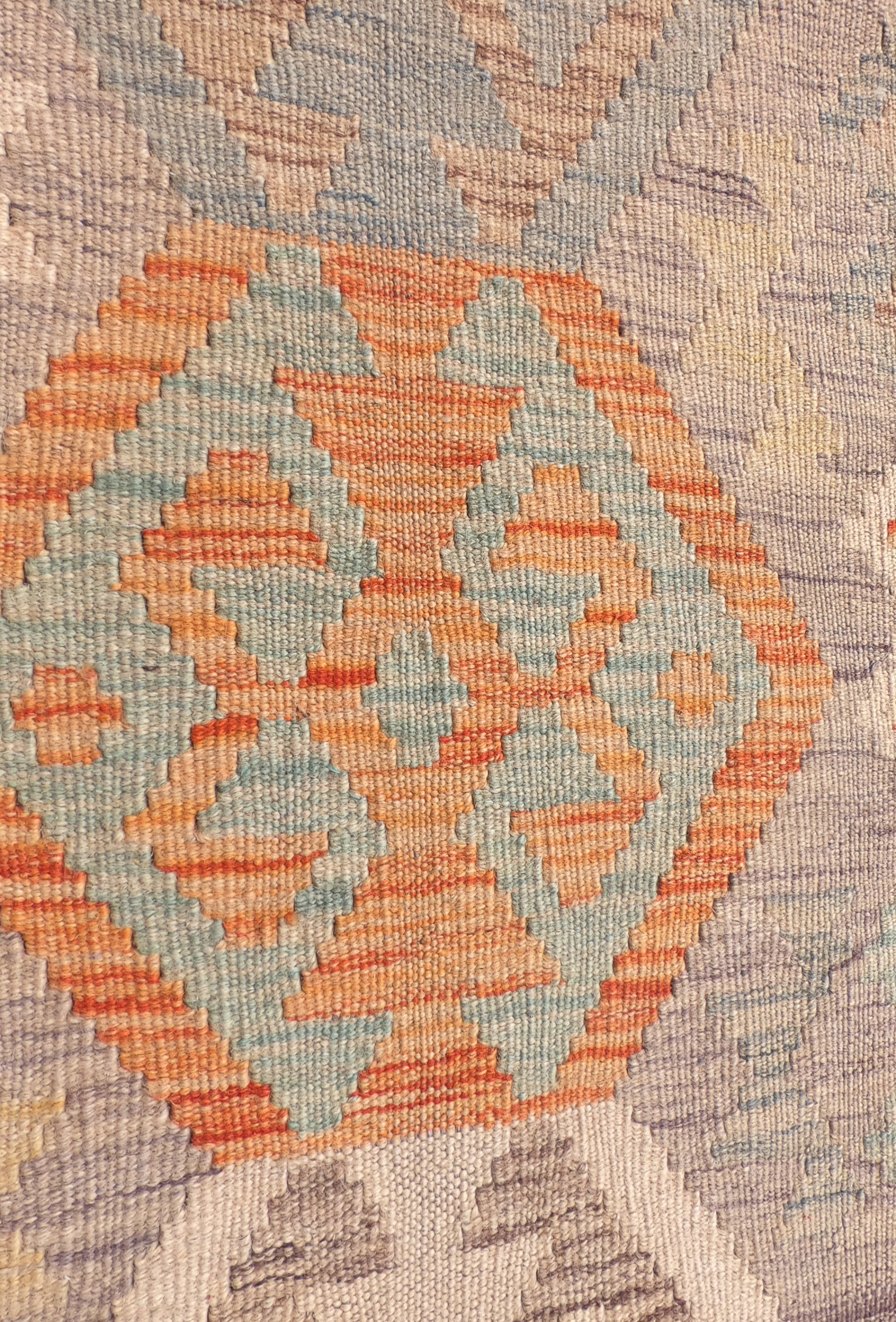 Alfombra de lana tejida en telar de origen Pakistaní, teñida con tintes naturales. Fabricada según la técnica tradicional de tejido de fisura. Esta alfombra se caracteriza por su tejido plano, diseños geométricos y gran colorido.