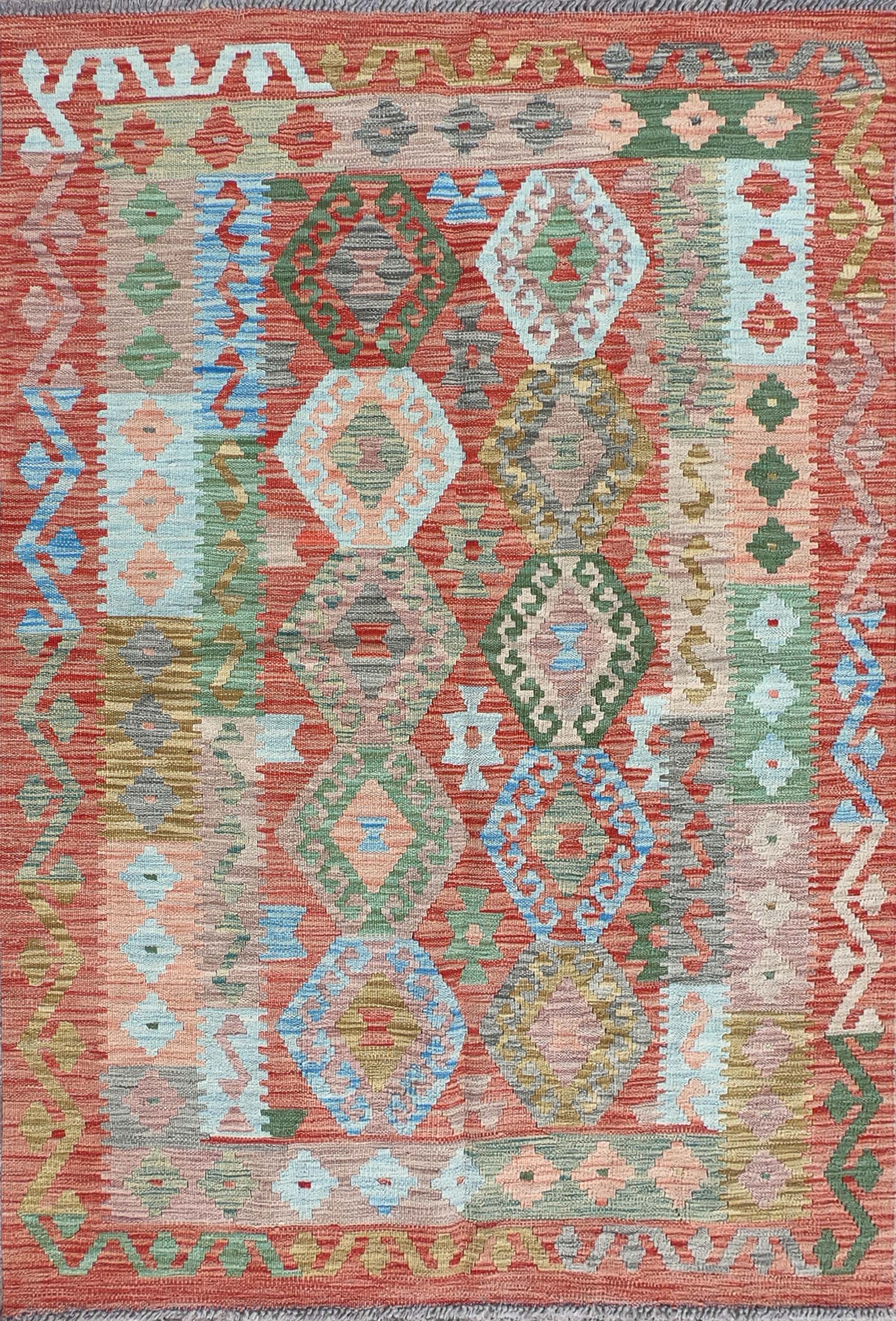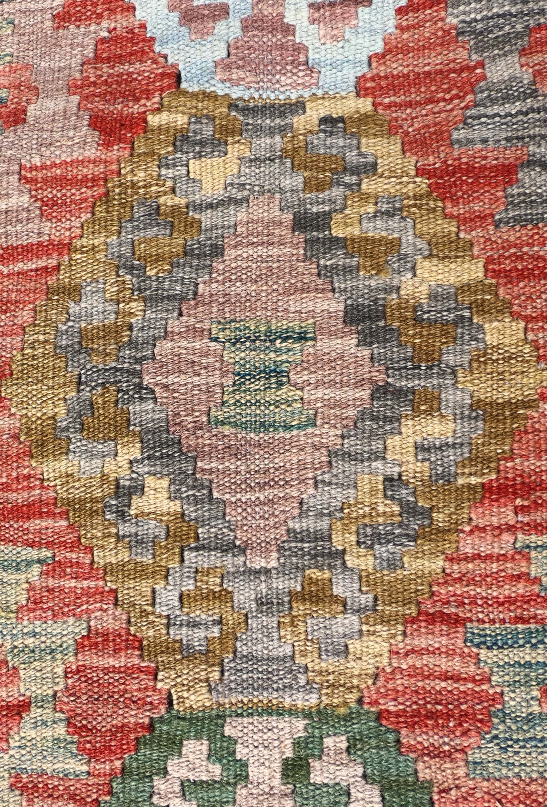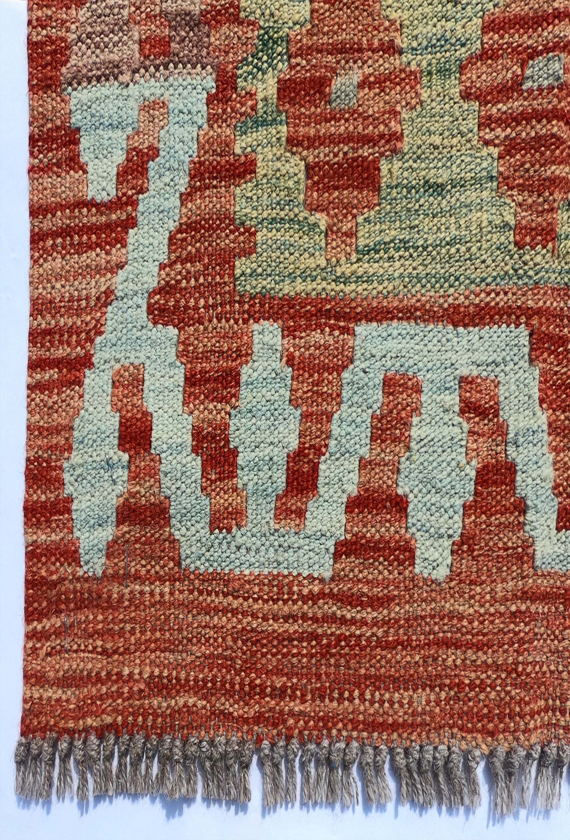 Alfombra de lana tejida en telar de origen Pakistaní, teñida con tintes naturales. Fabricada según la técnica tradicional de tejido de fisura. Esta alfombra se caracteriza por su tejido plano, diseños geométricos y gran colorido.