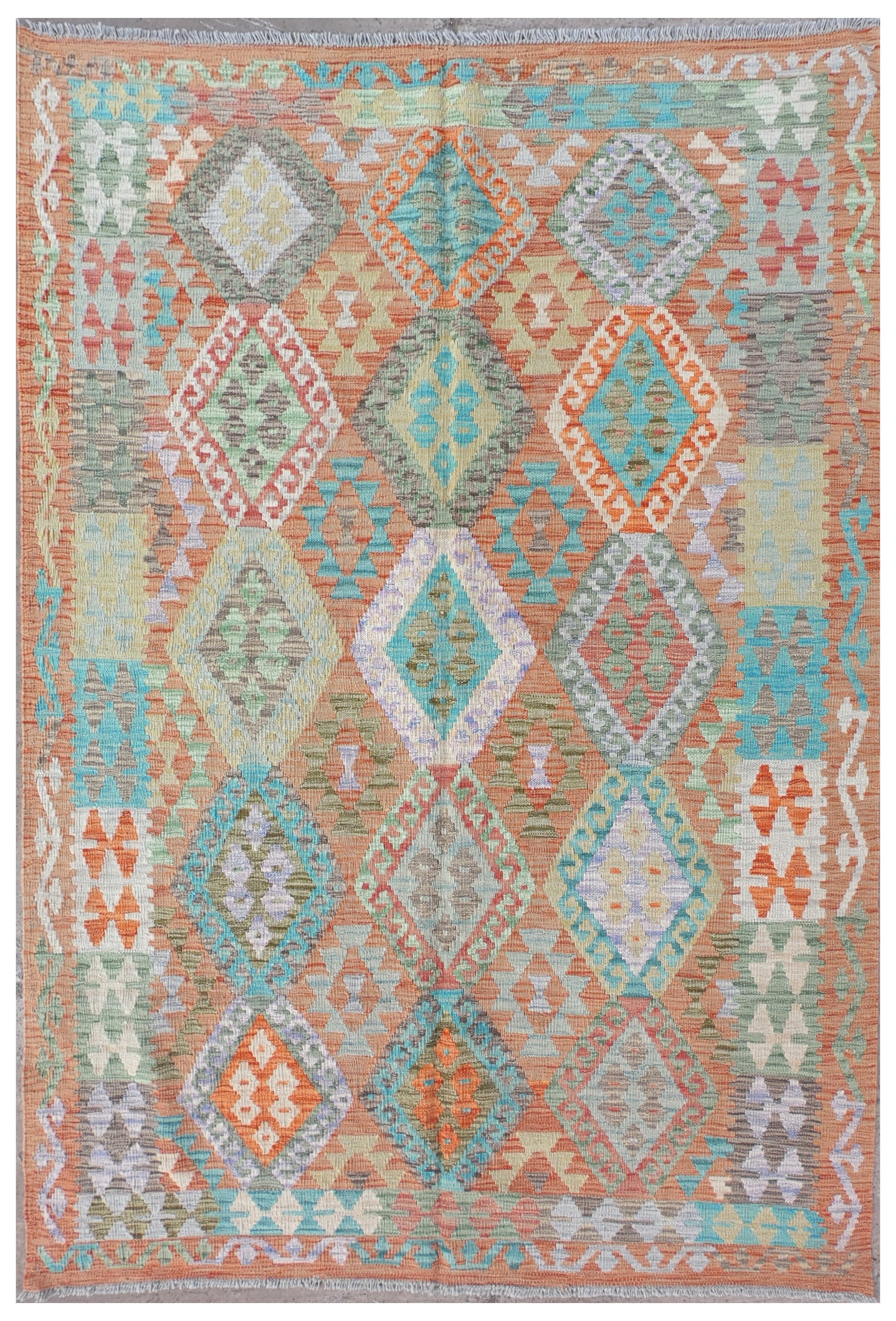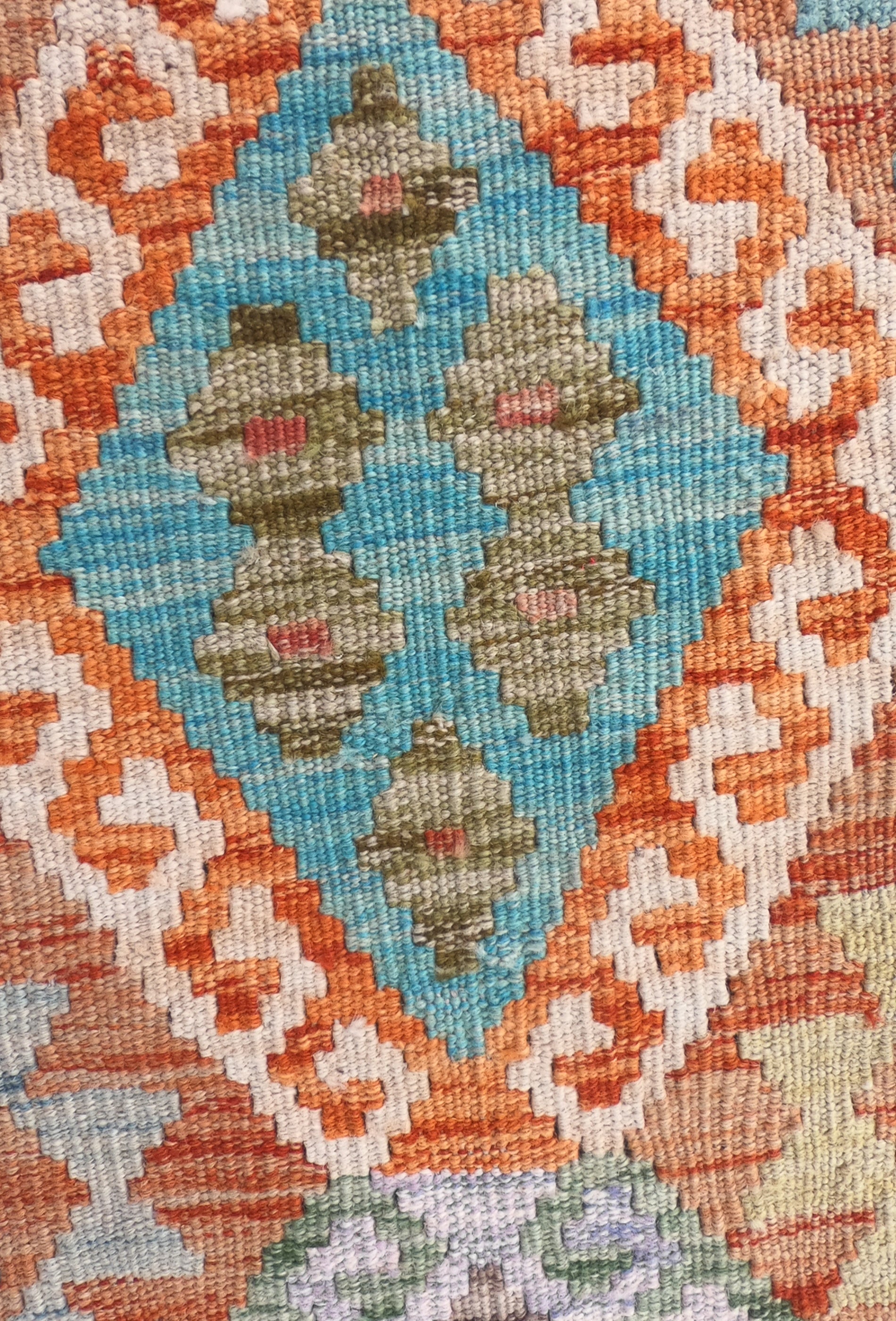 Alfombra de lana tejida en telar de origen Pakistaní, teñida con tintes naturales. Fabricada según la técnica tradicional de tejido de fisura. Esta alfombra se caracteriza por su tejido plano, diseños geométricos y gran colorido.