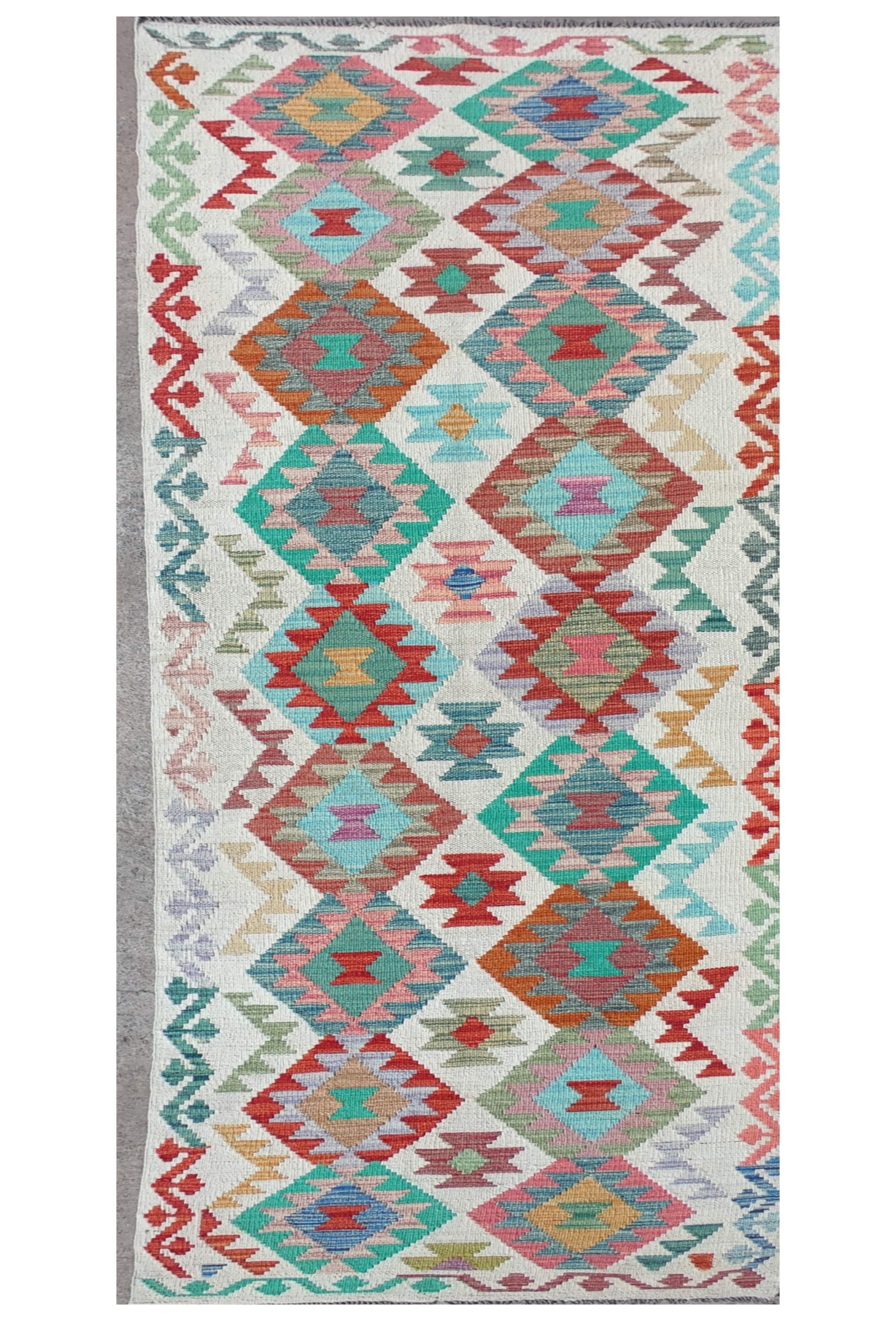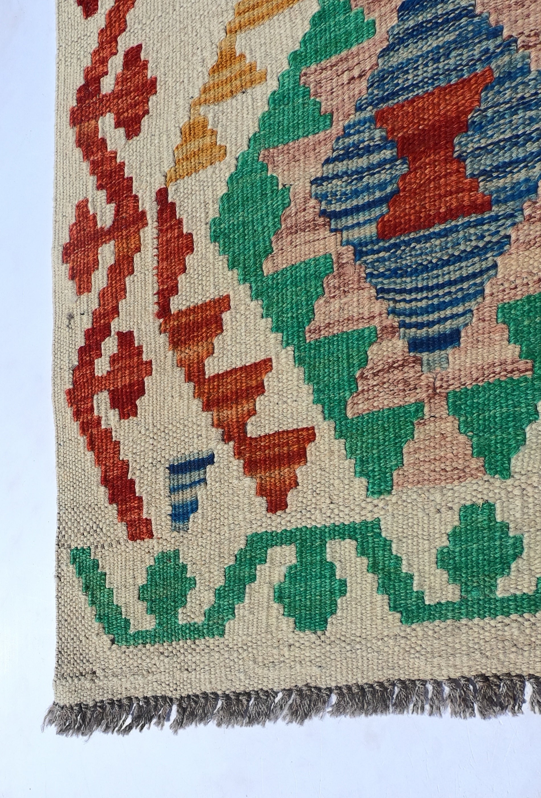Alfombra de lana tejida en telar de origen Pakistaní, teñida con tintes naturales. Fabricada según la técnica tradicional de tejido de fisura. Esta alfombra se caracteriza por su tejido plano, diseños geométricos y gran colorido.