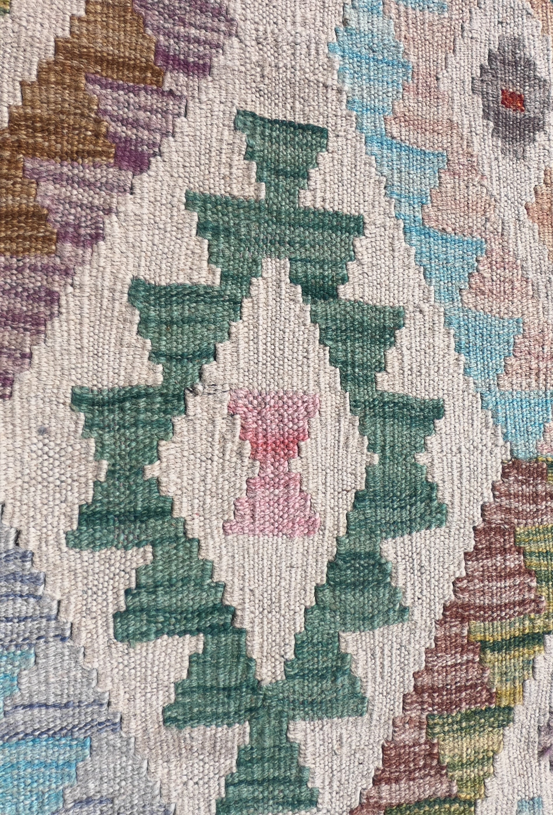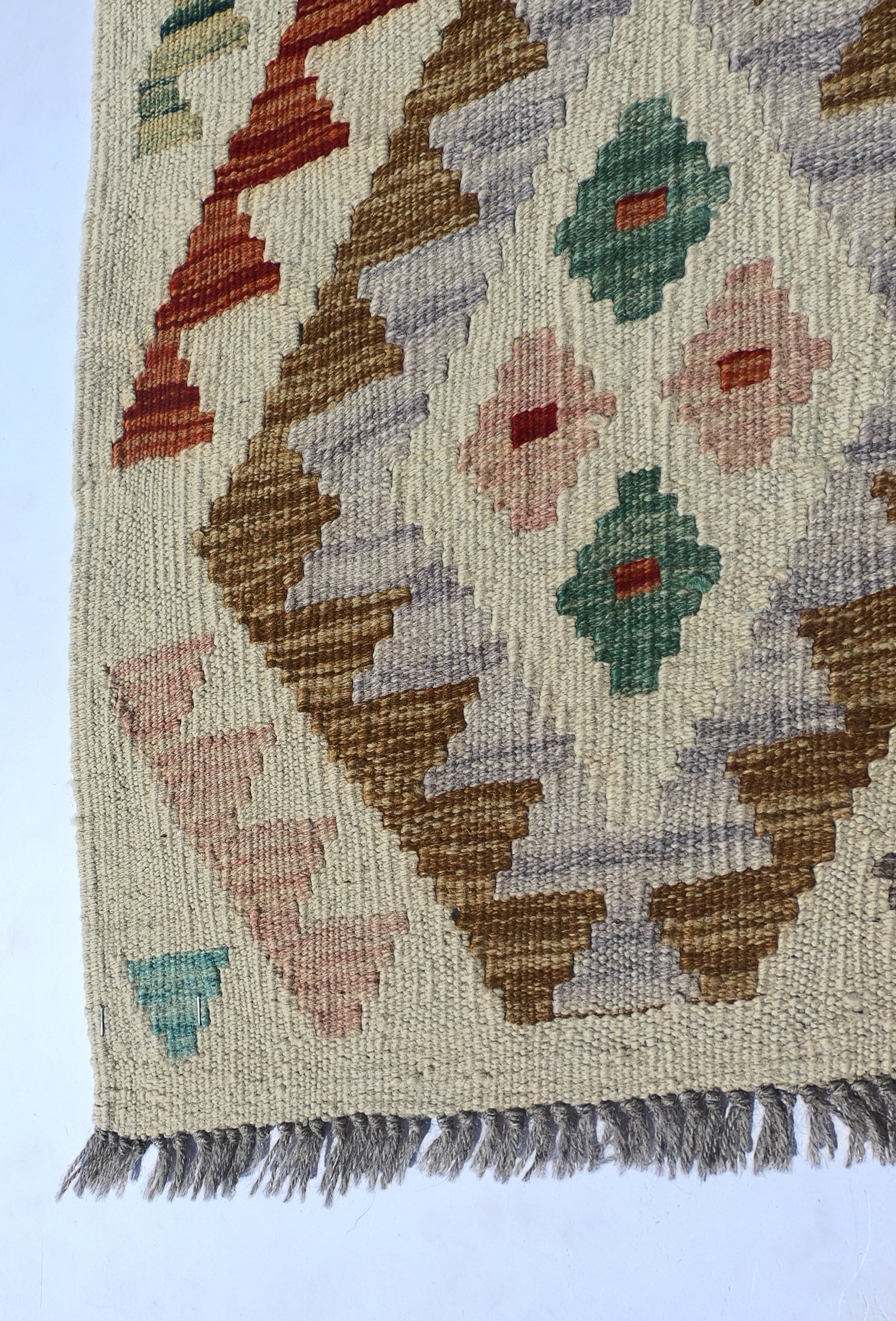 Alfombra de lana tejida en telar de origen Pakistaní, teñida con tintes naturales. Fabricada según la técnica tradicional de tejido de fisura. Esta alfombra se caracteriza por su tejido plano, diseños geométricos y gran colorido.