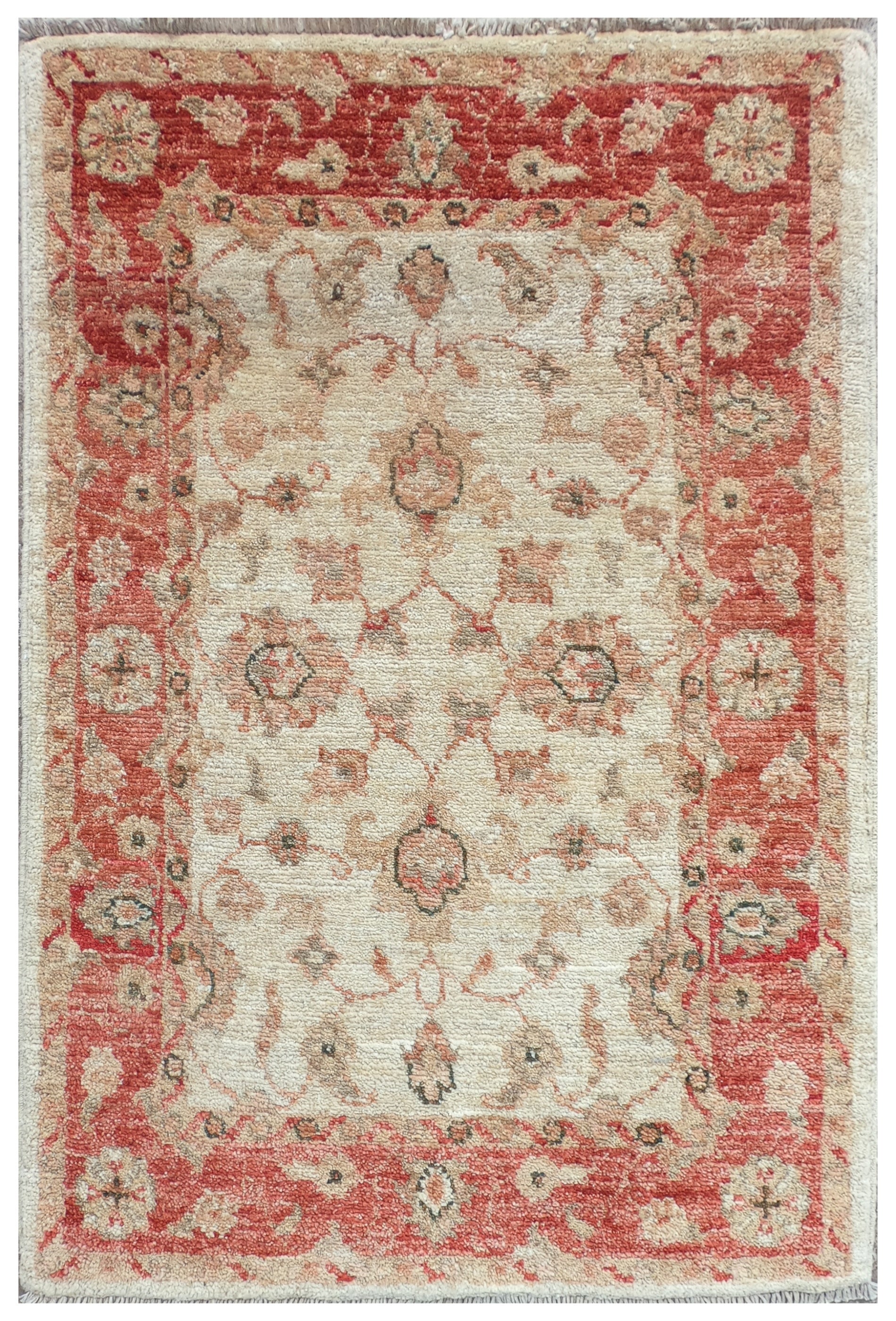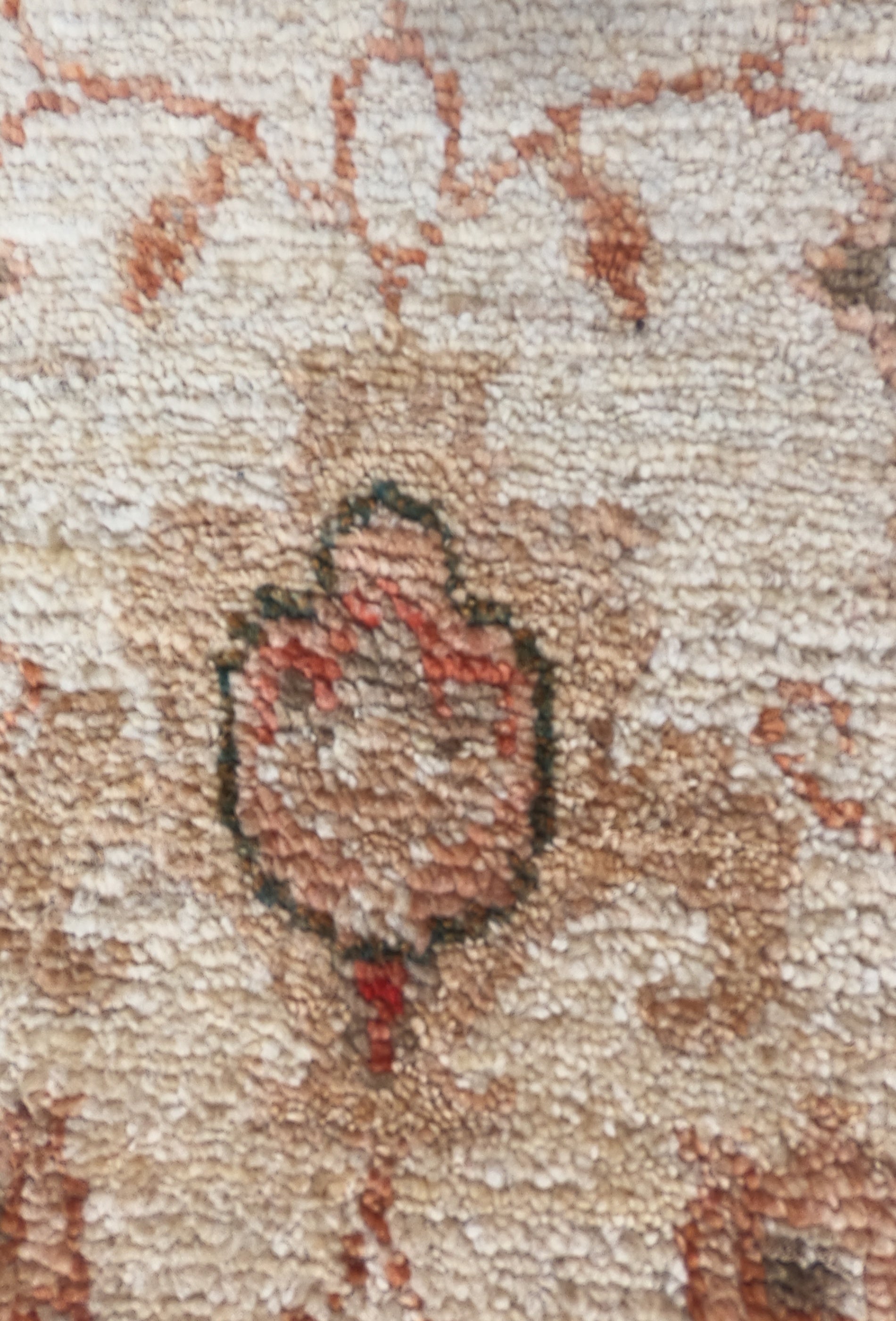 Alfombra con trama de algodón y anudado a mano en lana, de origen Pakistaní. Este tipo de alfombras se caracterizan por tener un marco, diseños florales y colores en tonos beige y burdeos. Es una alfombra gruesa y teñida con tintes vegetales. Posee entre 800.000 y 900.000 nudos por metro cuadrado aproximadamente