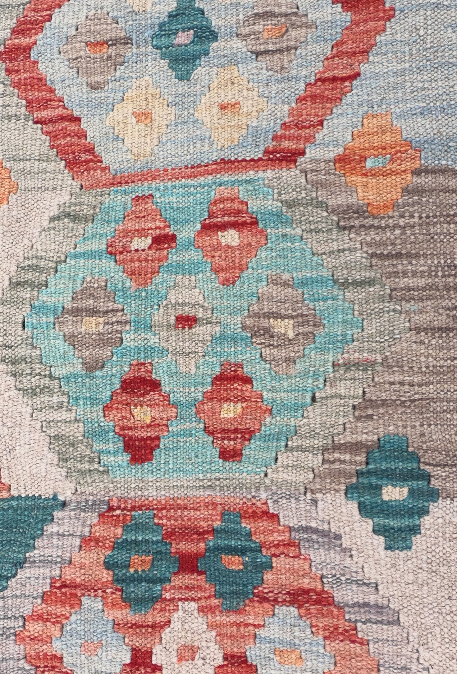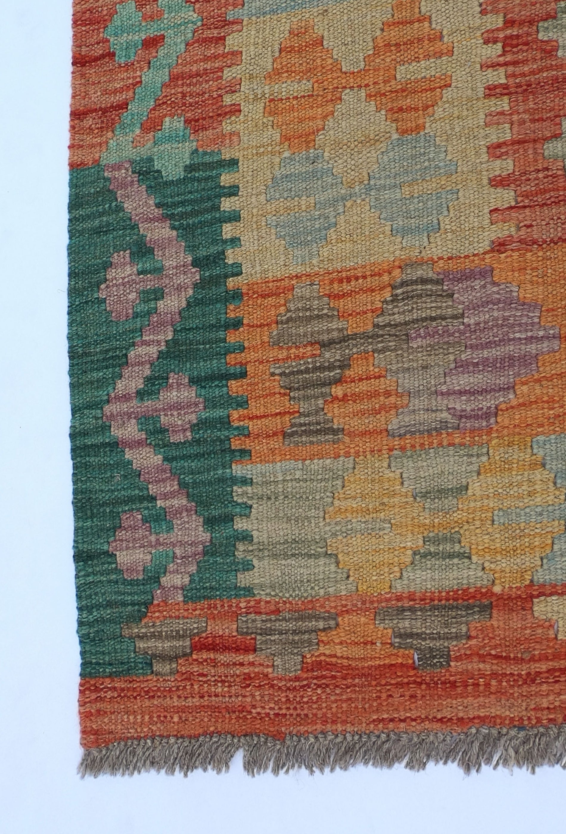 Alfombra de lana tejida en telar de origen Pakistaní, teñida con tintes naturales. Fabricada según la técnica tradicional de tejido de fisura. Esta alfombra se caracteriza por su tejido plano, diseños geométricos y gran colorido.