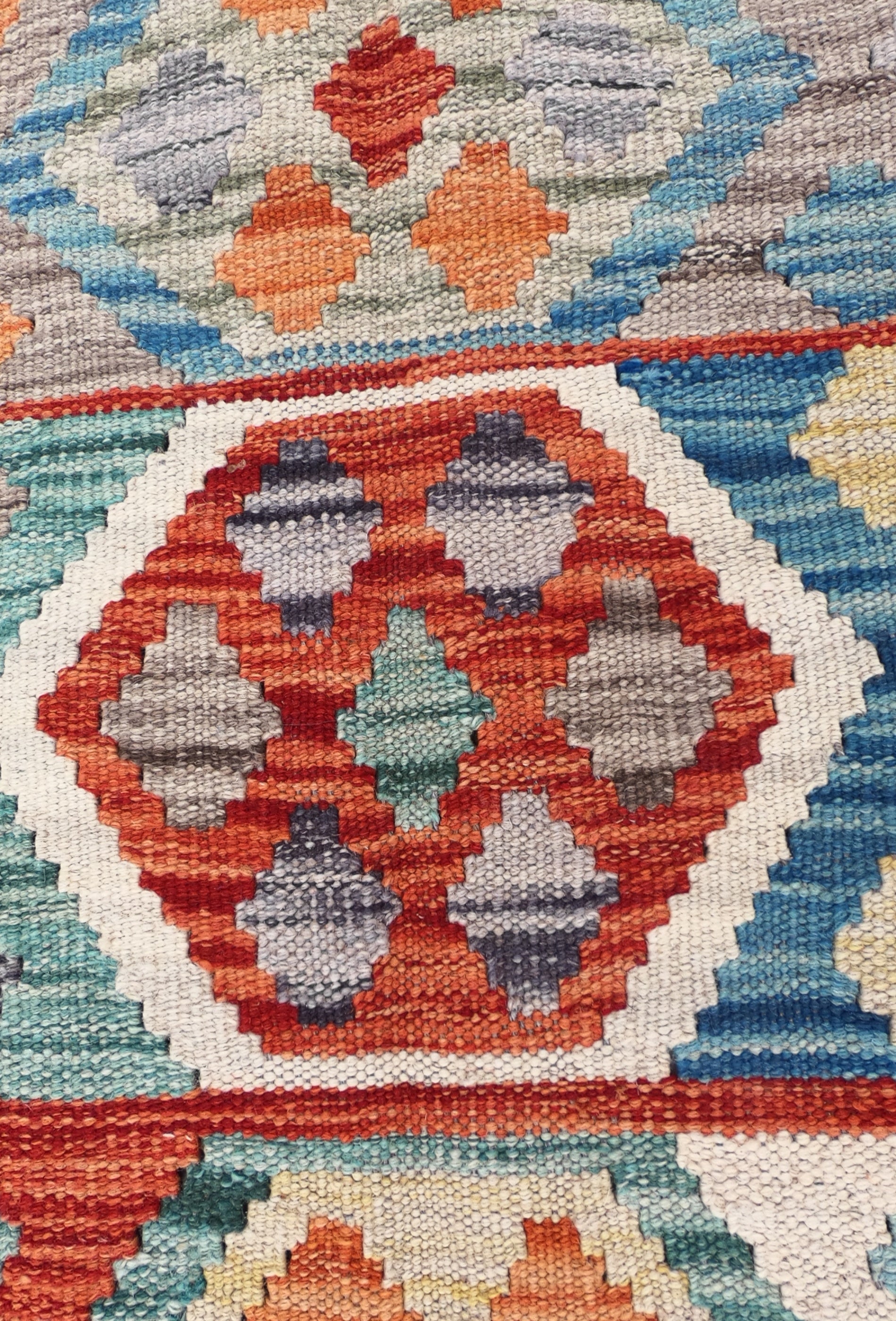 Alfombra de lana tejida en telar de origen Pakistaní, teñida con tintes naturales. Fabricada según la técnica tradicional de tejido de fisura. Esta alfombra se caracteriza por su tejido plano, diseños geométricos y gran colorido.
