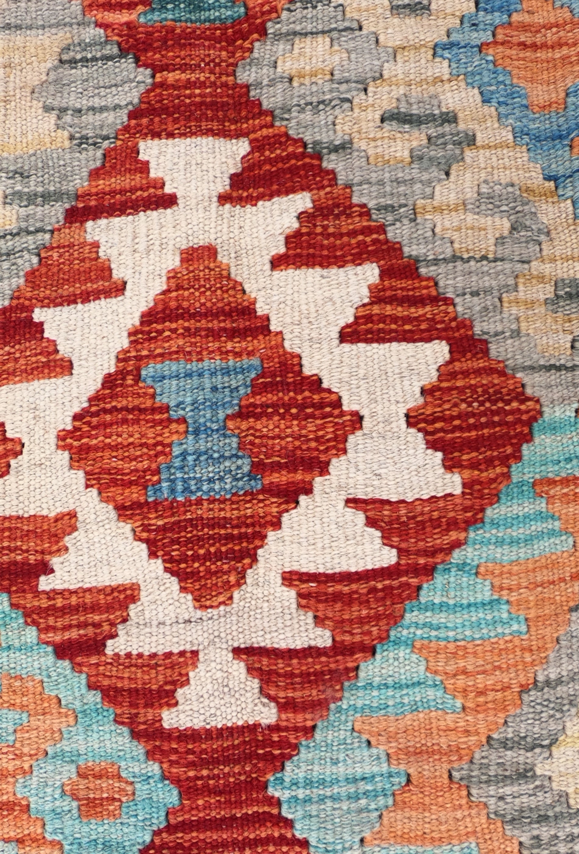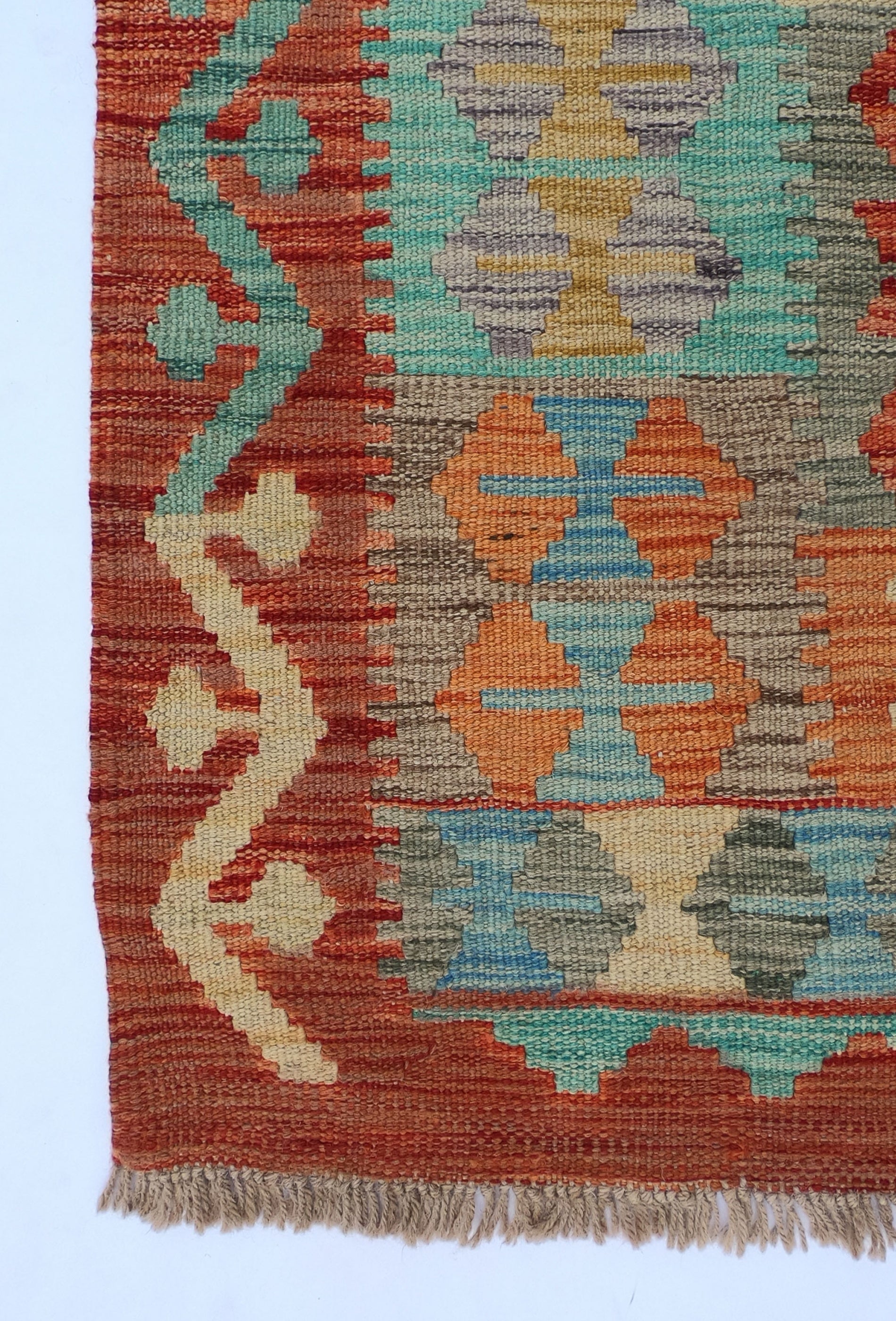 Alfombra de lana tejida en telar de origen Pakistaní, teñida con tintes naturales. Fabricada según la técnica tradicional de tejido de fisura. Esta alfombra se caracteriza por su tejido plano, diseños geométricos y gran colorido.
