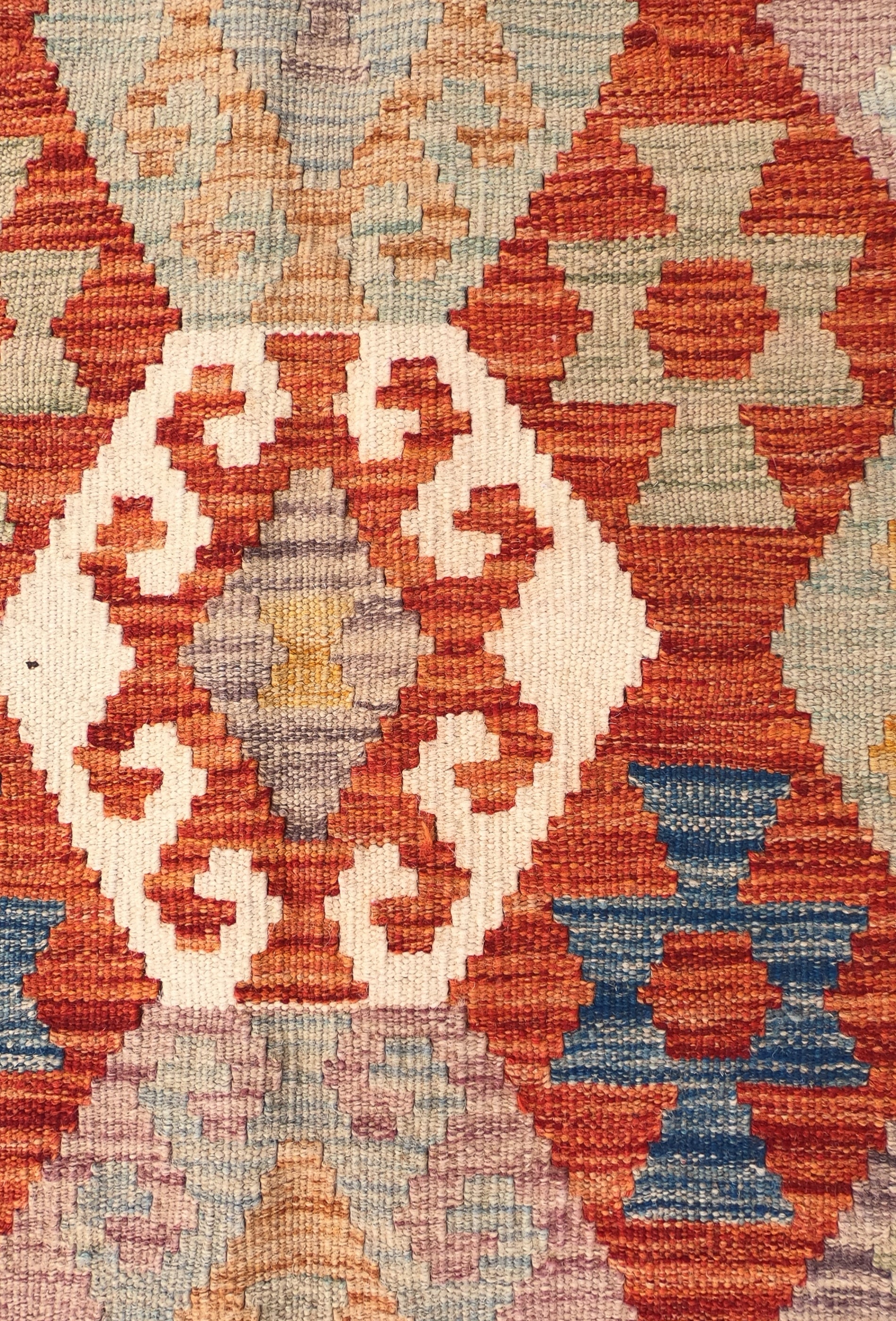 Alfombra de lana tejida en telar de origen Pakistaní, teñida con tintes naturales. Fabricada según la técnica tradicional de tejido de fisura. Esta alfombra se caracteriza por su tejido plano, diseños geométricos y gran colorido.
