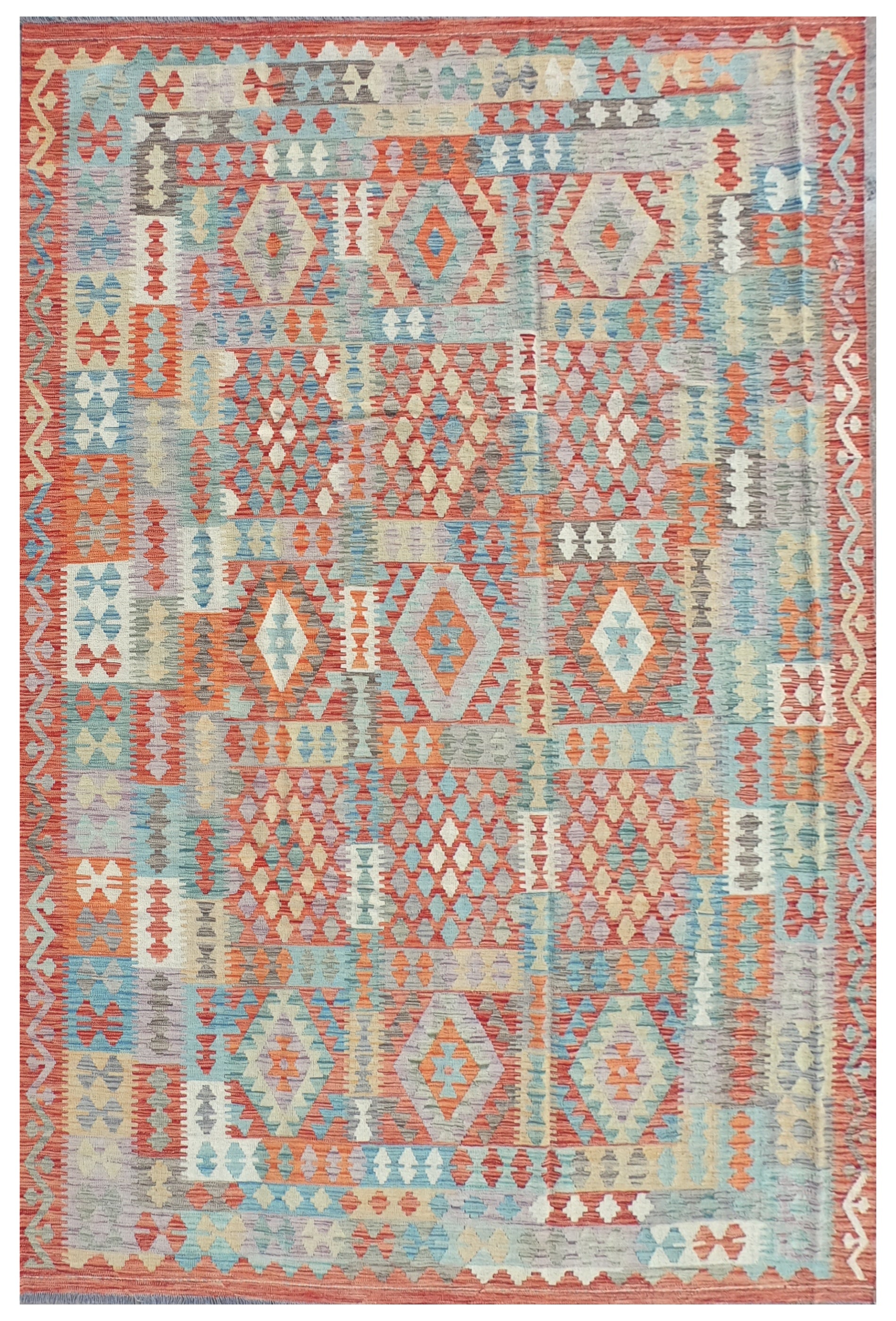 Alfombra de lana tejida en telar de origen Pakistaní, teñida con tintes naturales. Fabricada según la técnica tradicional de tejido de fisura. Esta alfombra se caracteriza por su tejido plano, diseños geométricos y gran colorido.