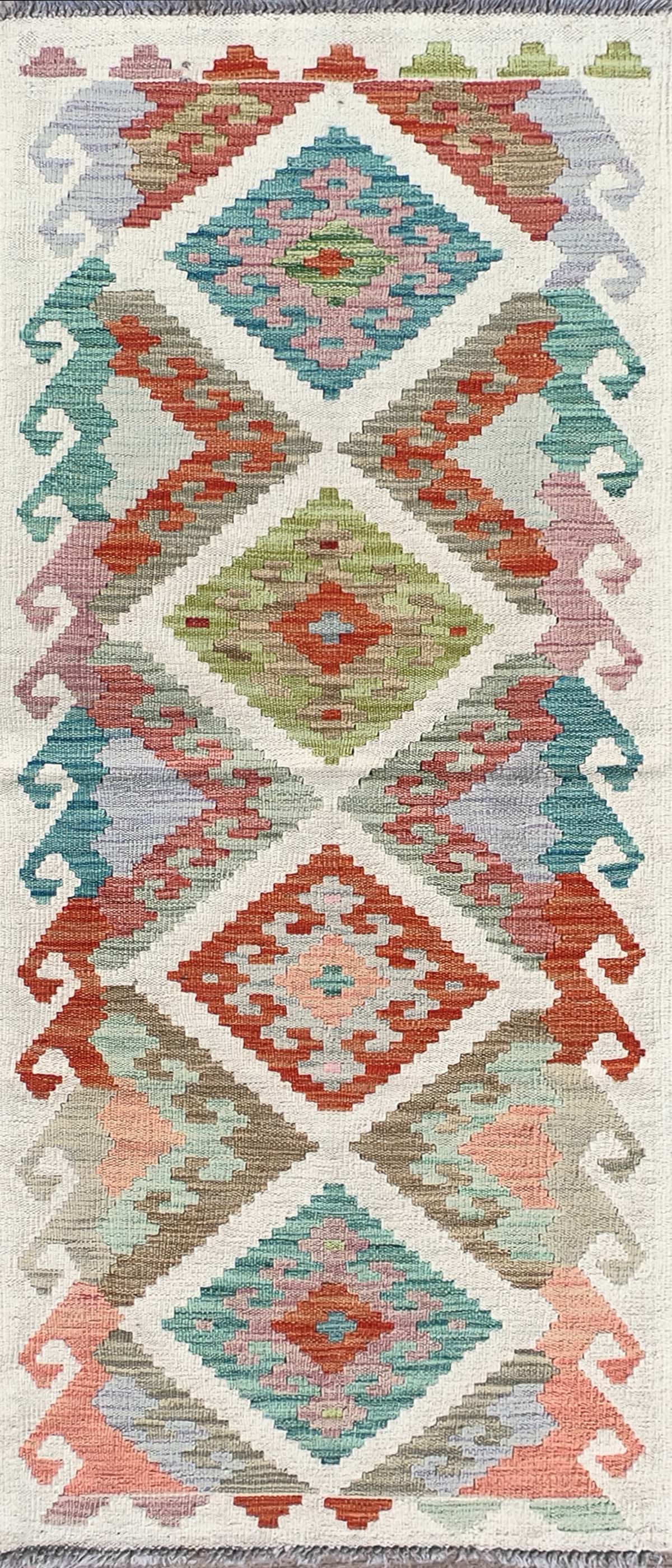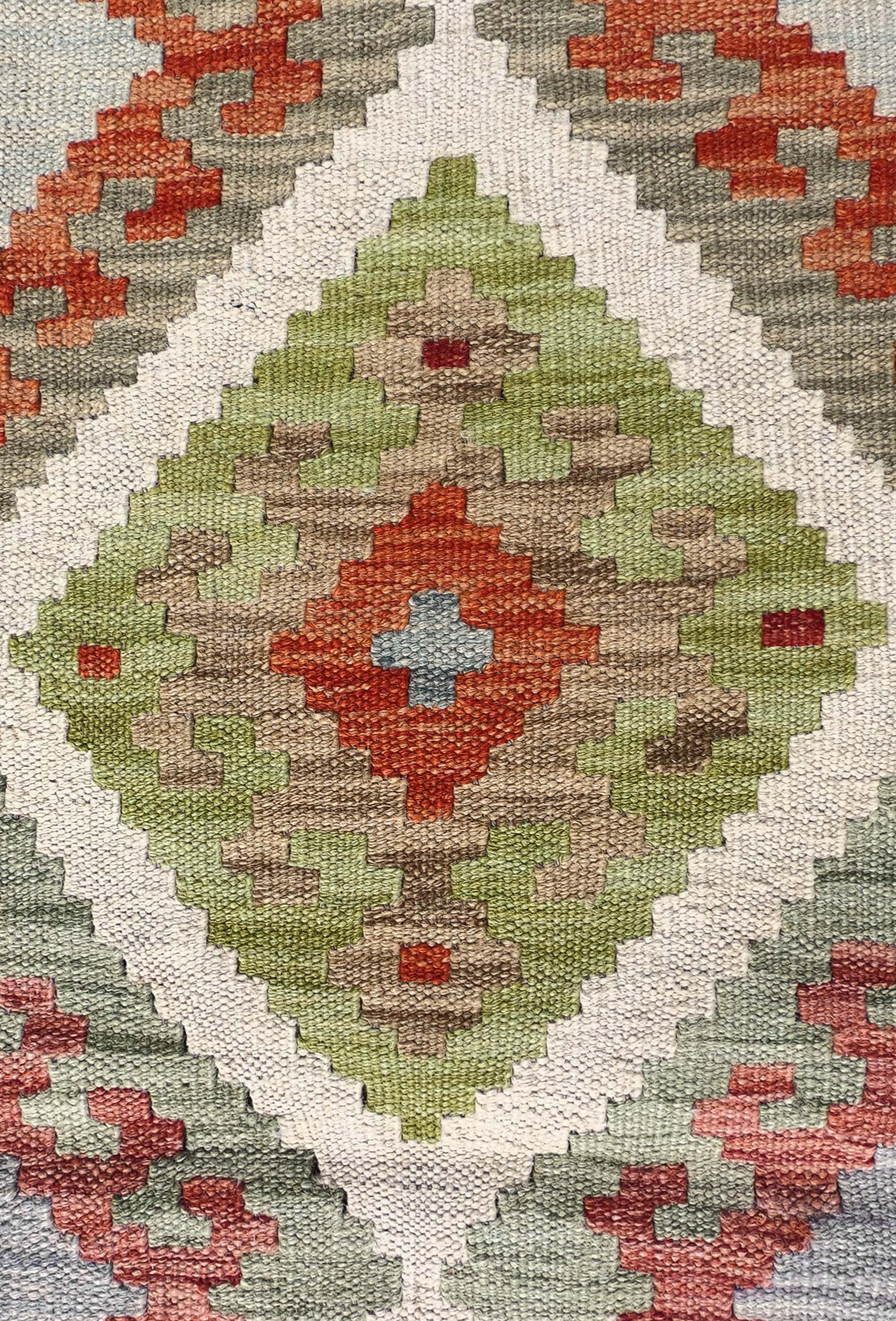 Alfombra de lana tejida en telar de origen Pakistaní, teñida con tintes naturales. Fabricada según la técnica tradicional de tejido de fisura. Esta alfombra se caracteriza por su tejido plano, diseños geométricos y gran colorido.