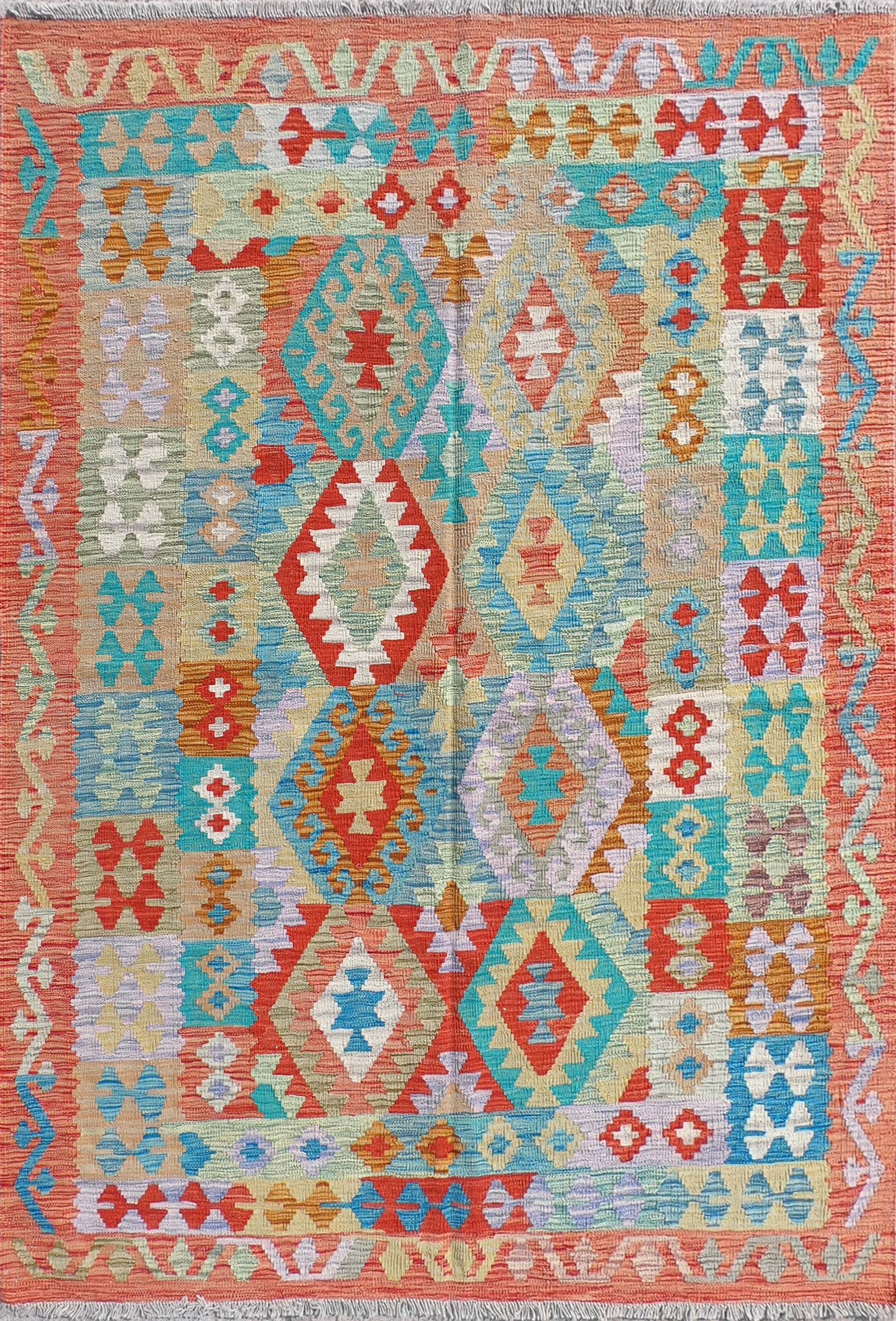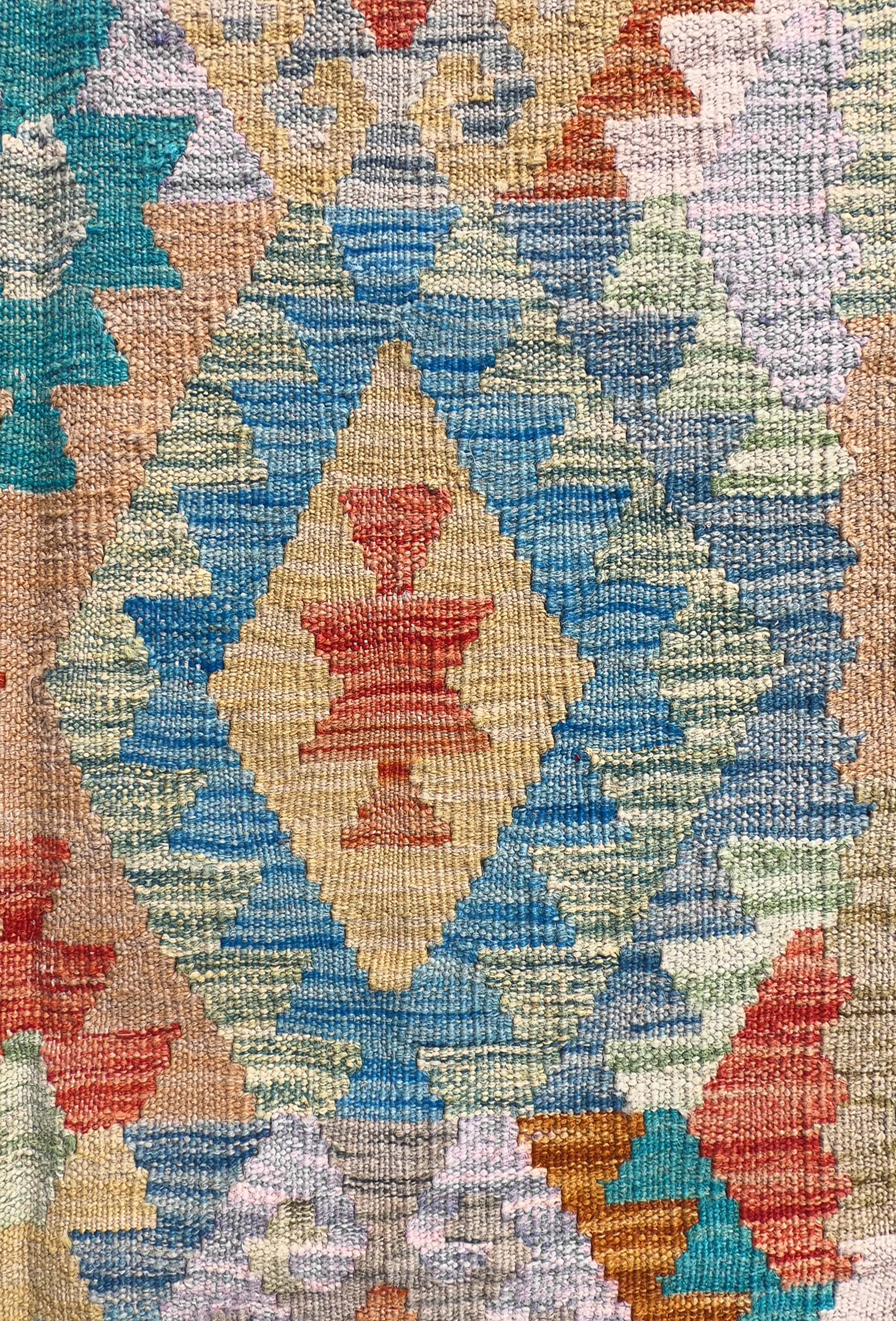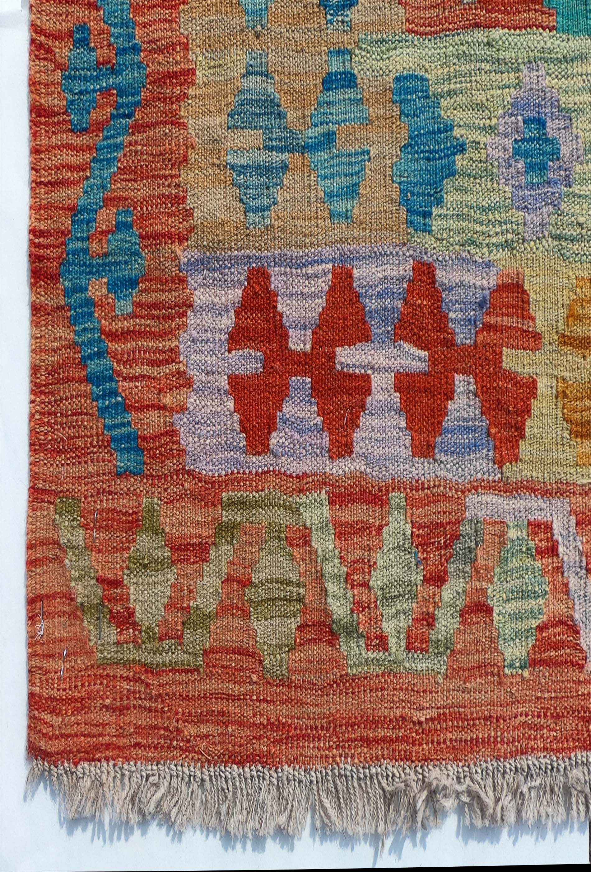 Alfombra de lana tejida en telar de origen Pakistaní, teñida con tintes naturales. Fabricada según la técnica tradicional de tejido de fisura. Esta alfombra se caracteriza por su tejido plano, diseños geométricos y gran colorido.