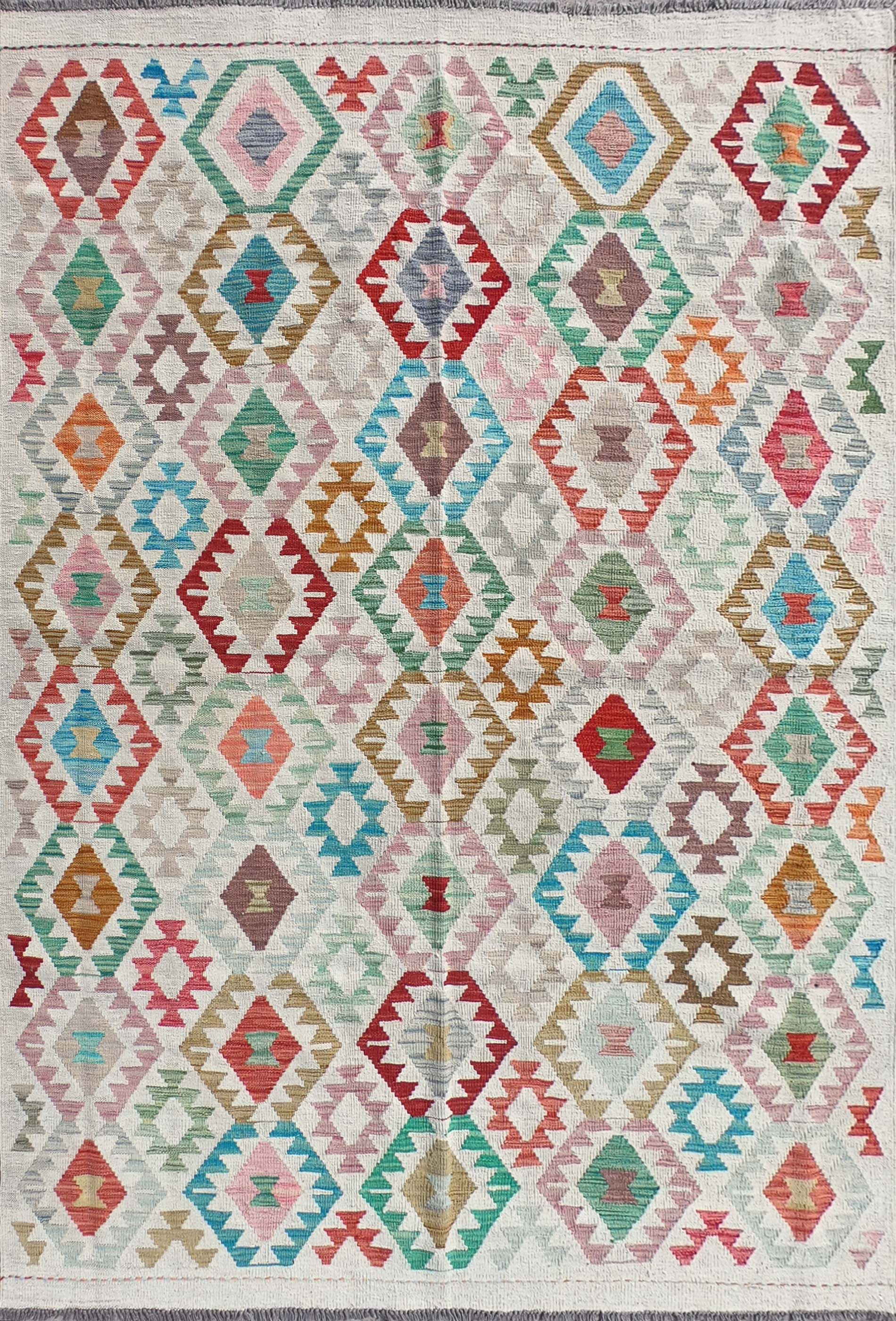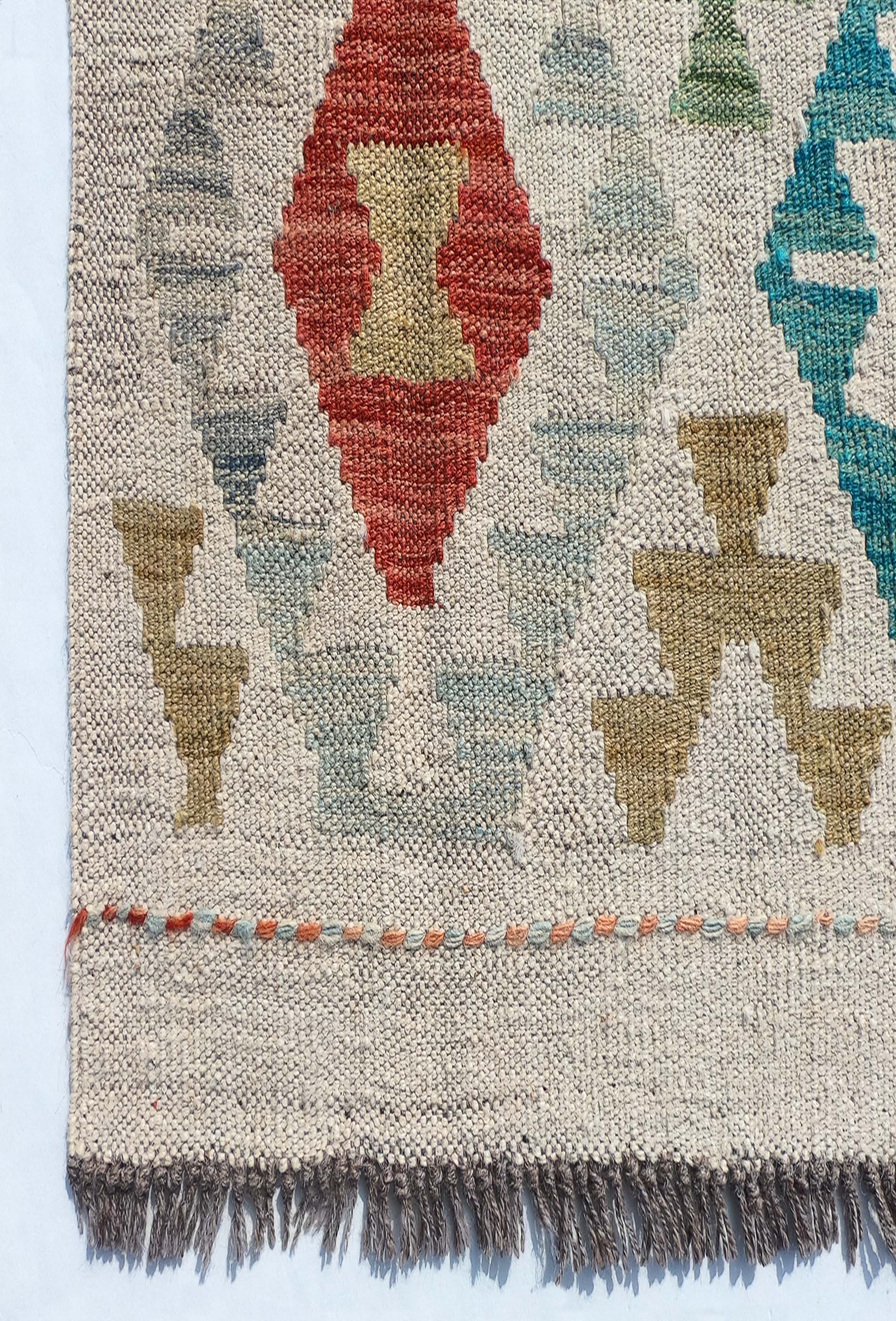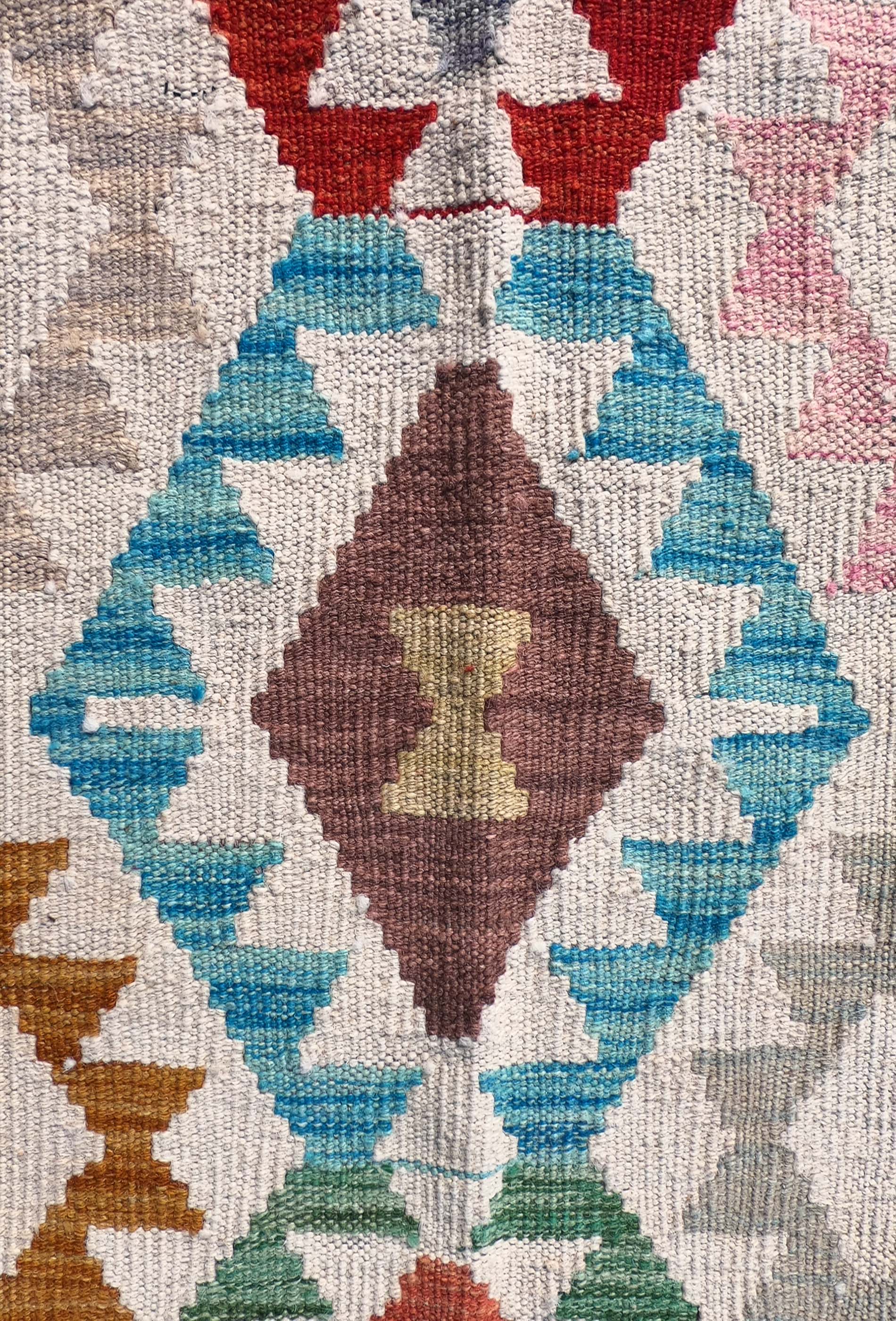 Alfombra de lana tejida en telar de origen Pakistaní, teñida con tintes naturales. Fabricada según la técnica tradicional de tejido de fisura. Esta alfombra se caracteriza por su tejido plano, diseños geométricos y gran colorido.