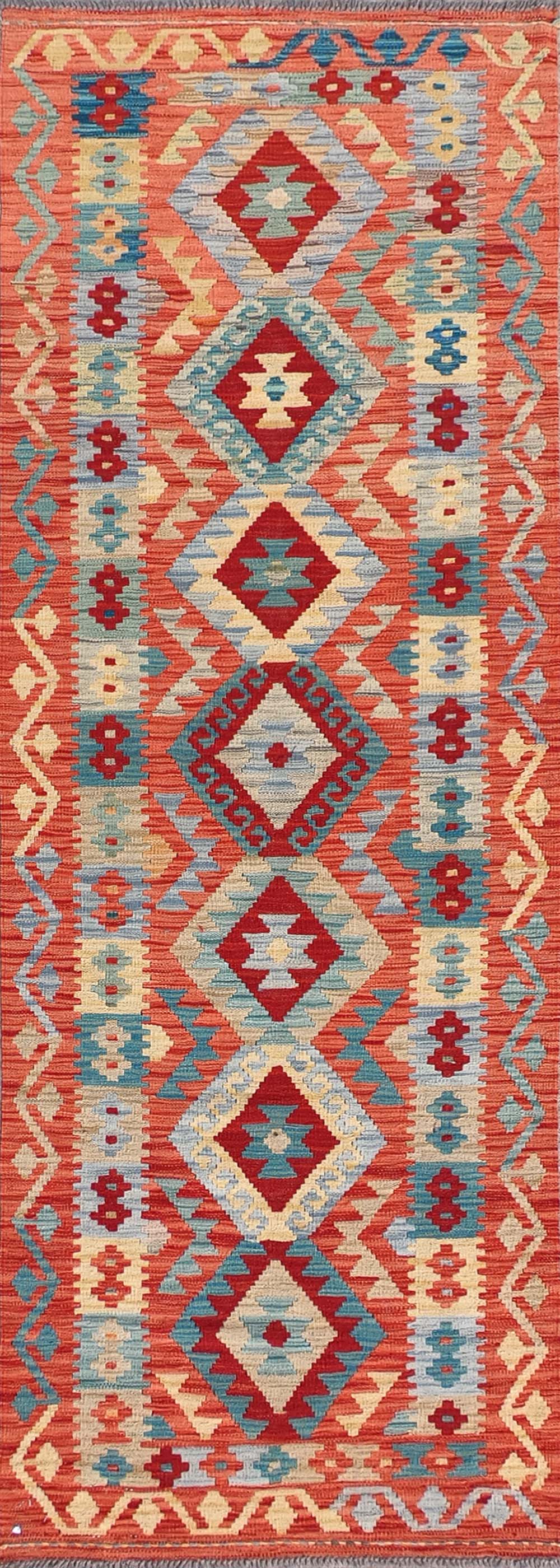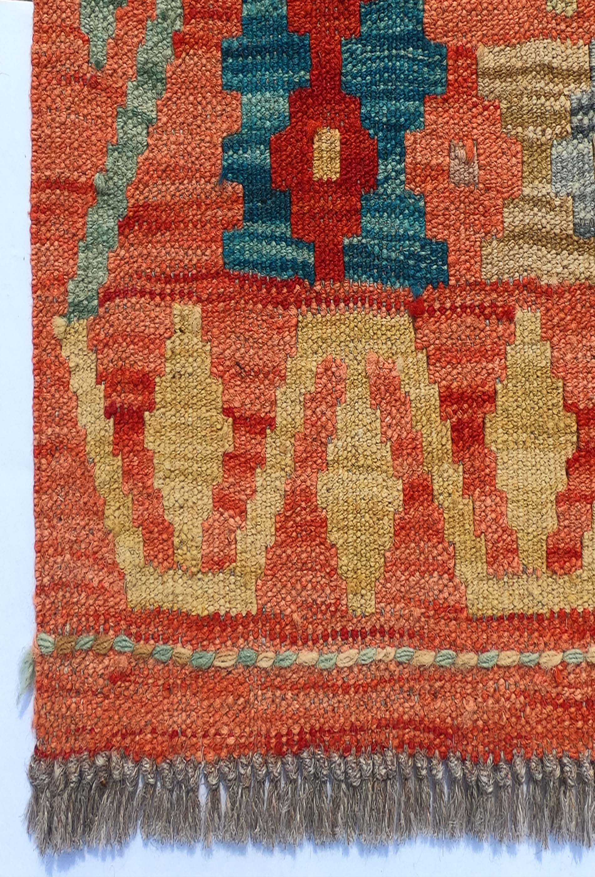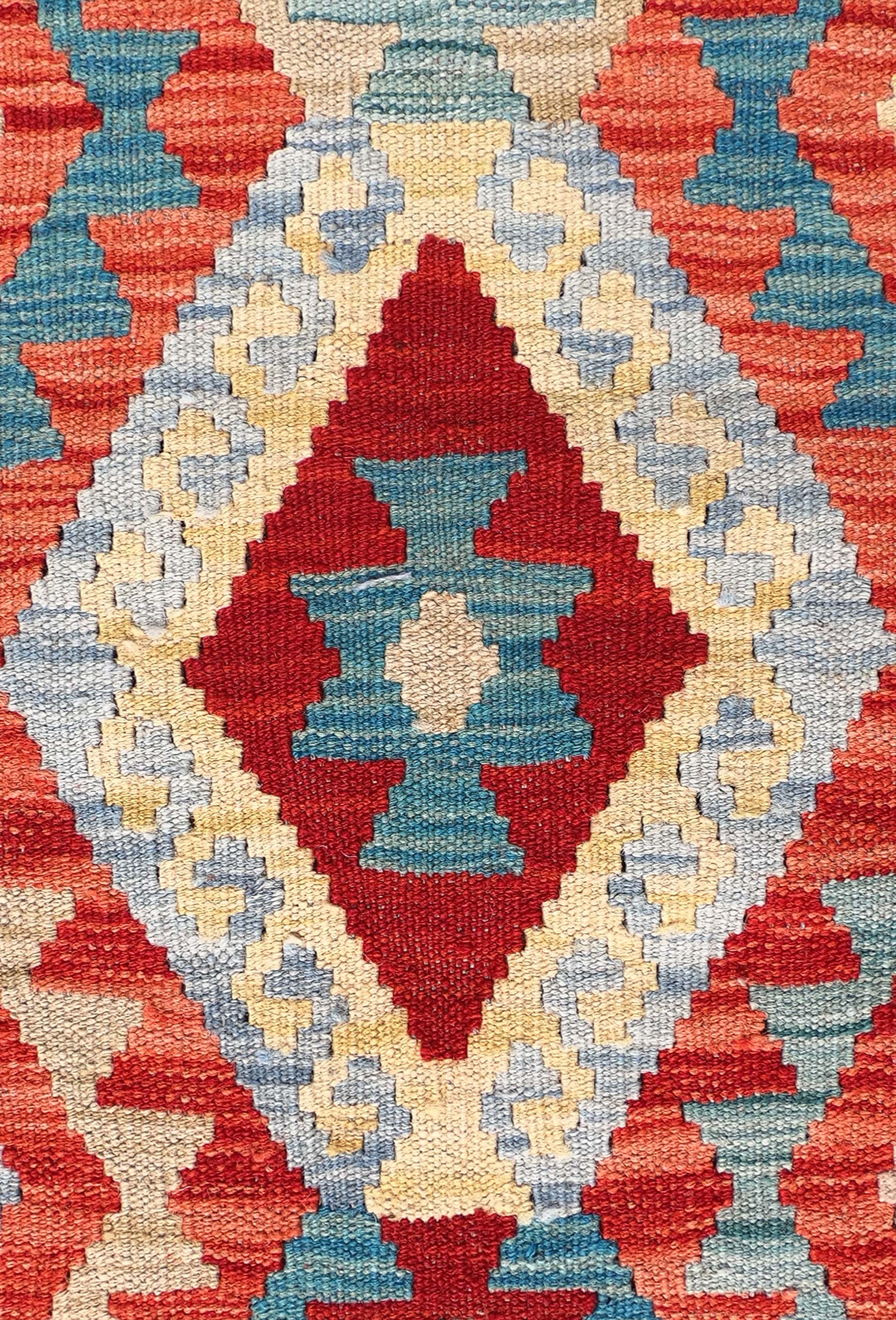 Alfombra de lana tejida en telar de origen Pakistaní, teñida con tintes naturales. Fabricada según la técnica tradicional de tejido de fisura. Esta alfombra se caracteriza por su tejido plano, diseños geométricos y gran colorido.