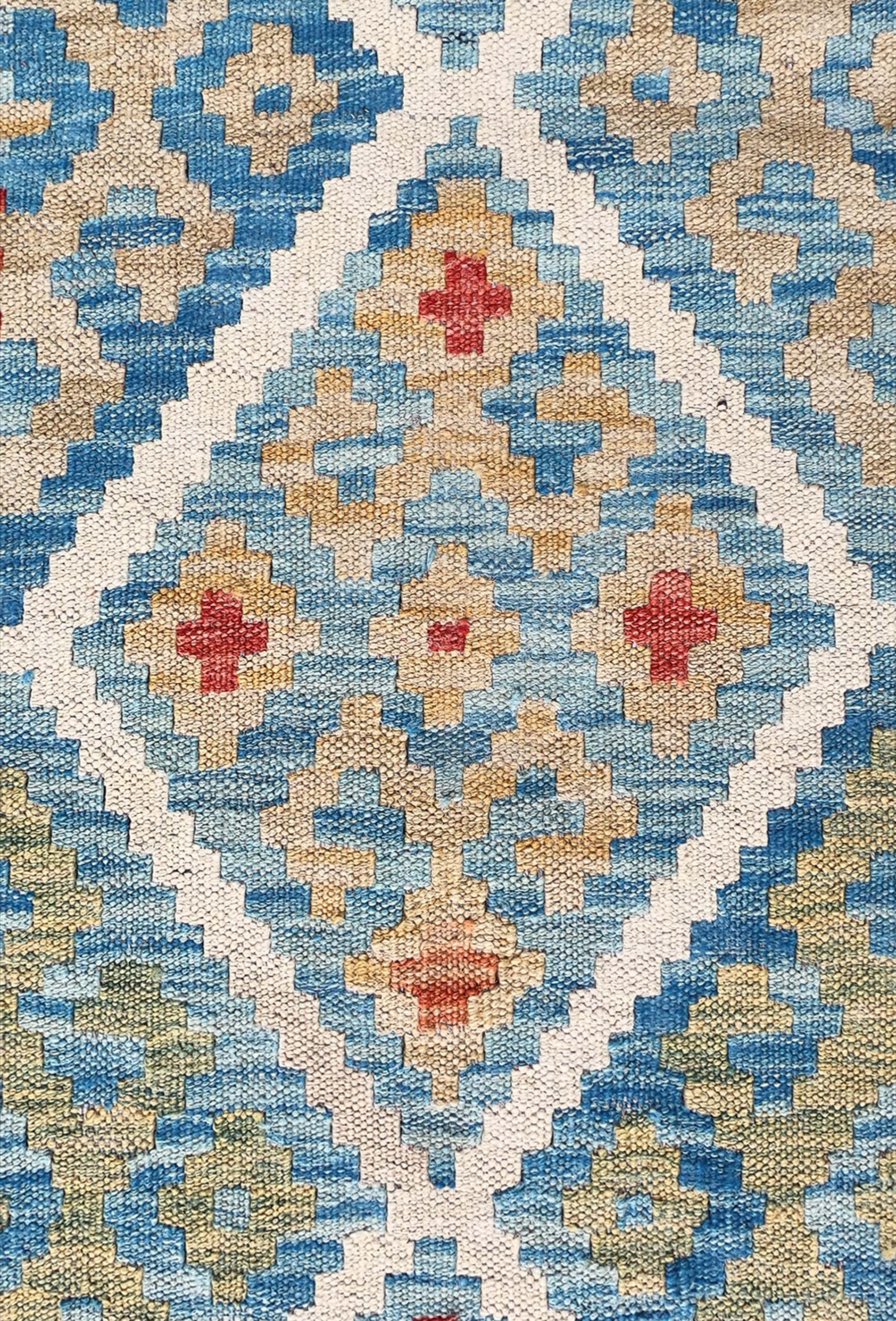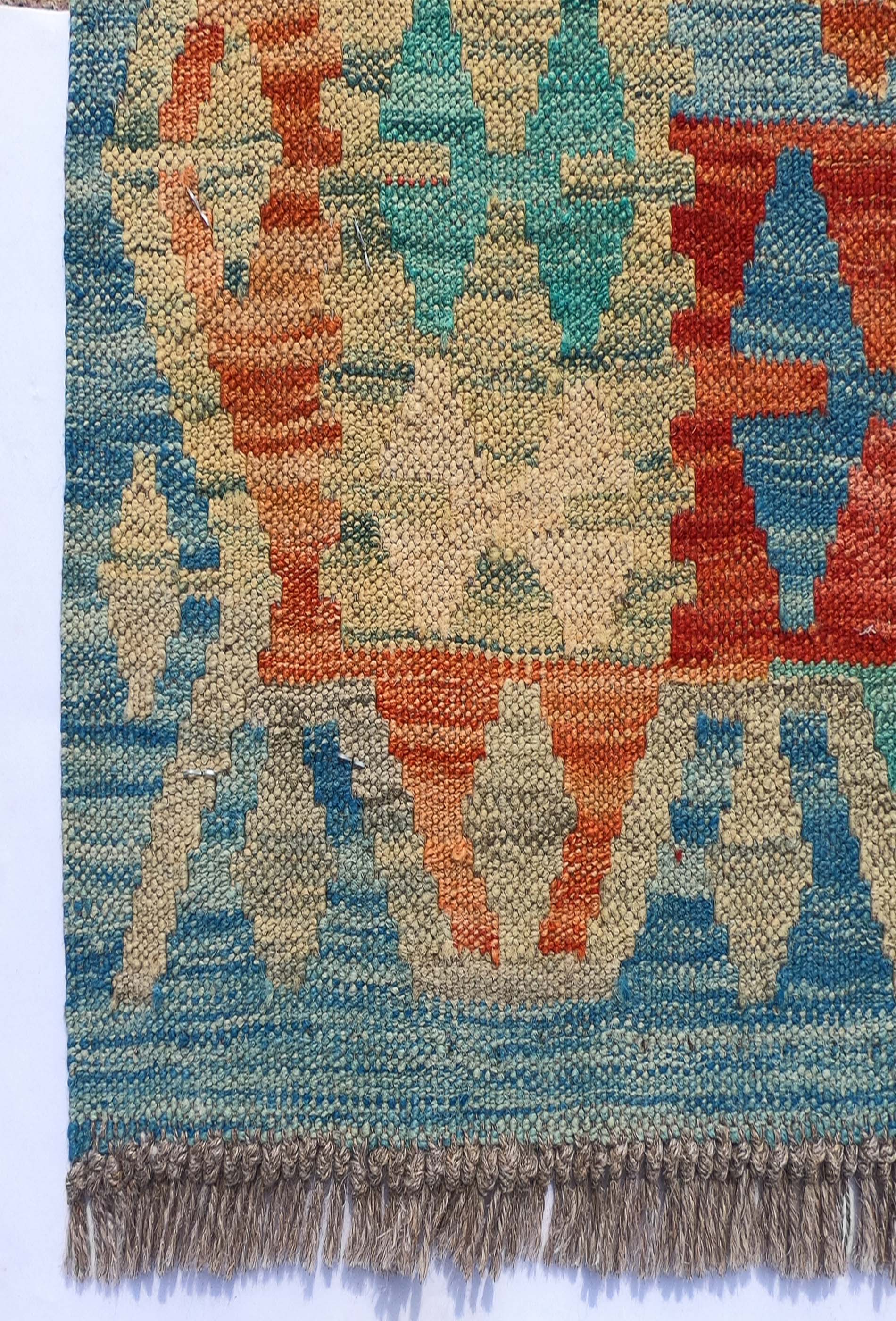 Alfombra de lana tejida en telar de origen Pakistaní, teñida con tintes naturales. Fabricada según la técnica tradicional de tejido de fisura. Esta alfombra se caracteriza por su tejido plano, diseños geométricos y gran colorido.