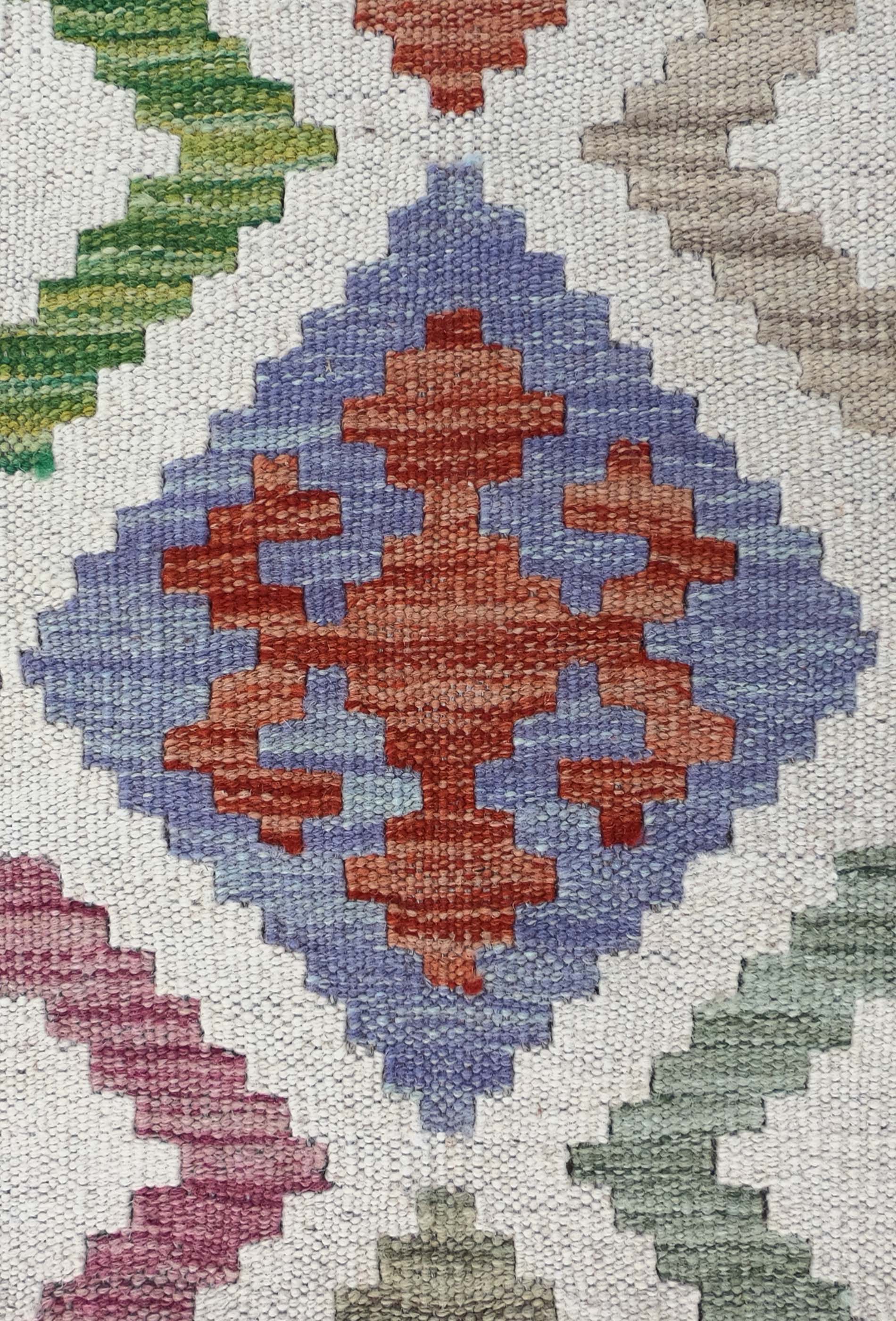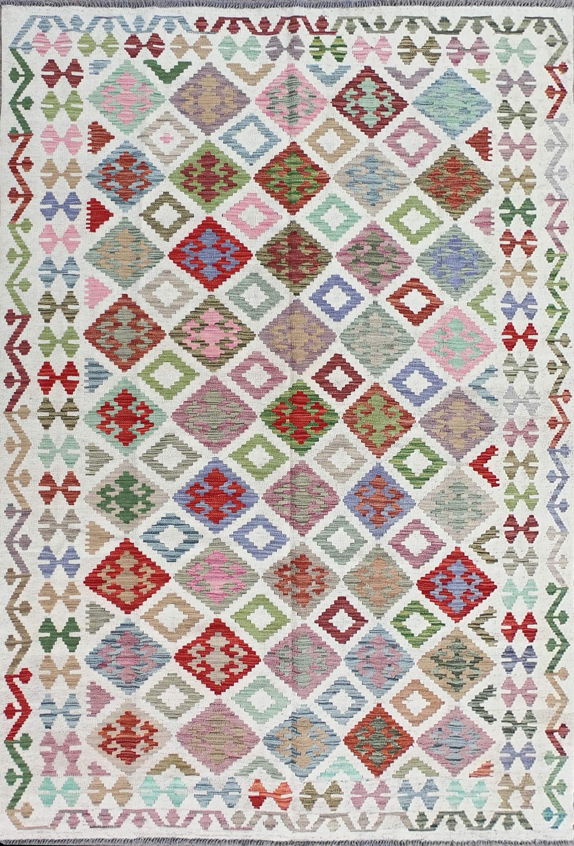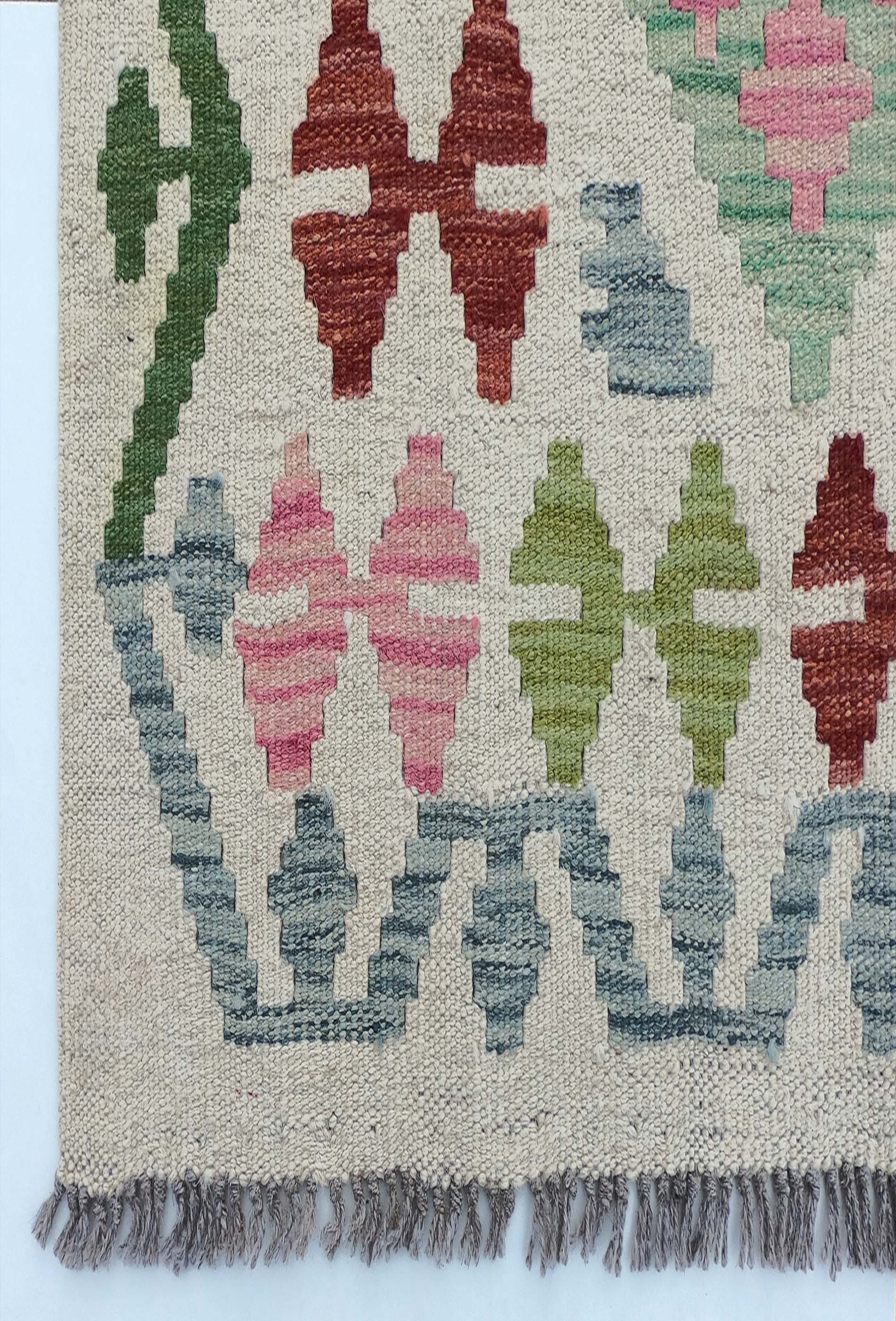 Alfombra de lana tejida en telar de origen Pakistaní, teñida con tintes naturales. Fabricada según la técnica tradicional de tejido de fisura. Esta alfombra se caracteriza por su tejido plano, diseños geométricos y gran colorido.