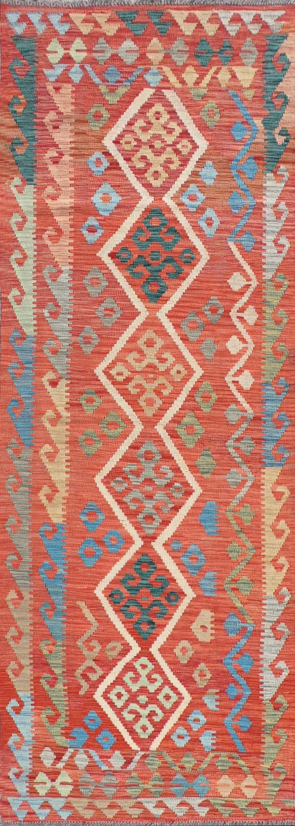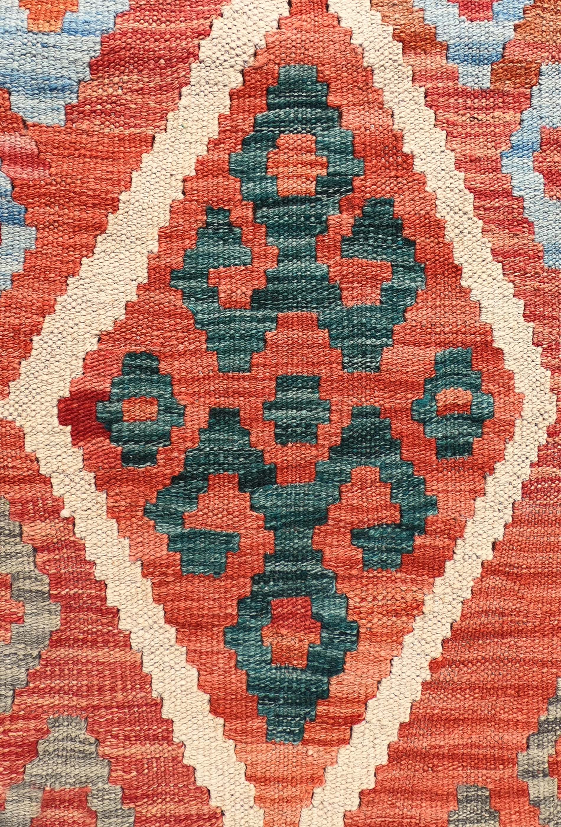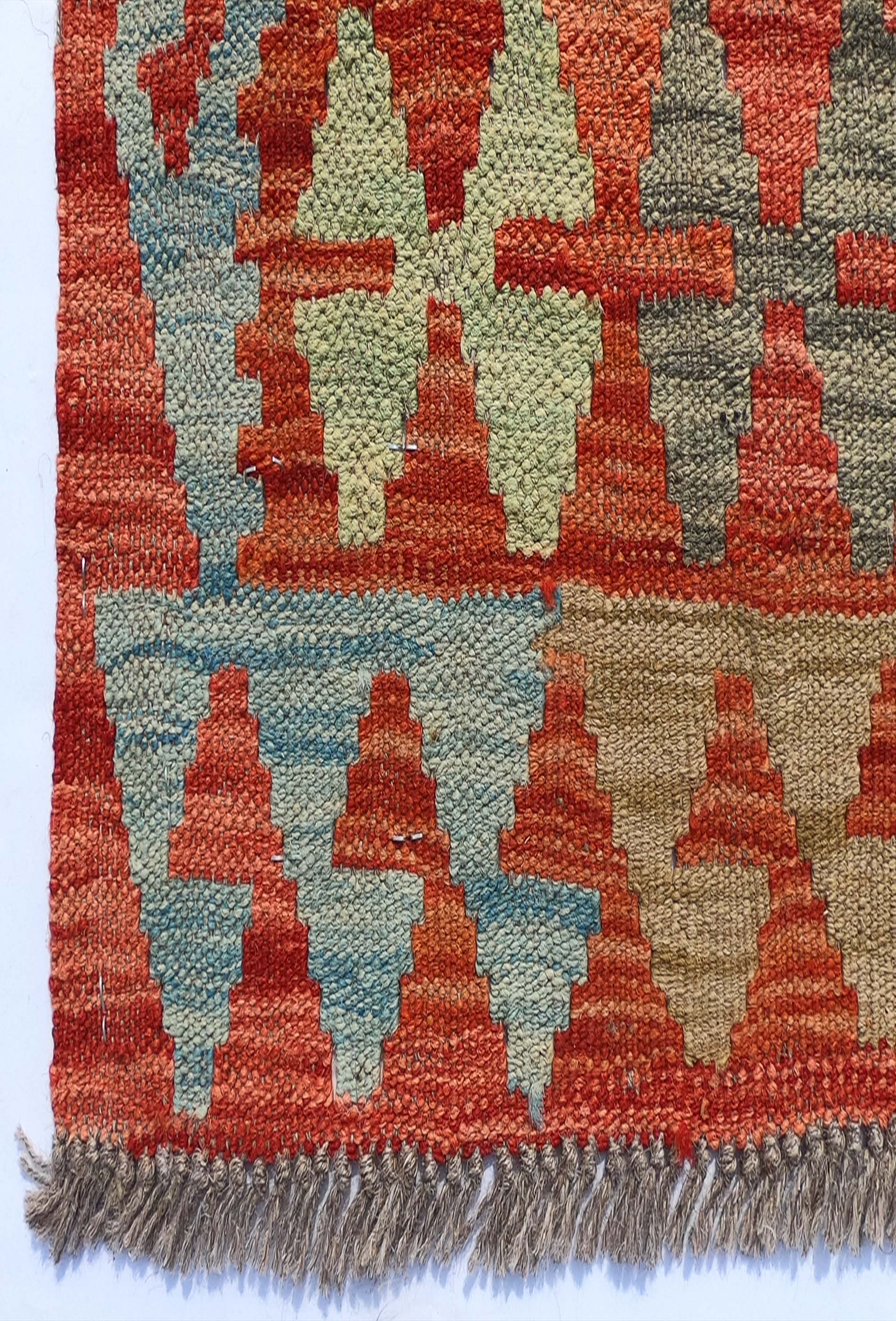 Alfombra de lana tejida en telar de origen Pakistaní, teñida con tintes naturales. Fabricada según la técnica tradicional de tejido de fisura. Esta alfombra se caracteriza por su tejido plano, diseños geométricos y gran colorido.