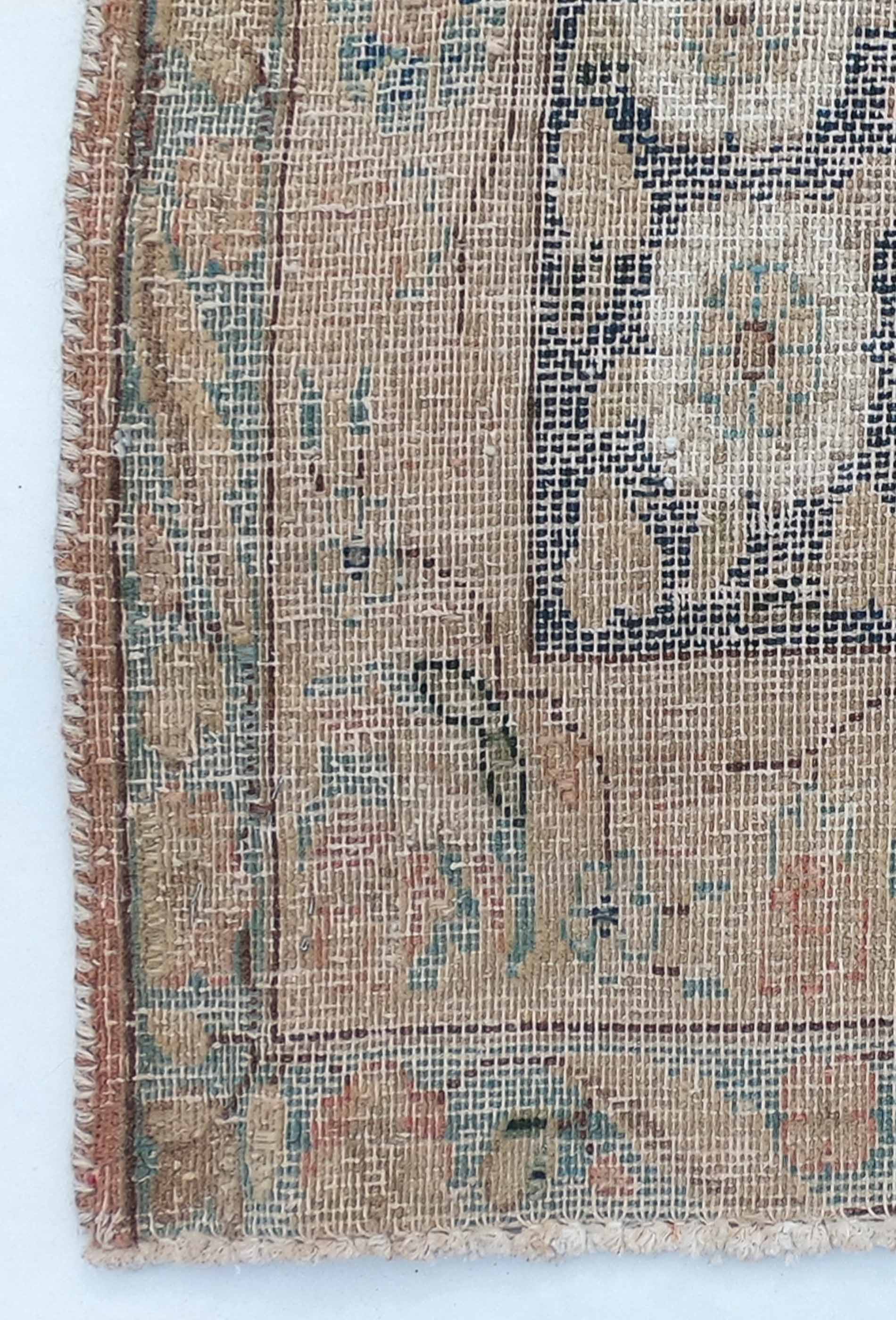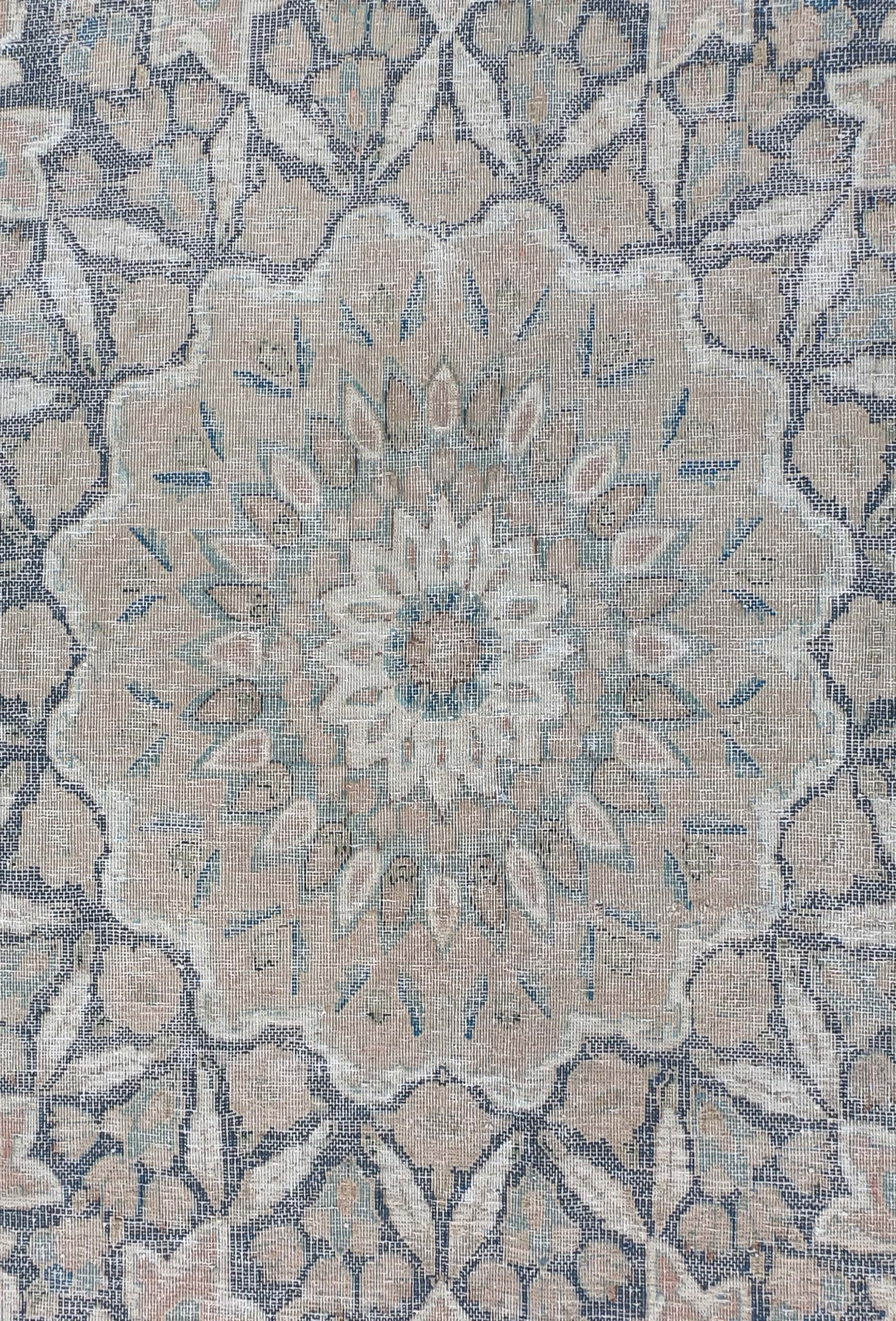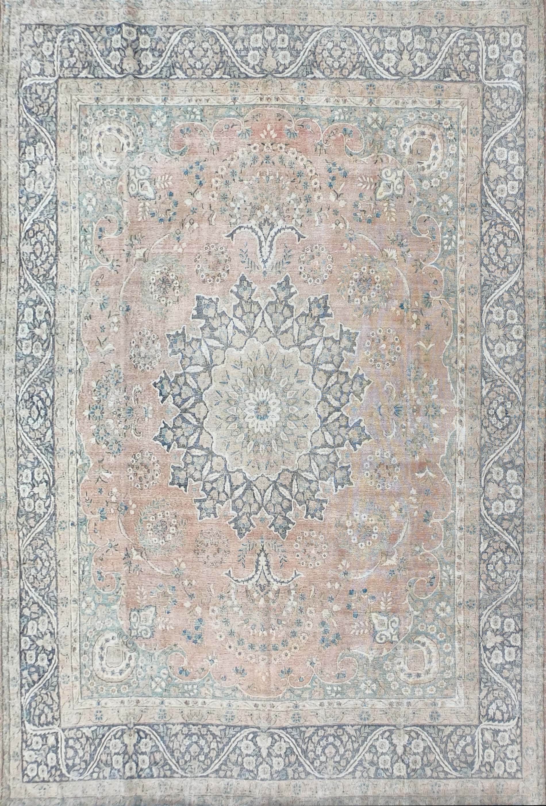 Alfombra Karim de origen Iraní. Esta alfombra fue desgastada cuidadosamente y sometida a un proceso de neutralización para darle una apariencia desgastada de manera intencional. Anudadas completamente a mano.