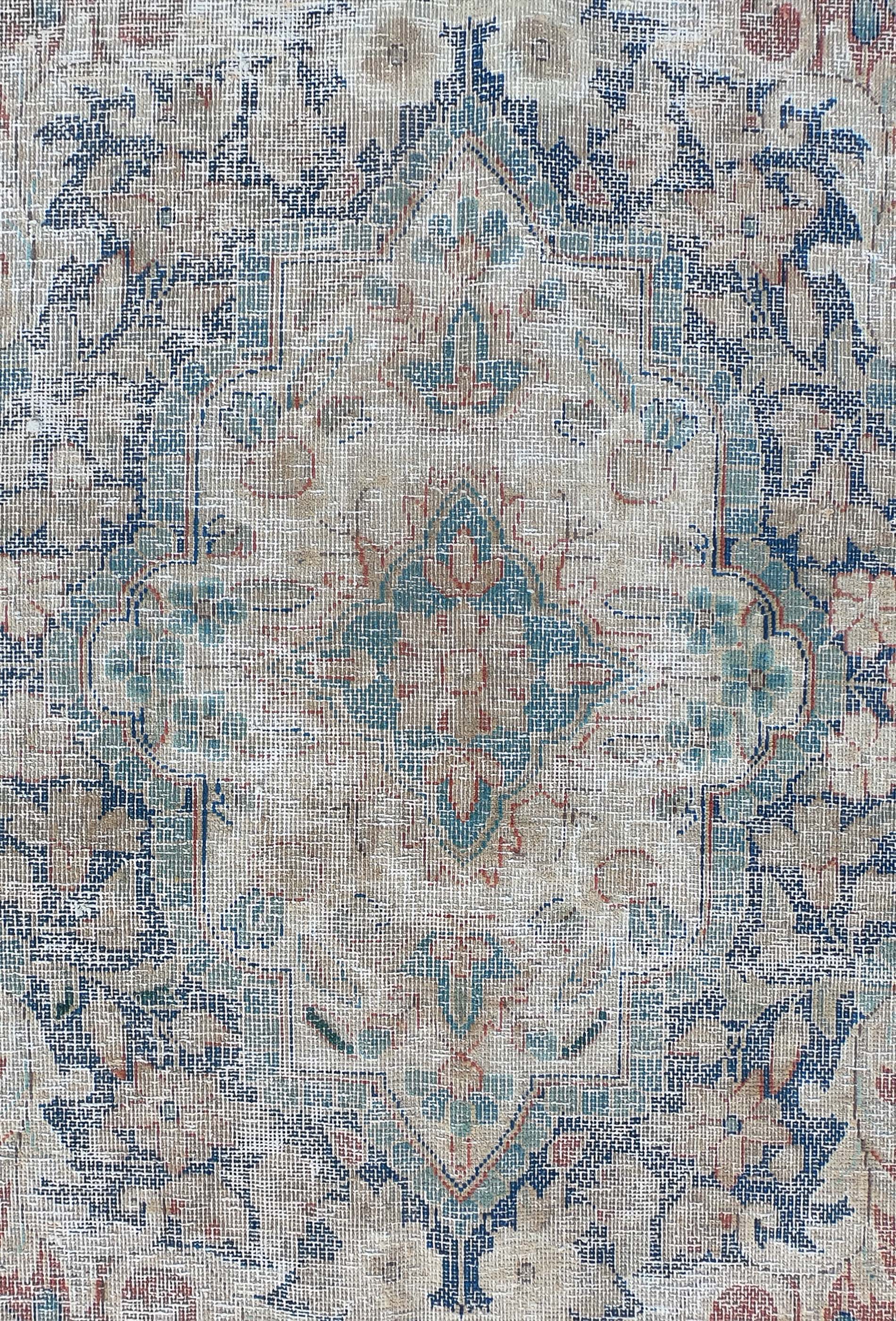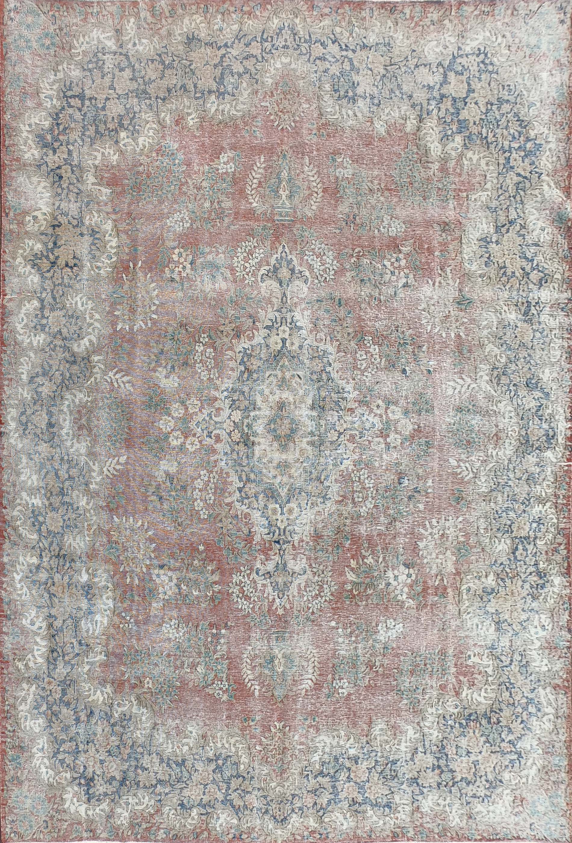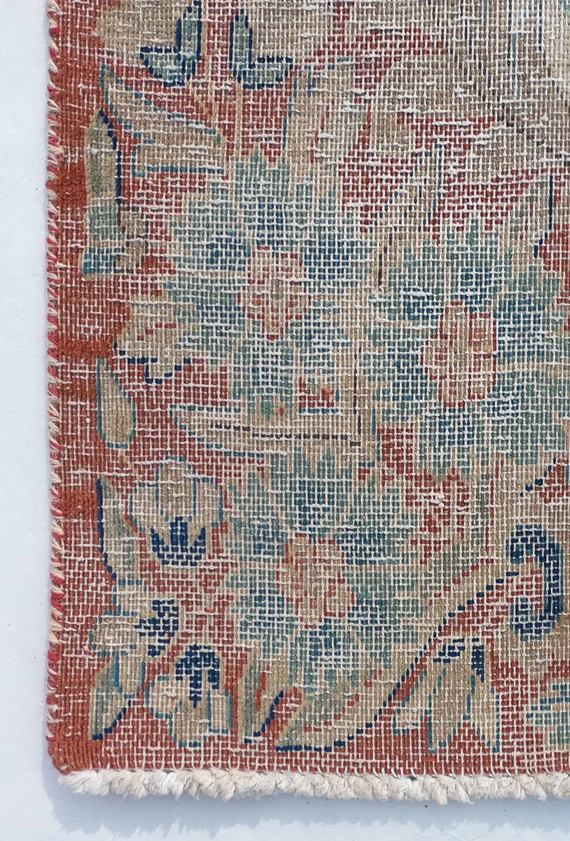 Alfombra Karim de origen Iraní. Esta alfombra fue desgastada cuidadosamente y sometida a un proceso de neutralización para darle una apariencia desgastada de manera intencional. Anudadas completamente a mano.
