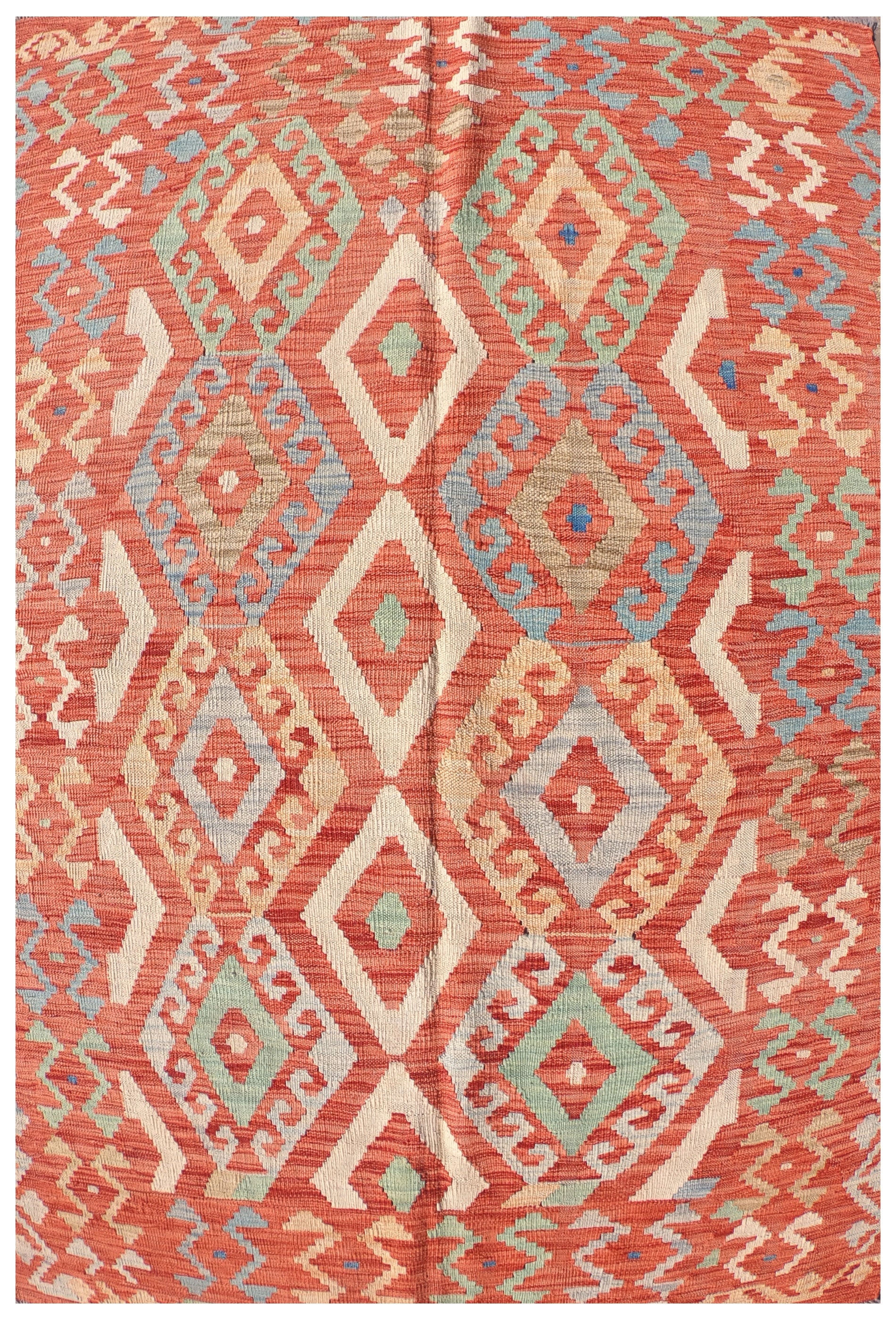 Alfombra de lana tejida en telar de origen Pakistaní, teñida con tintes naturales. Fabricada según la técnica tradicional de tejido de fisura. Esta alfombra se caracteriza por su tejido plano, diseños geométricos y gran colorido.