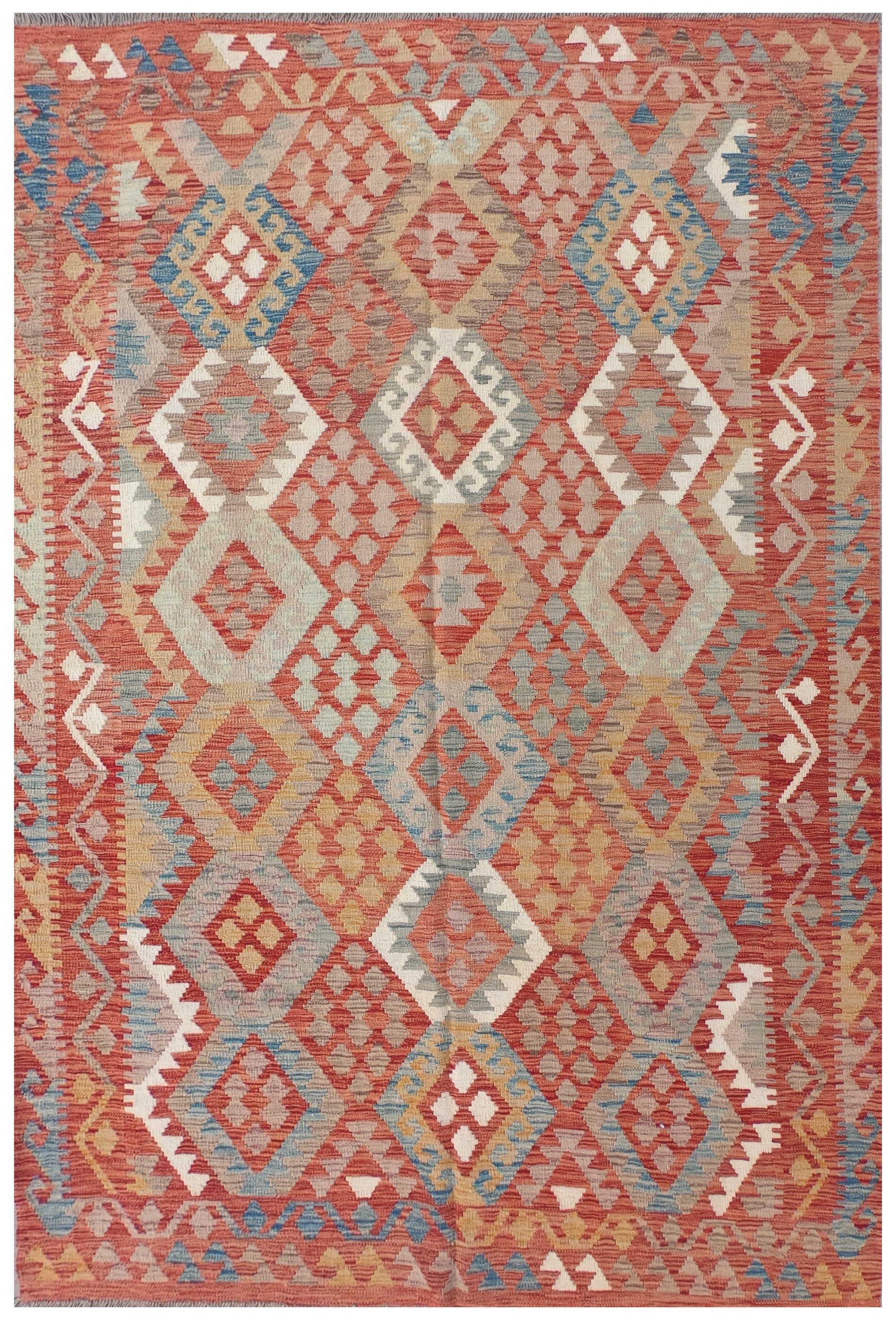 Alfombra de lana tejida en telar de origen Pakistaní, teñida con tintes naturales. Fabricada según la técnica tradicional de tejido de fisura. Esta alfombra se caracteriza por su tejido plano, diseños geométricos y gran colorido.