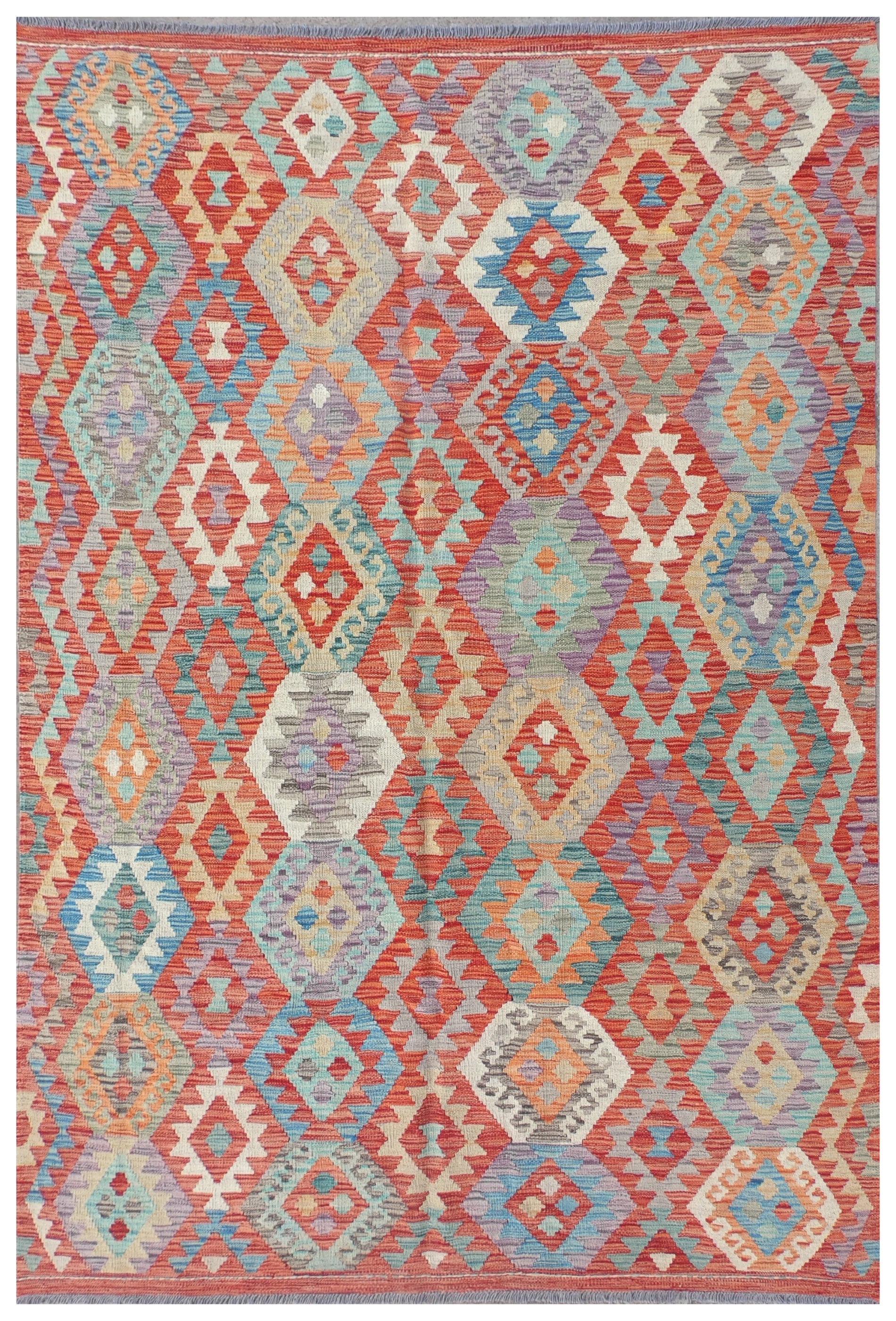 Alfombra de lana tejida en telar de origen Pakistaní, teñida con tintes naturales. Fabricada según la técnica tradicional de tejido de fisura. Esta alfombra se caracteriza por su tejido plano, diseños geométricos y gran colorido.