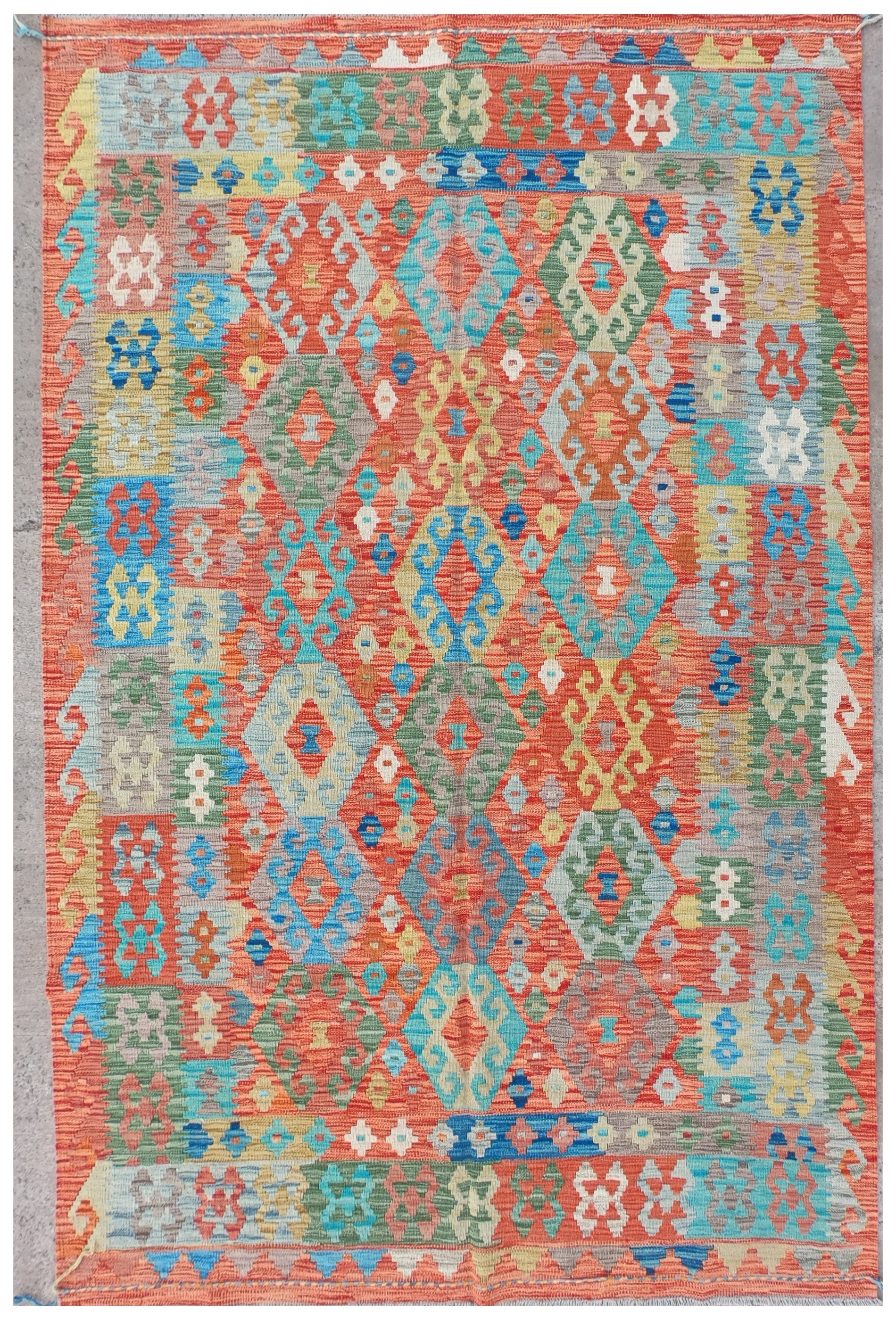 Alfombra de lana tejida en telar de origen Pakistaní, teñida con tintes naturales. Fabricada según la técnica tradicional de tejido de fisura. Esta alfombra se caracteriza por su tejido plano, diseños geométricos y gran colorido.