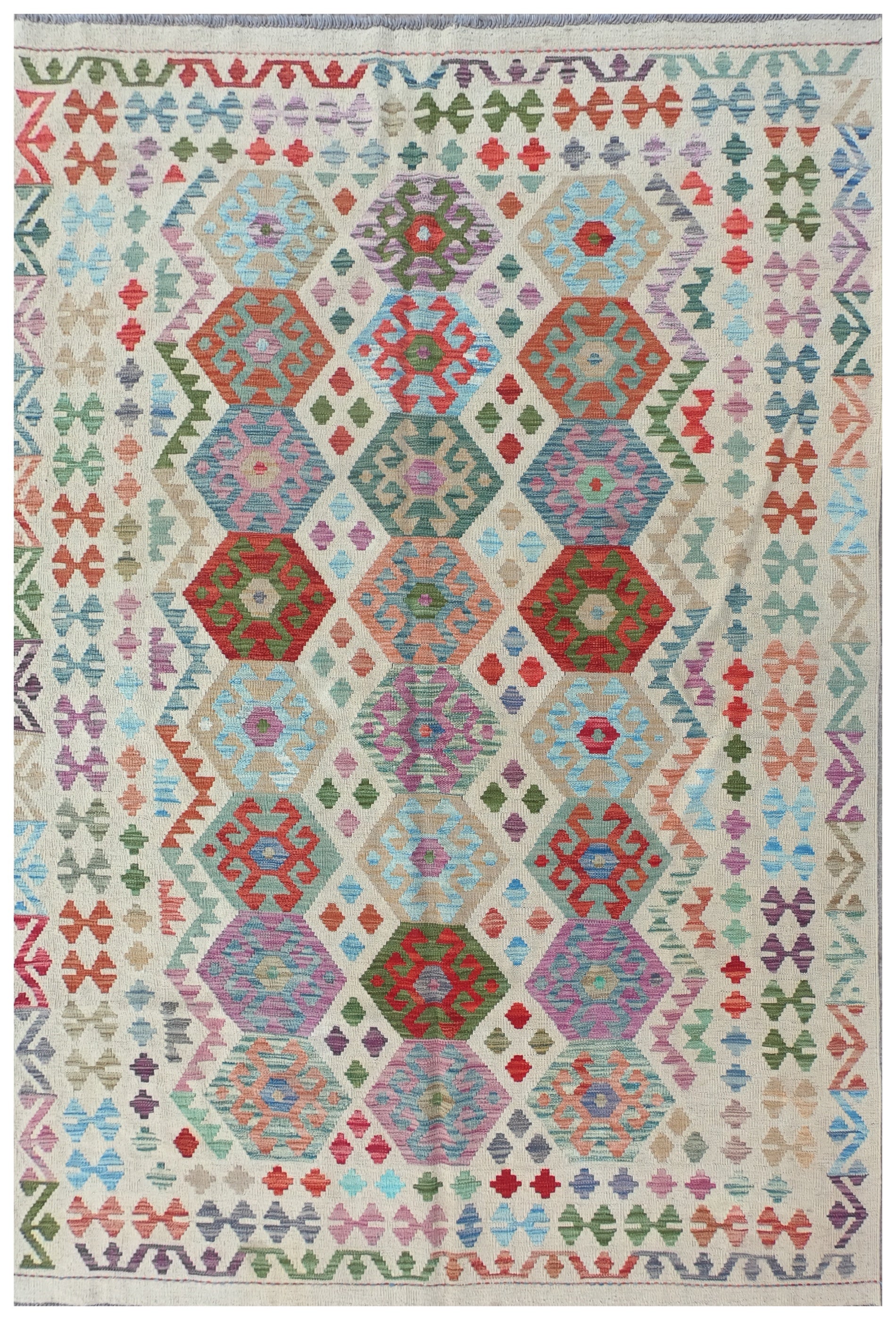 Alfombra de lana tejida en telar de origen Pakistaní, teñida con tintes naturales. Fabricada según la técnica tradicional de tejido de fisura. Esta alfombra se caracteriza por su tejido plano, diseños geométricos y gran colorido.
