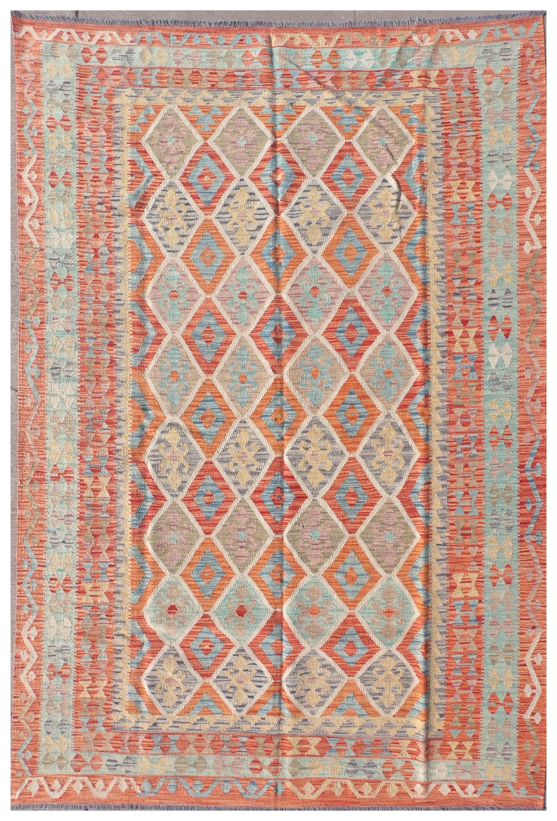 Alfombra de lana tejida en telar de origen Pakistaní, teñida con tintes naturales. Fabricada según la técnica tradicional de tejido de fisura. Esta alfombra se caracteriza por su tejido plano, diseños geométricos y gran colorido.