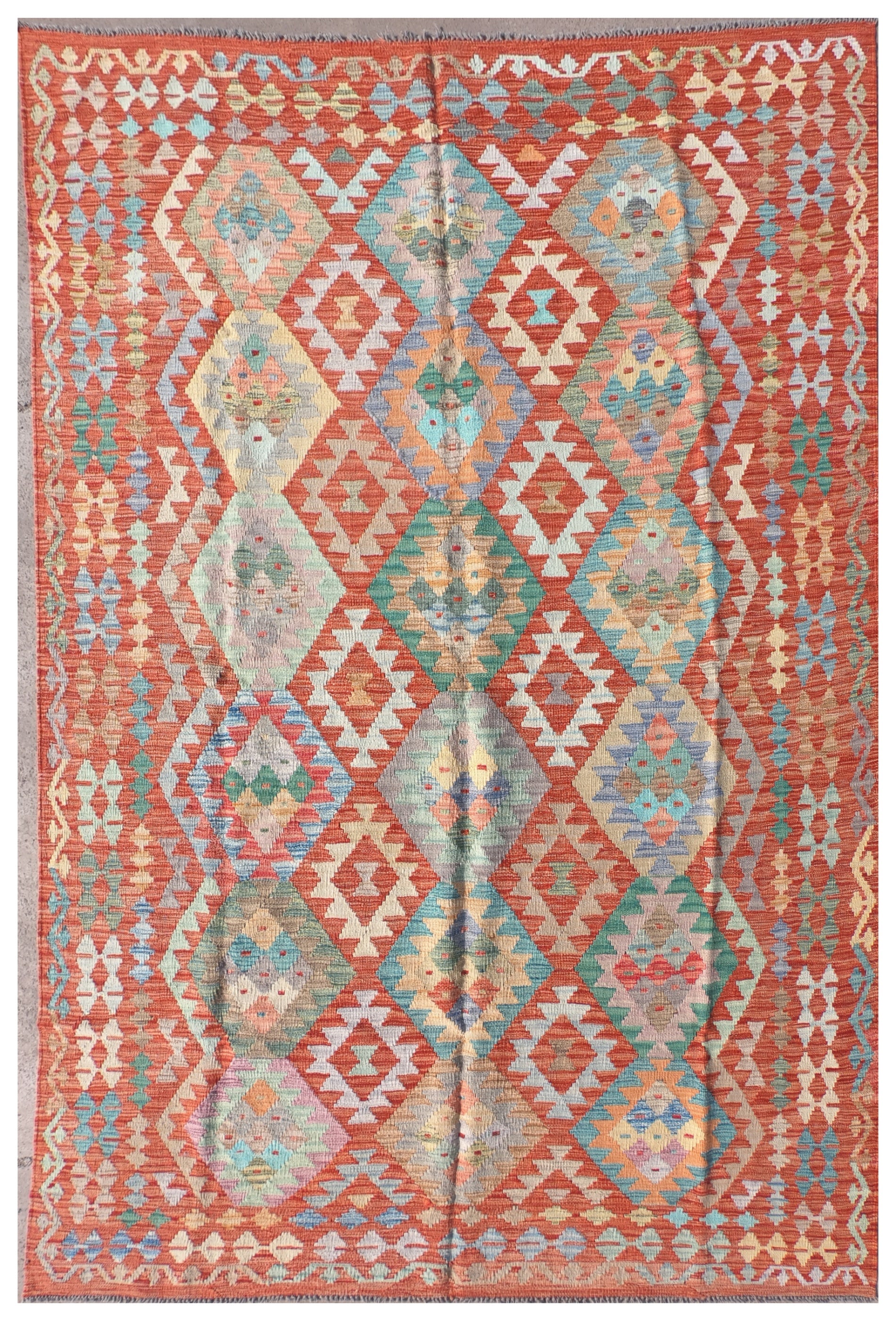 Alfombra de lana tejida en telar de origen Pakistaní, teñida con tintes naturales. Fabricada según la técnica tradicional de tejido de fisura. Esta alfombra se caracteriza por su tejido plano, diseños geométricos y gran colorido.