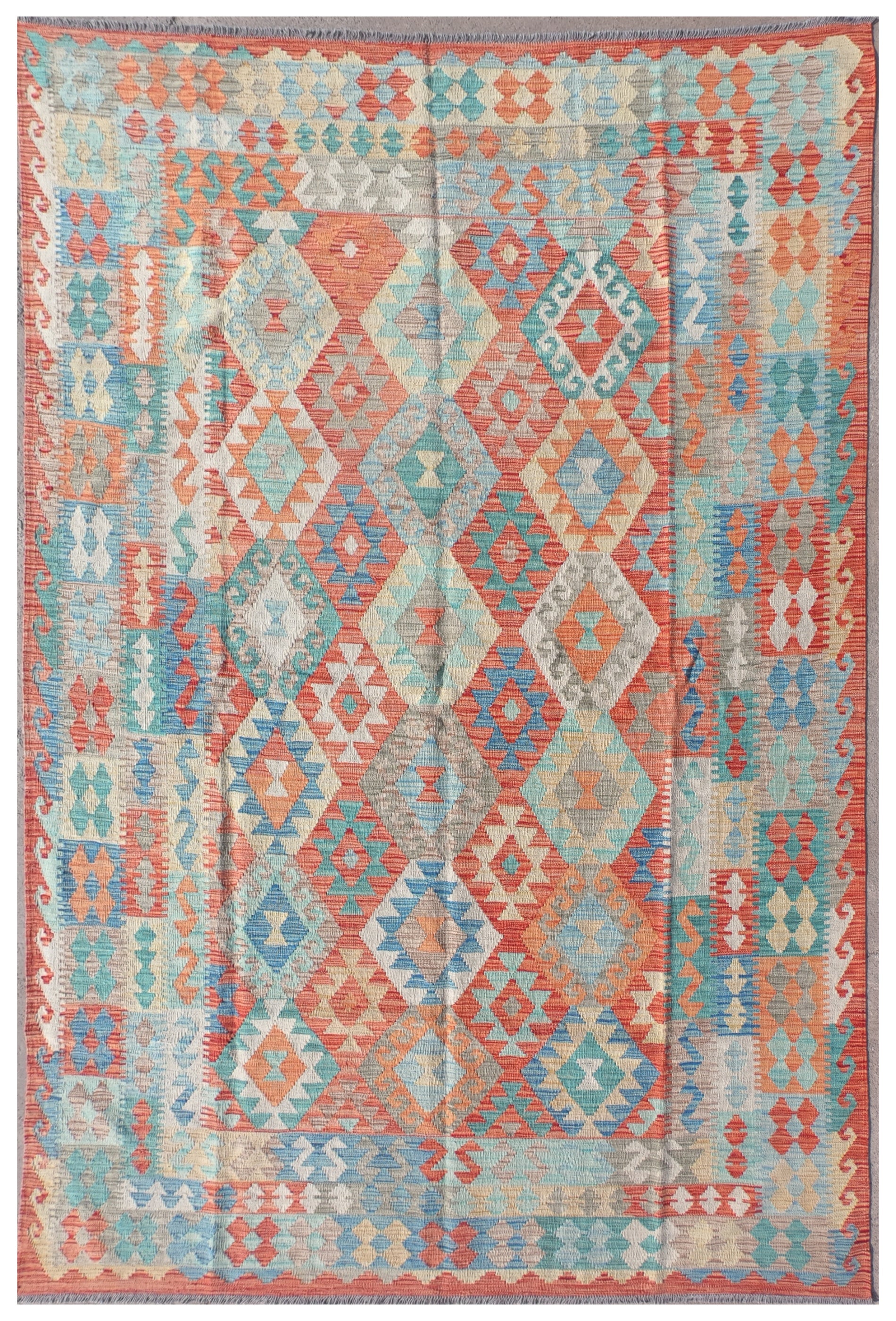 Alfombra de lana tejida en telar de origen Pakistaní, teñida con tintes naturales. Fabricada según la técnica tradicional de tejido de fisura. Esta alfombra se caracteriza por su tejido plano, diseños geométricos y gran colorido.