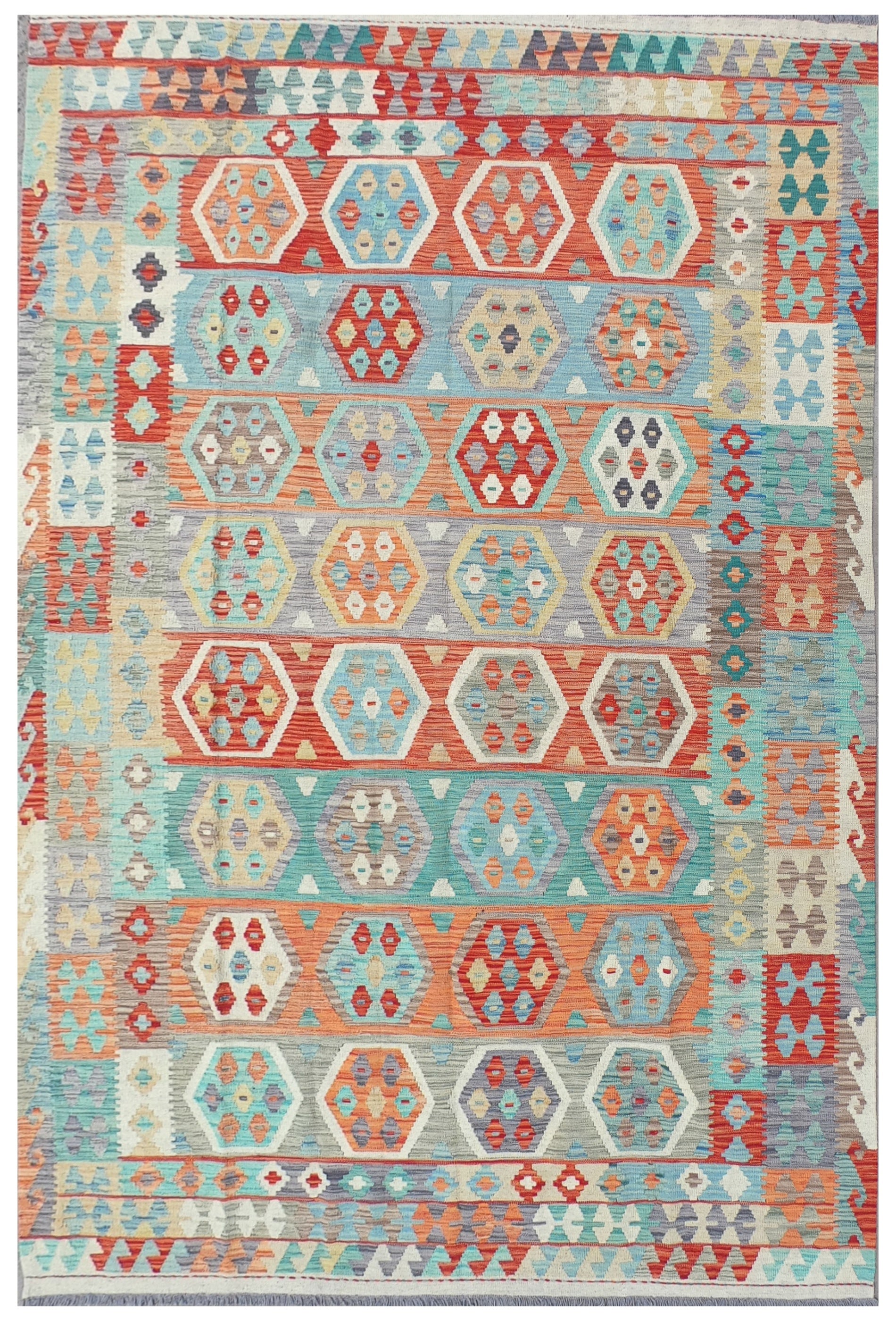 Alfombra de lana tejida en telar de origen Pakistaní, teñida con tintes naturales. Fabricada según la técnica tradicional de tejido de fisura. Esta alfombra se caracteriza por su tejido plano, diseños geométricos y gran colorido.