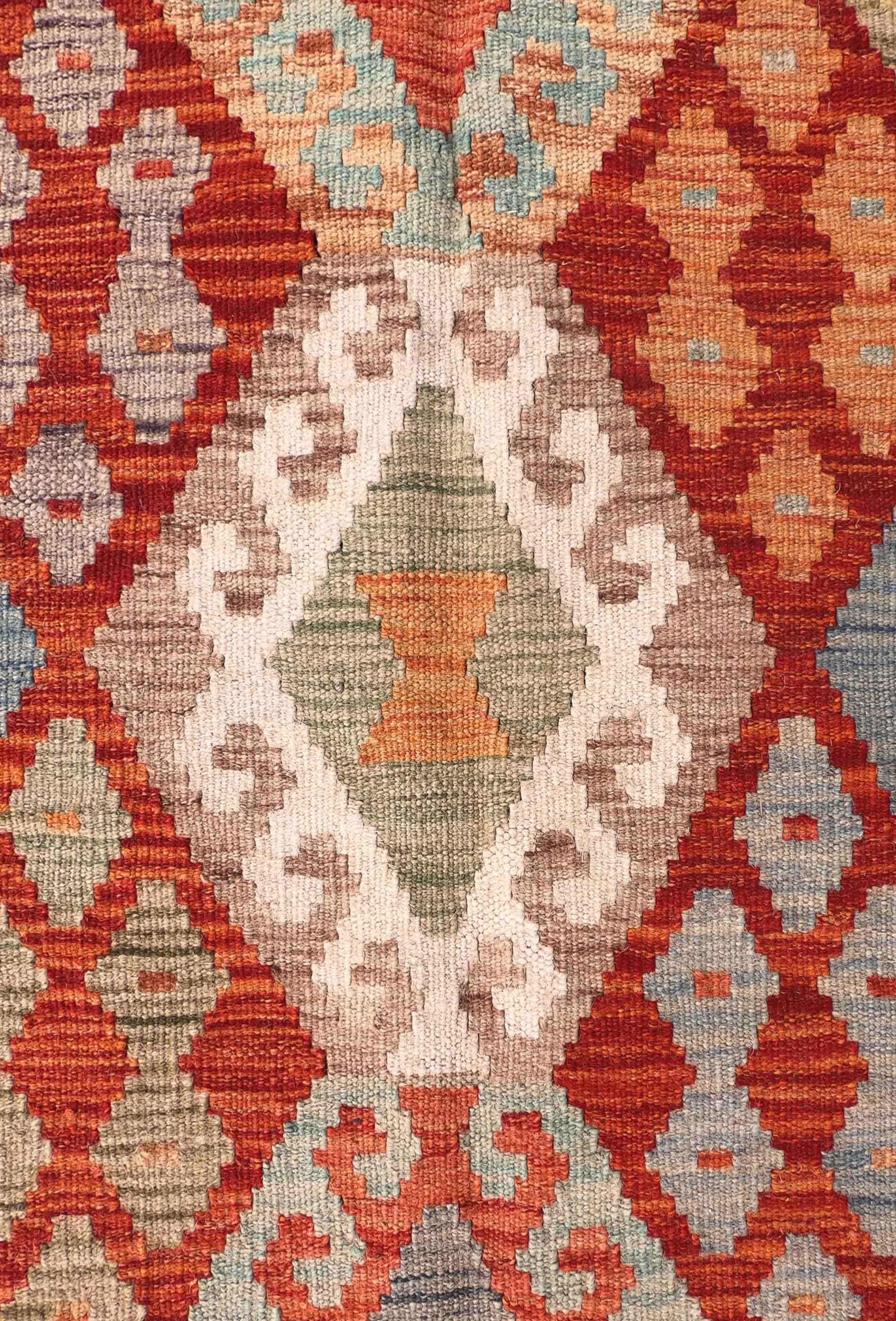 Alfombra de lana tejida en telar de origen Pakistaní, teñida con tintes naturales. Fabricada según la técnica tradicional de tejido de fisura. Esta alfombra se caracteriza por su tejido plano, diseños geométricos y gran colorido.