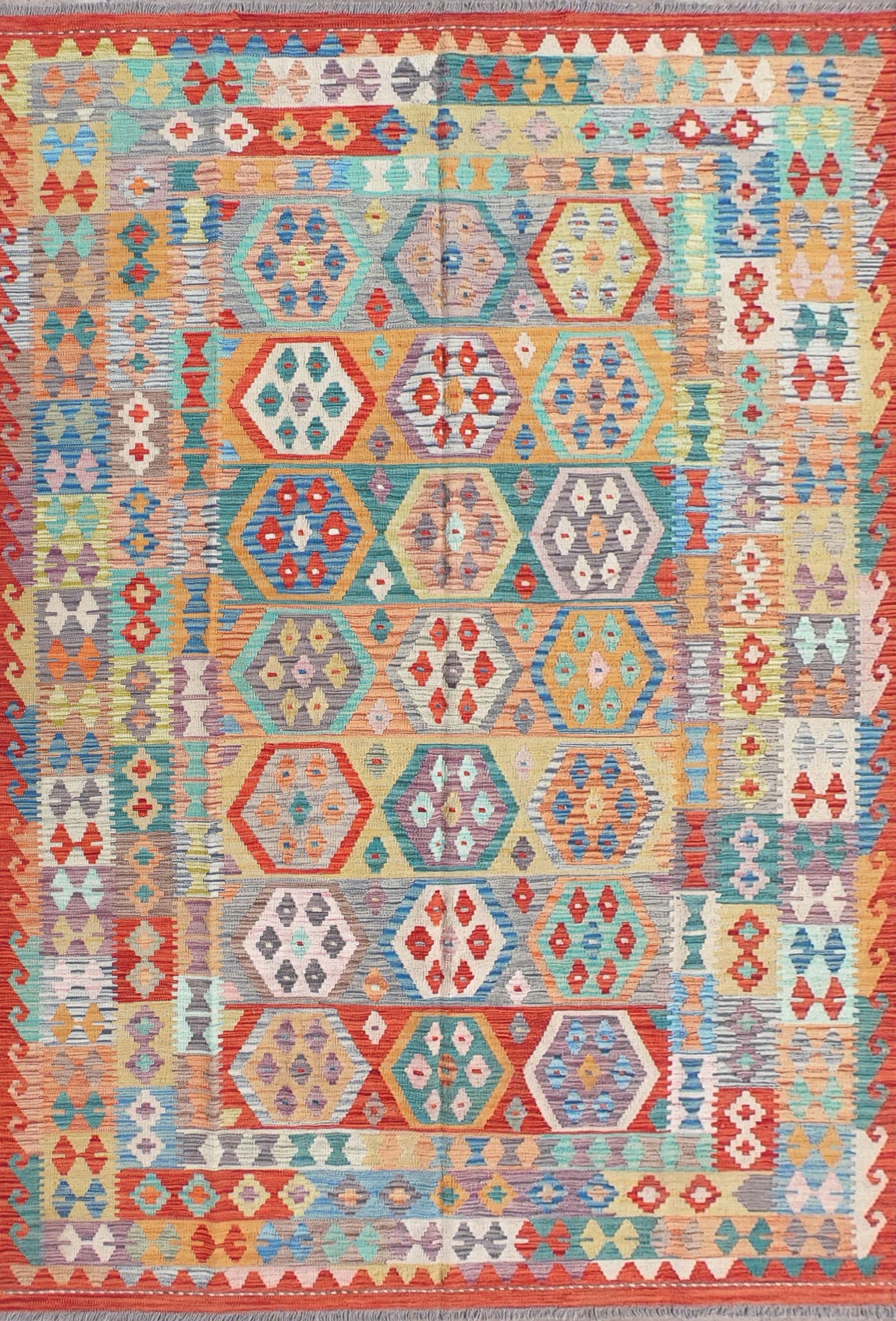 Alfombra de lana tejida en telar de origen Pakistaní, teñida con tintes naturales. Fabricada según la técnica tradicional de tejido de fisura. Esta alfombra se caracteriza por su tejido plano, diseños geométricos y gran colorido.