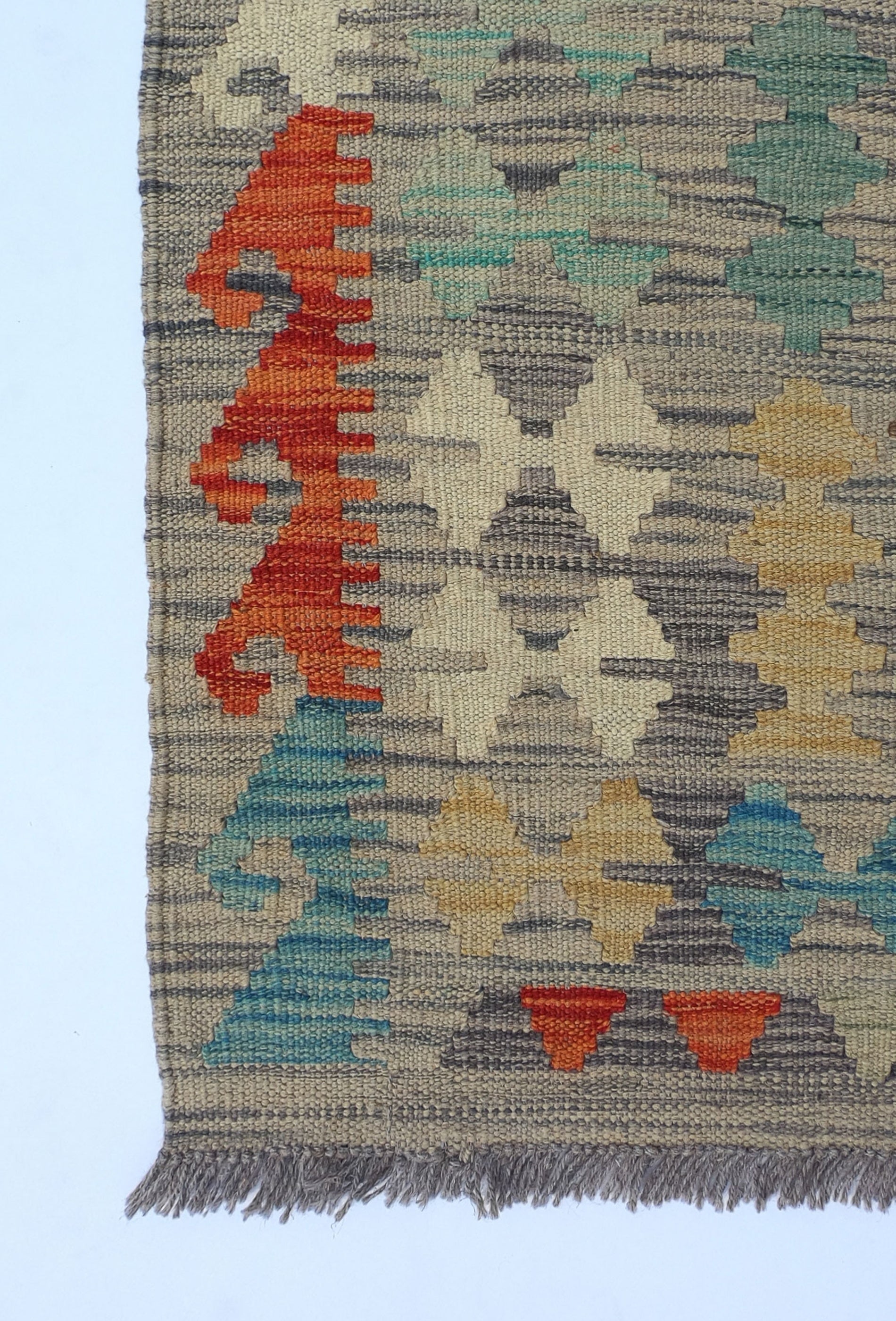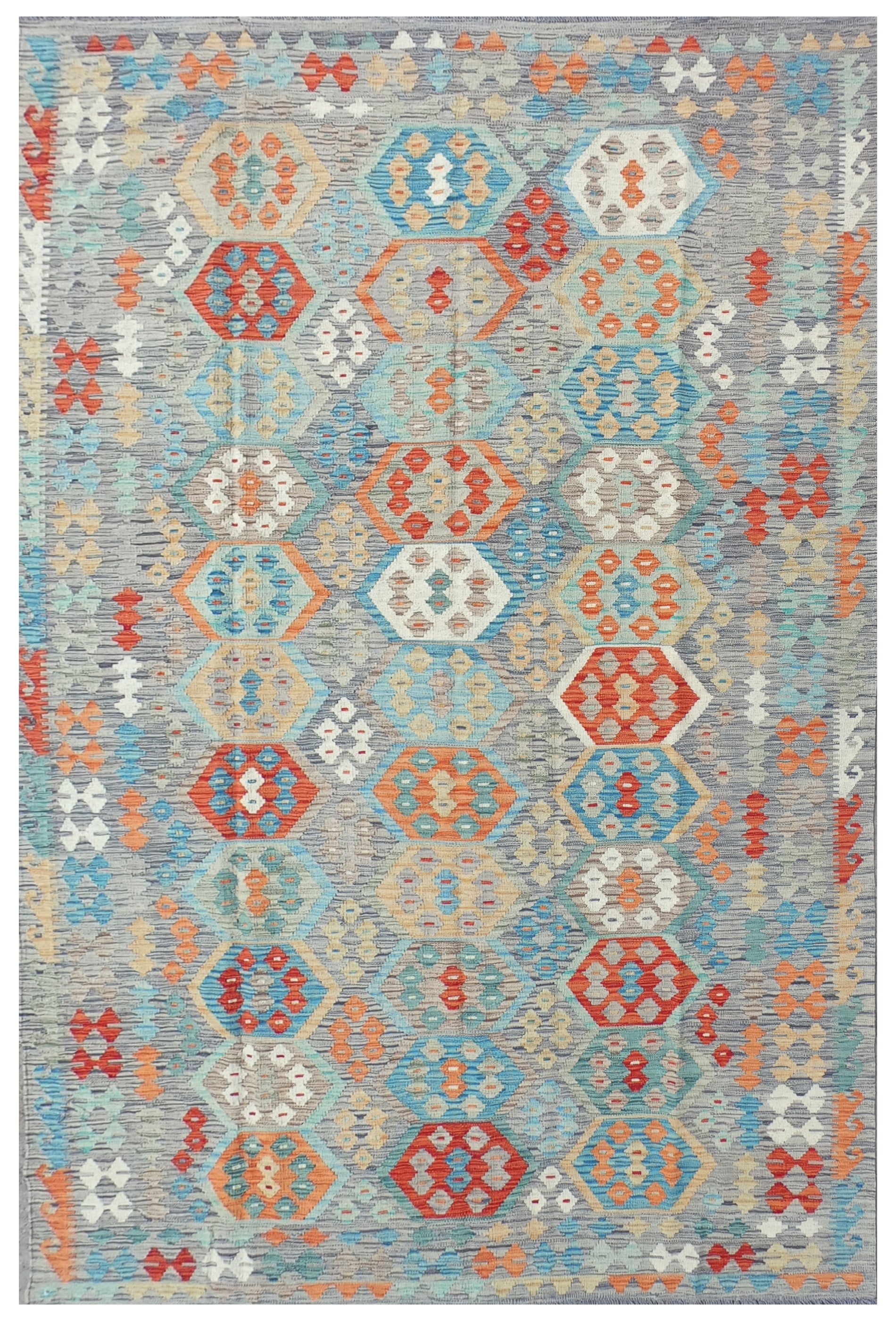 Alfombra de lana tejida en telar de origen Pakistaní, teñida con tintes naturales. Fabricada según la técnica tradicional de tejido de fisura. Esta alfombra se caracteriza por su tejido plano, diseños geométricos y gran colorido.