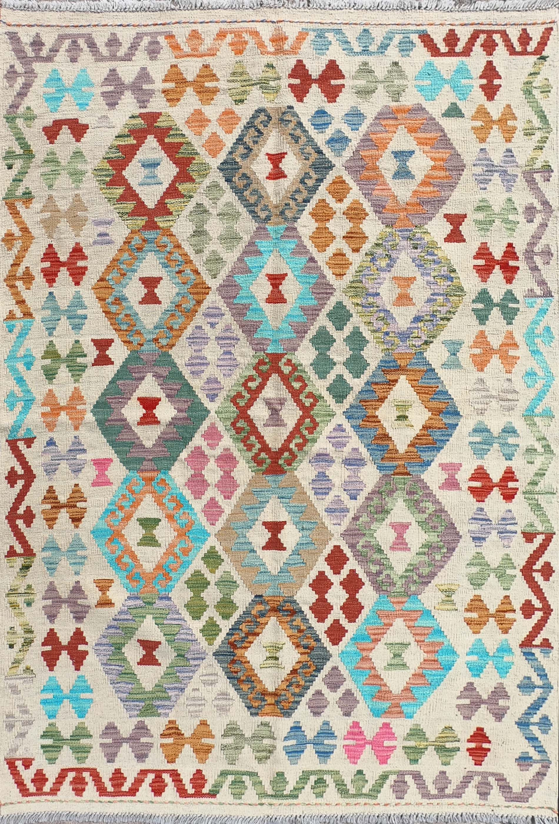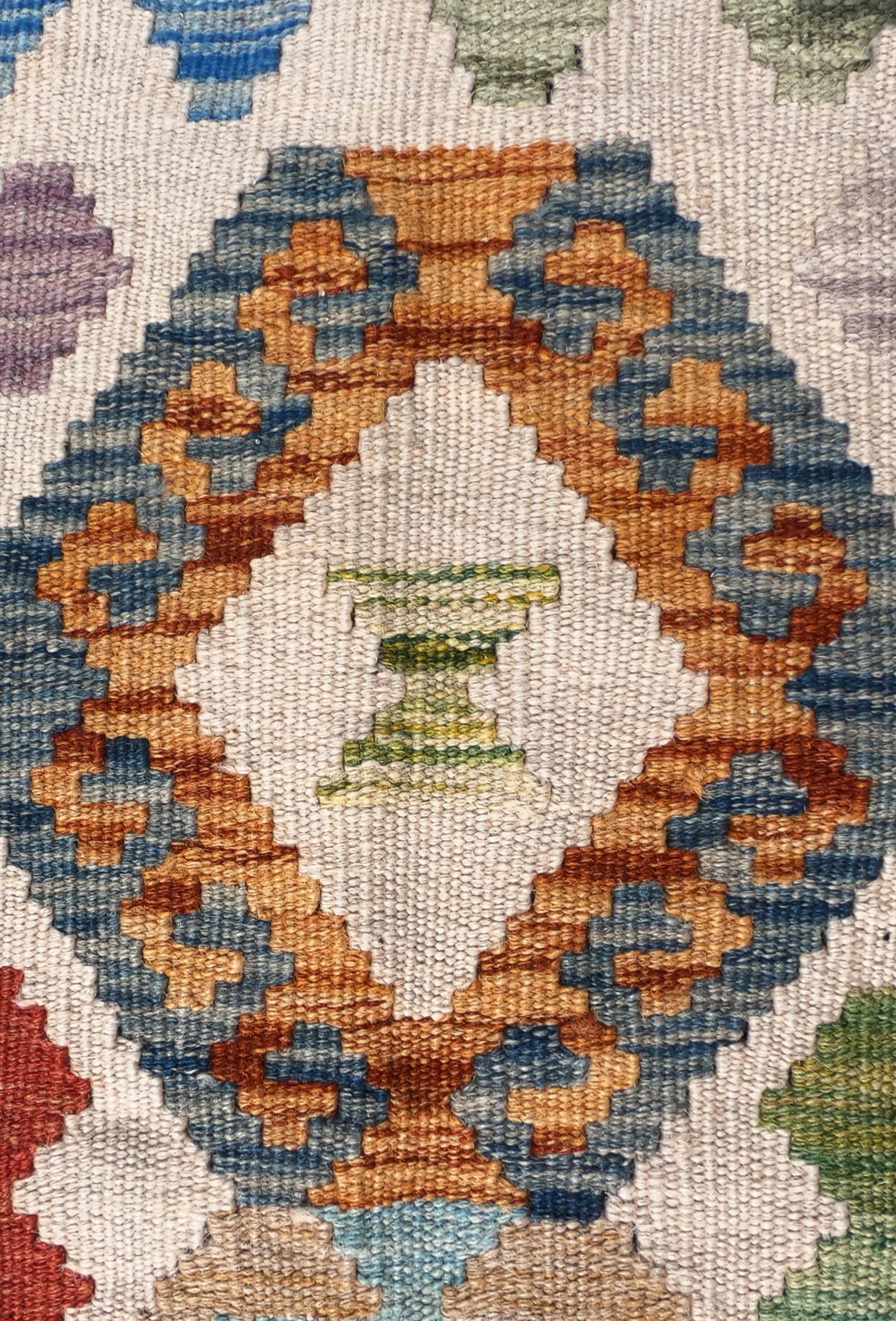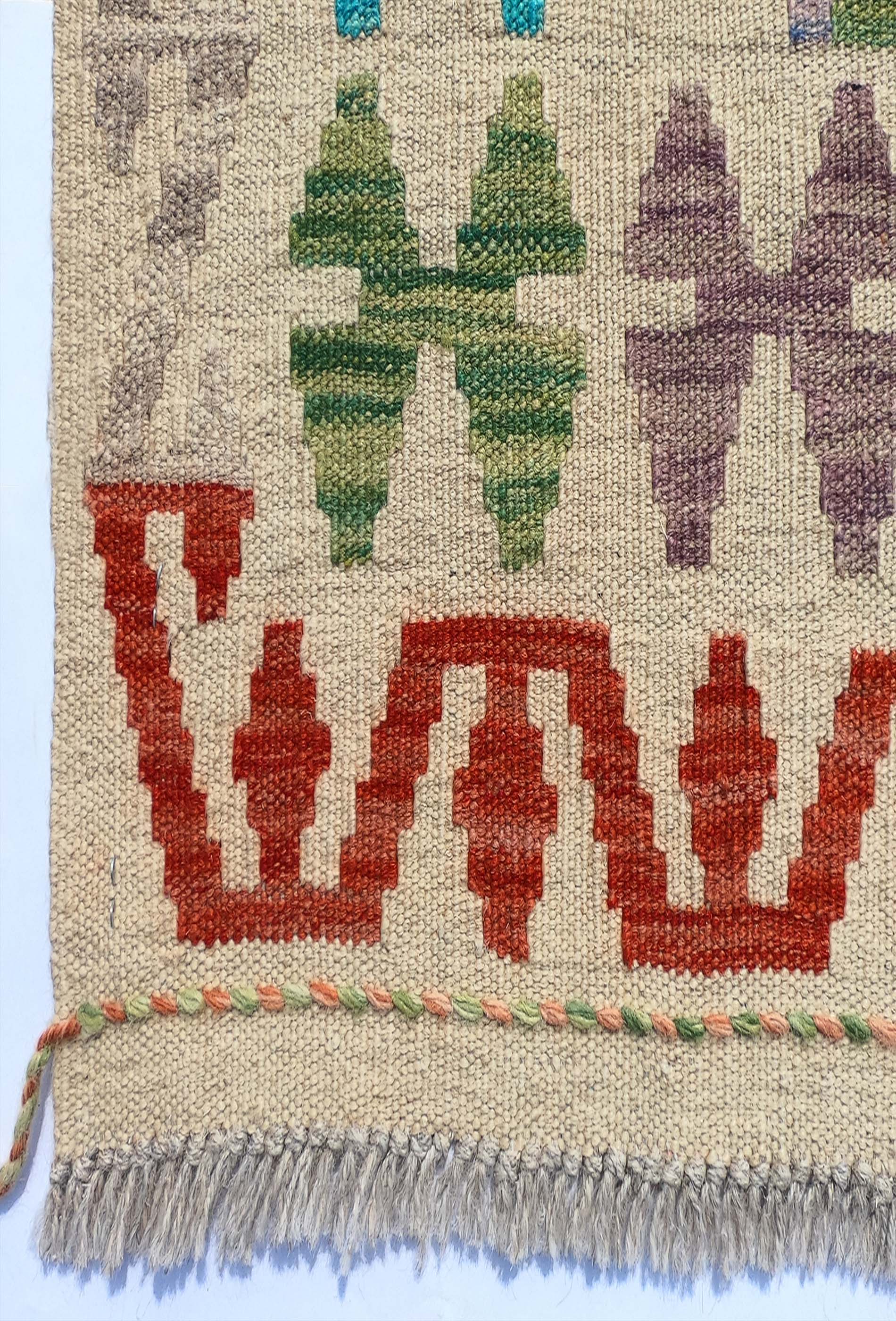 Alfombra de lana tejida en telar de origen Pakistaní, teñida con tintes naturales. Fabricada según la técnica tradicional de tejido de fisura. Esta alfombra se caracteriza por su tejido plano, diseños geométricos y gran colorido.