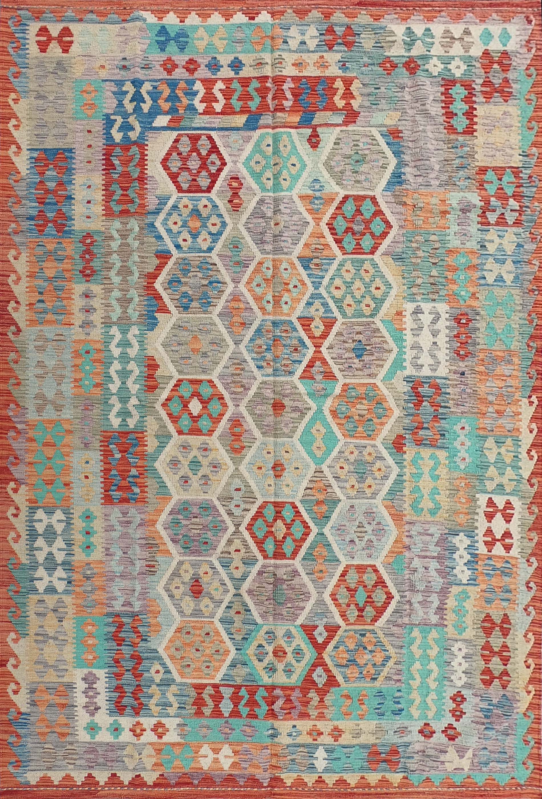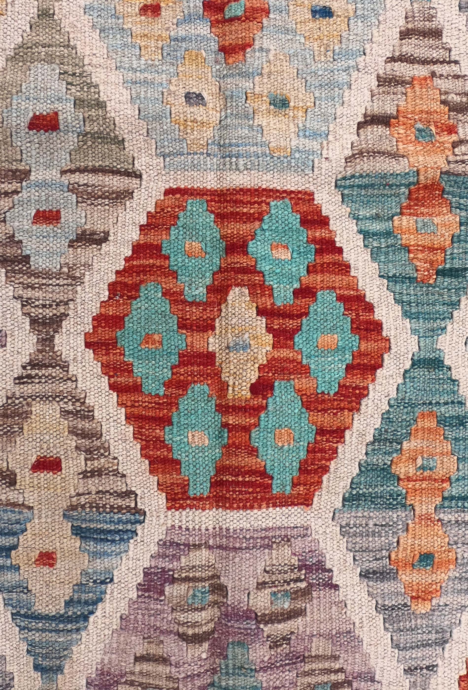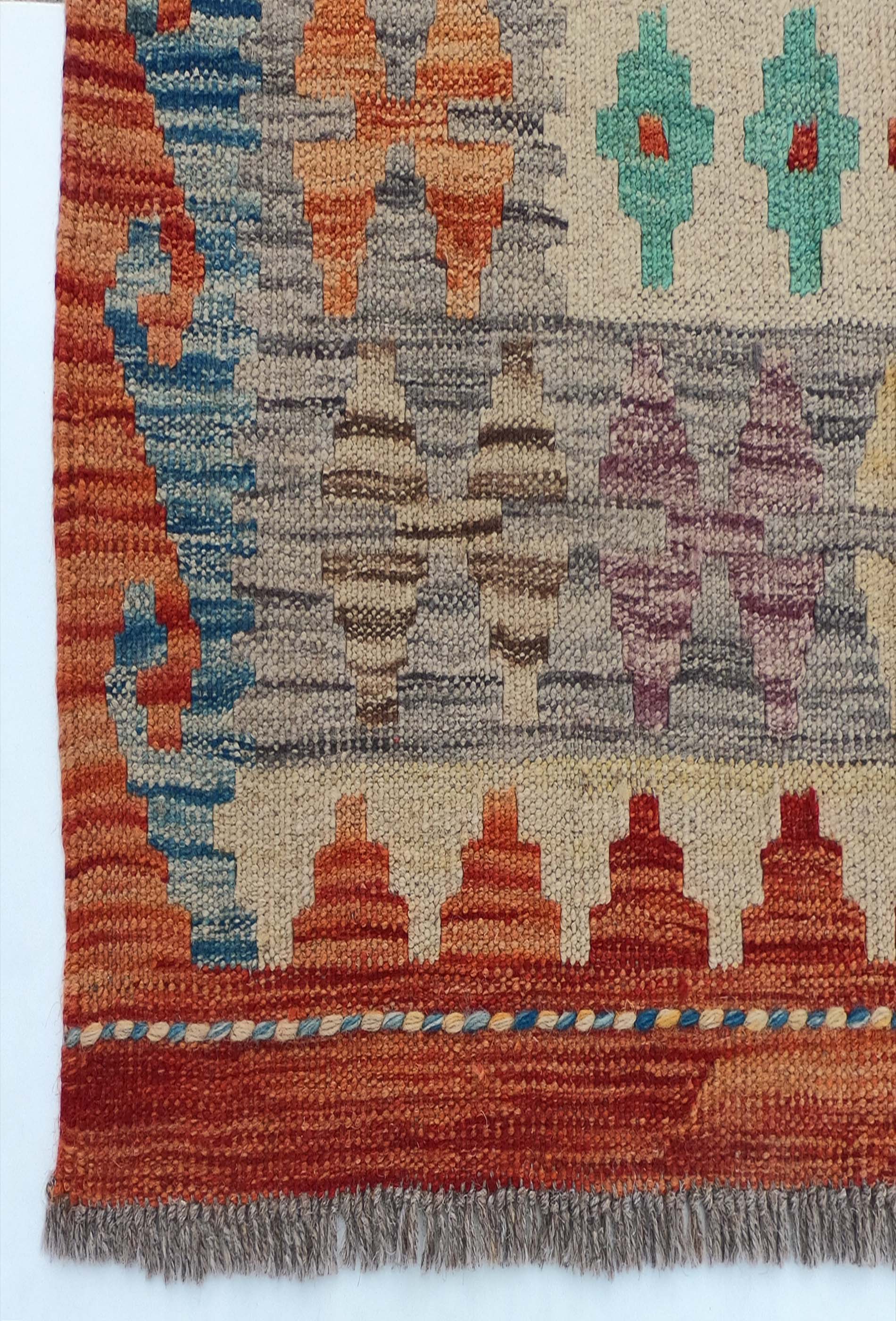 Alfombra de lana tejida en telar de origen Pakistaní, teñida con tintes naturales. Fabricada según la técnica tradicional de tejido de fisura. Esta alfombra se caracteriza por su tejido plano, diseños geométricos y gran colorido.
